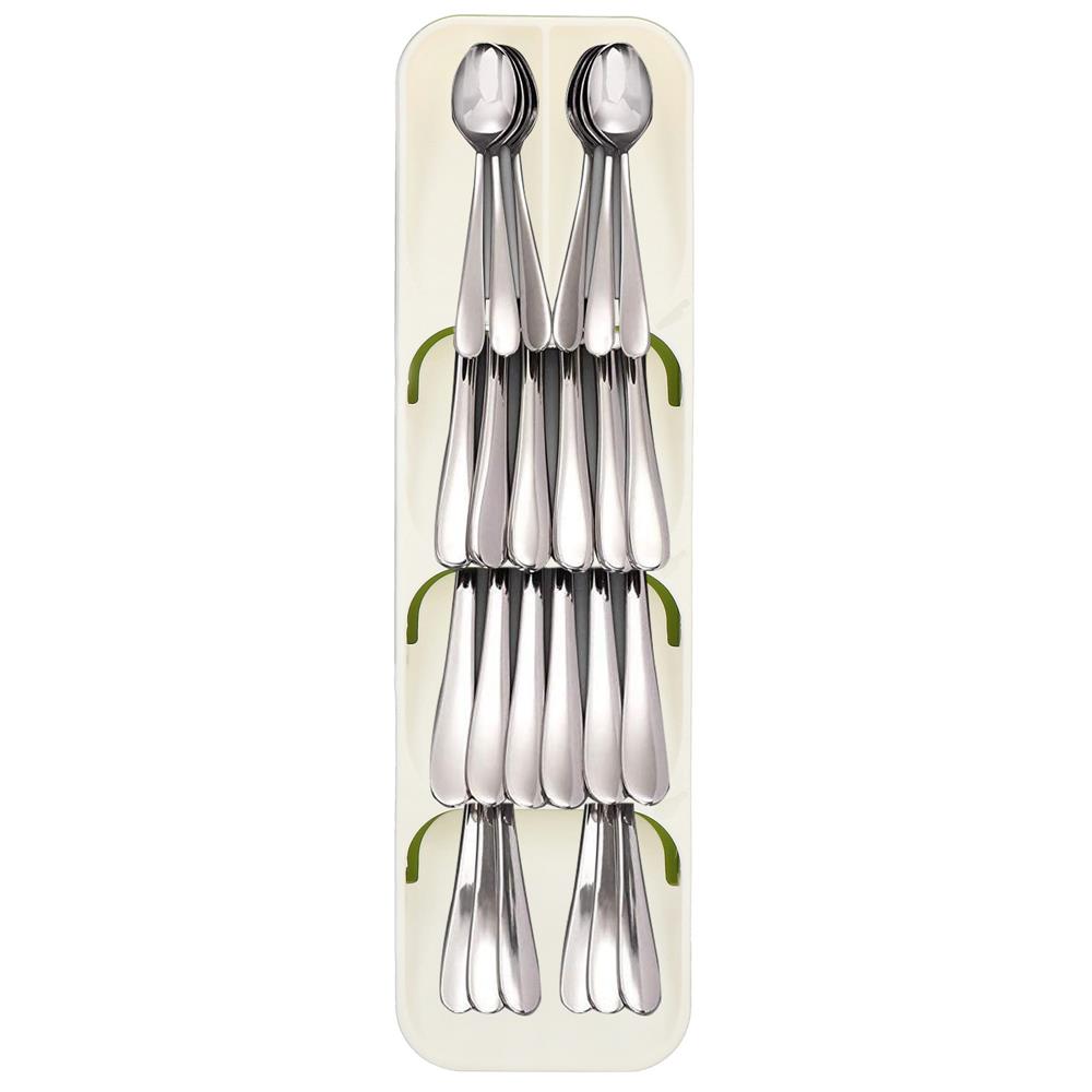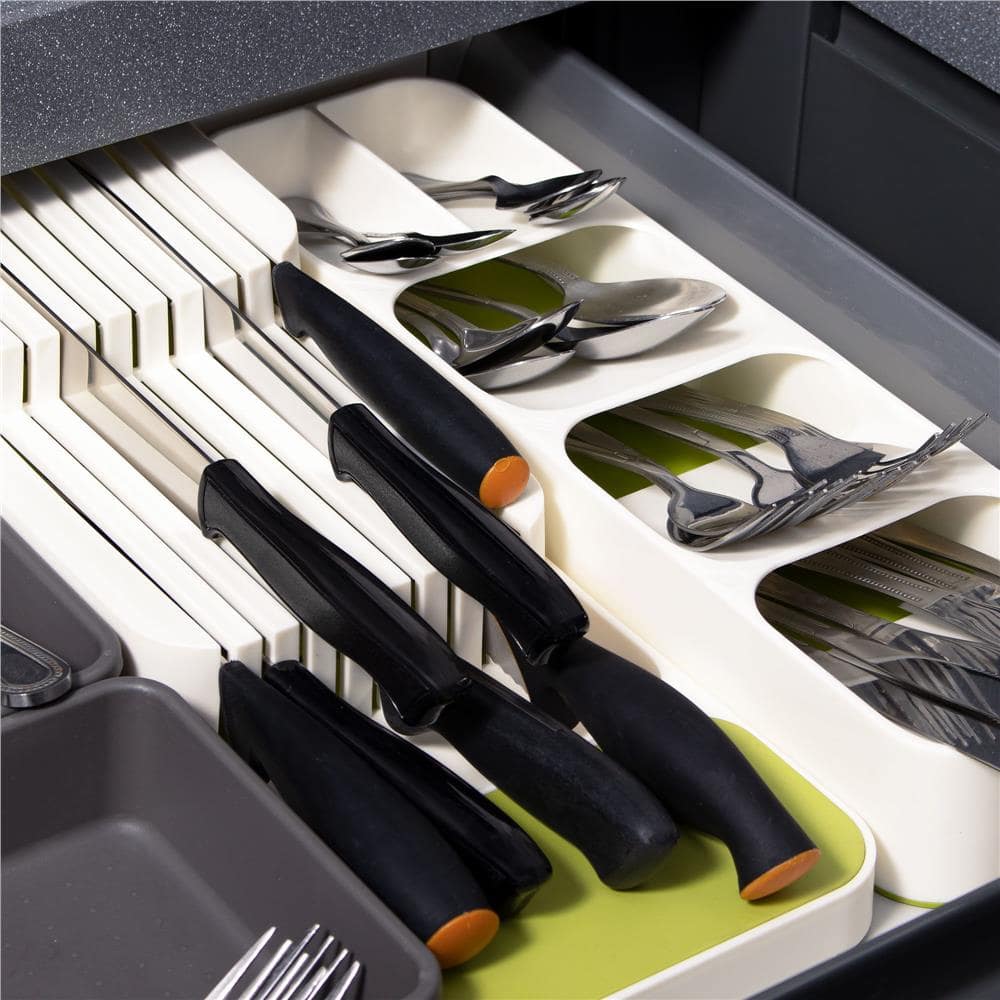- Organizatorul te va ajuta sa amenajezi cu usurinta spatiul dedicat tacamurilor. Un numar de compartimente selectat corespunzator il face un element indispensabil al echipamentelor de bucatarie. Organizatorul de tacamuri are 5 compartimente. Datorita acestui lucru, puteti aseza acolo linguri, lingurite, cutite si furculite. Avantajul sau suplimentar il reprezinta marcajele care faciliteaza organizarea spatiului pentru tacamuri. Este de remarcat faptul ca organizatorul va fi perfect atat intr-un sertar, cat si pe blatul de bucatarie. In interiorul sau, poate gazdui toate tacamurile pentru familie. Parametri: