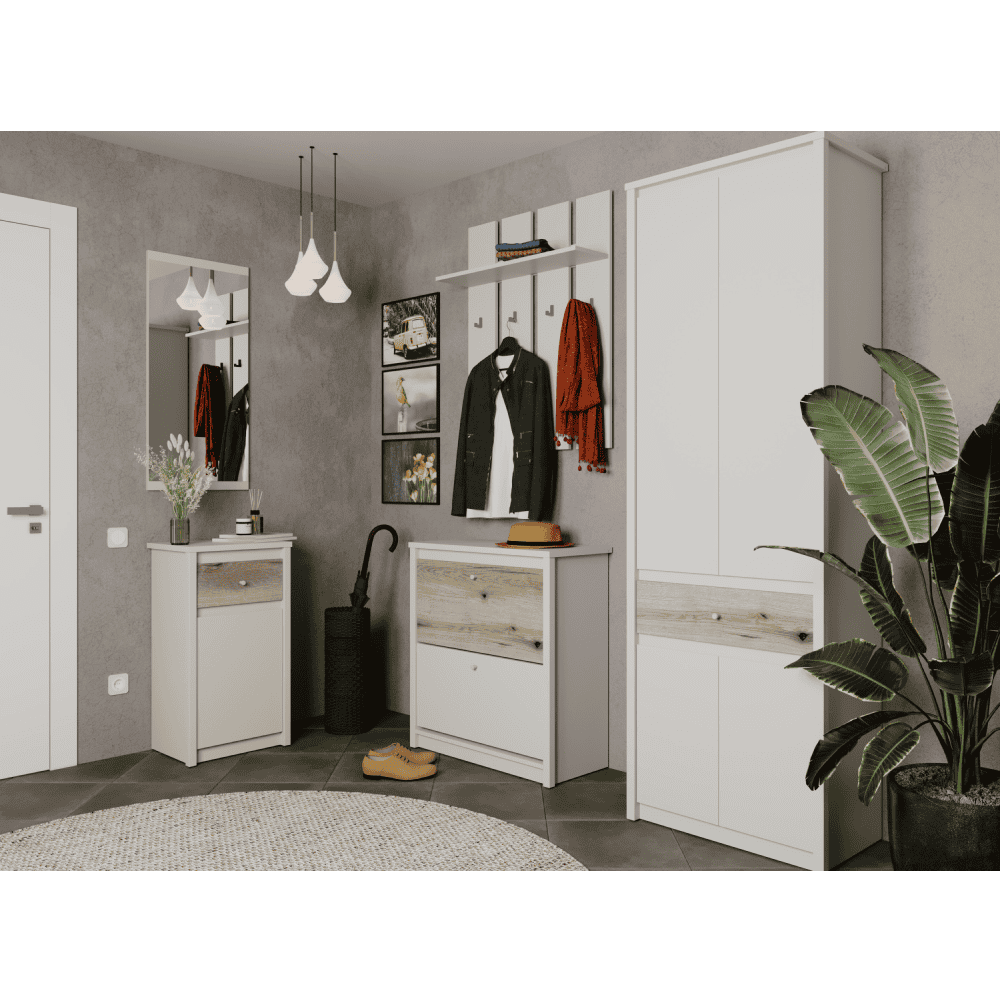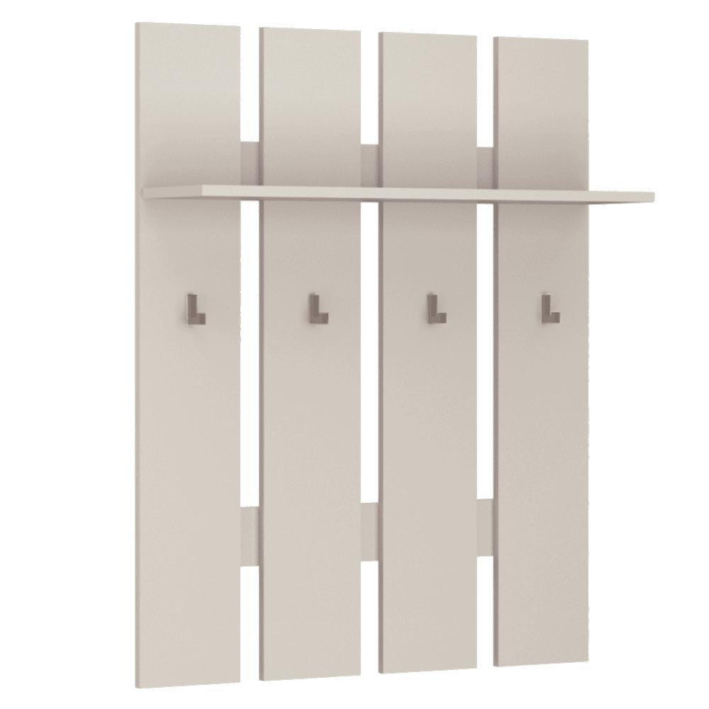 Material: DTD laminat Culoare: caşmir Dimensiuni (lxAxh): 80x23x100 cm Grosime material DTD: 1,6 cm Spaţiu de depozitare deschis Poliţă Portanţă poliţă: 3kg Patru cârlige Materialul cârligului: plastic Culoarea cârligului: caşmir Portanţă cârlig: 3 kg Picioare din plastic Vă recomandăm să ataşaţi mobilierul de perete Design modern Livrat dezasamblat