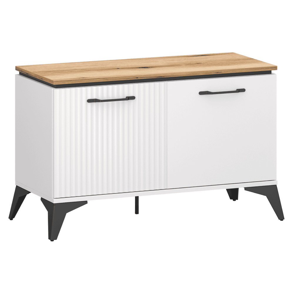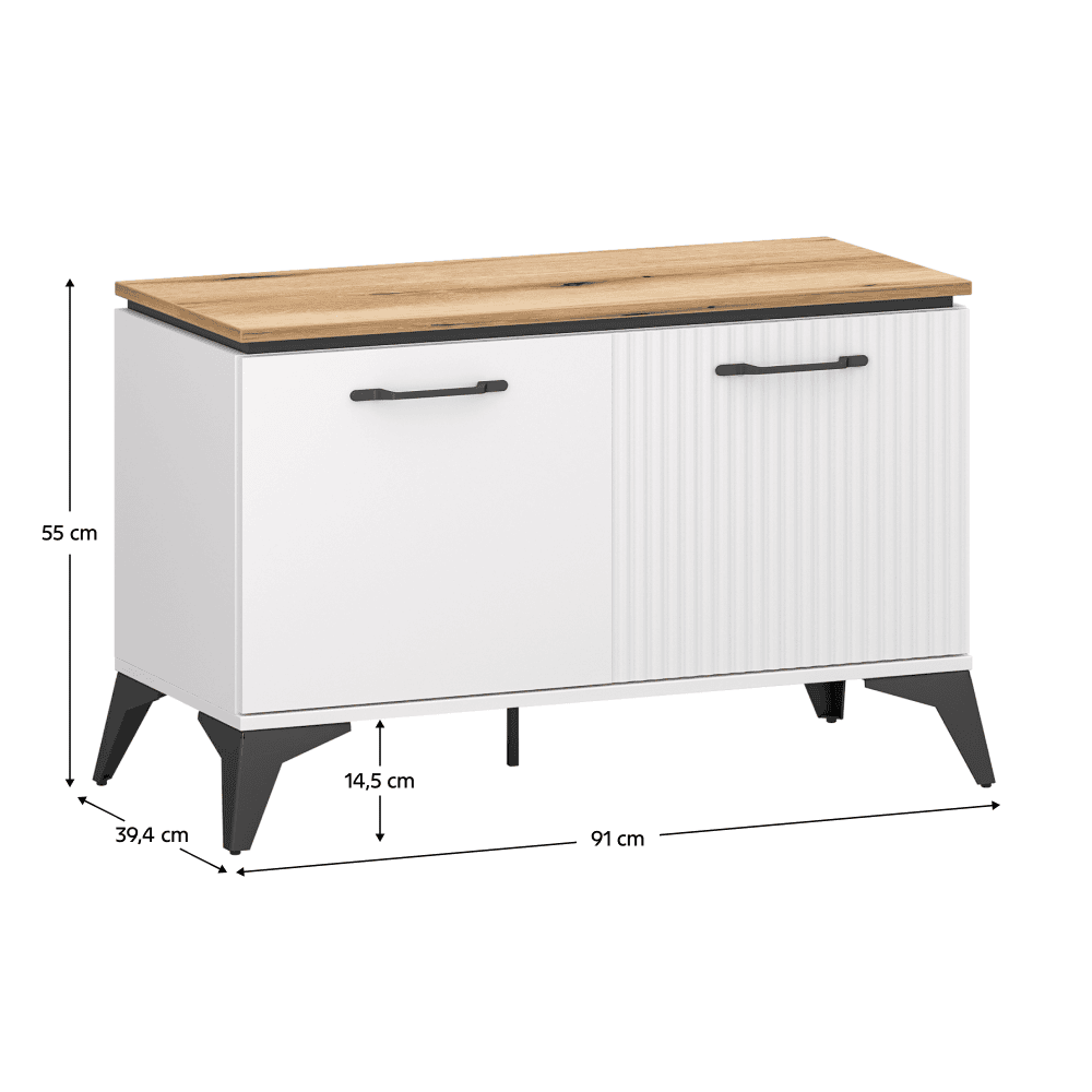 Material: DTD laminat/MDF înfoliat/PVC Culoare: alb/stejar evoke Dimensiuni (lxAxh): 91×39,4×55 cm Grosime material: 1,6 cm Cu două uşi Spaţiu de depozitare Cu poliţă Portanţă poliţă: 5 kg Portanţă placă inferioară: 10 kg Mânere metalice Culoare mânere: neagră Pe picioare Culoare picioare: negre Înălţime picioare: 14,5 cm Picior de sprijin central Uşă frezată decorativ Design modern Recomandăm fixarea de perete Livrată dezasamblată