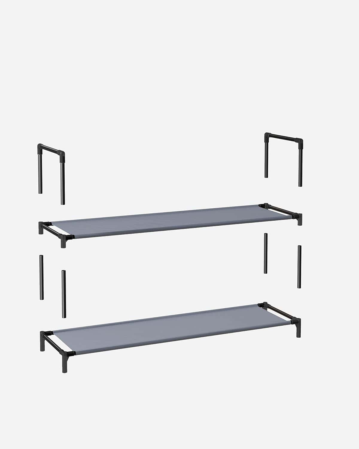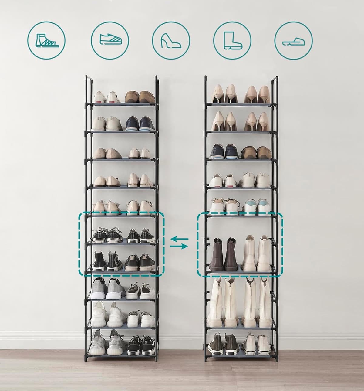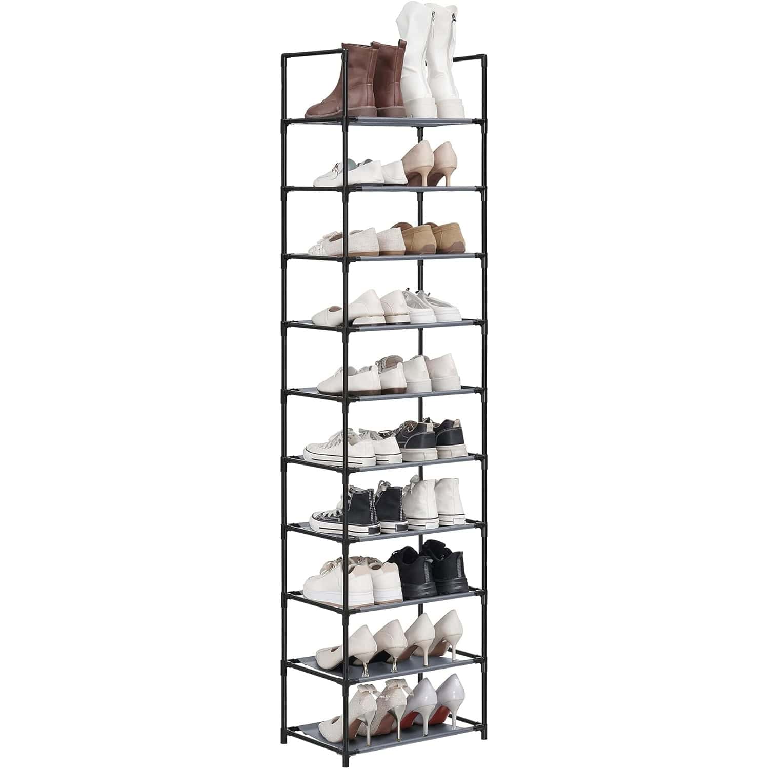 Pantofar cu 10 niveluri, cadru metalic si rafturi textile, 28x45x173 cm, gri Mob360
