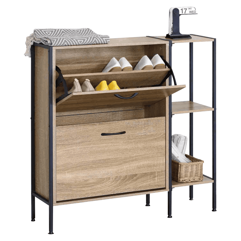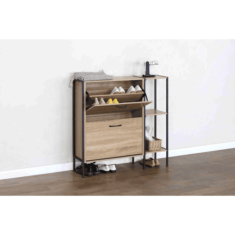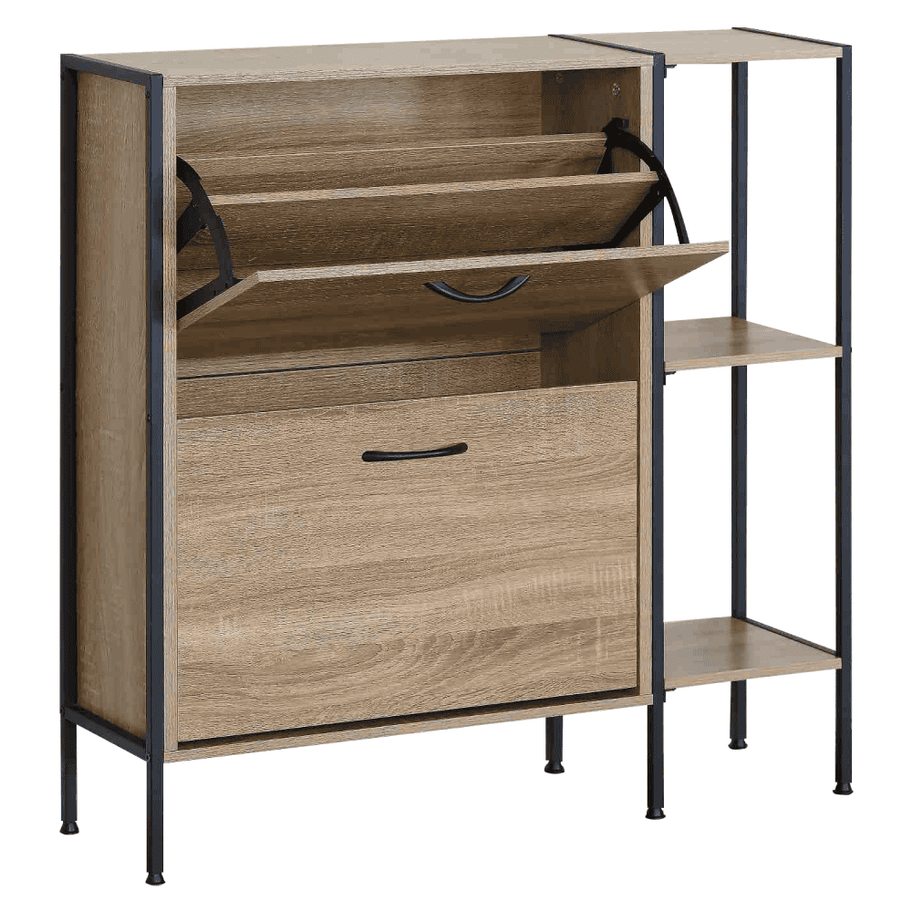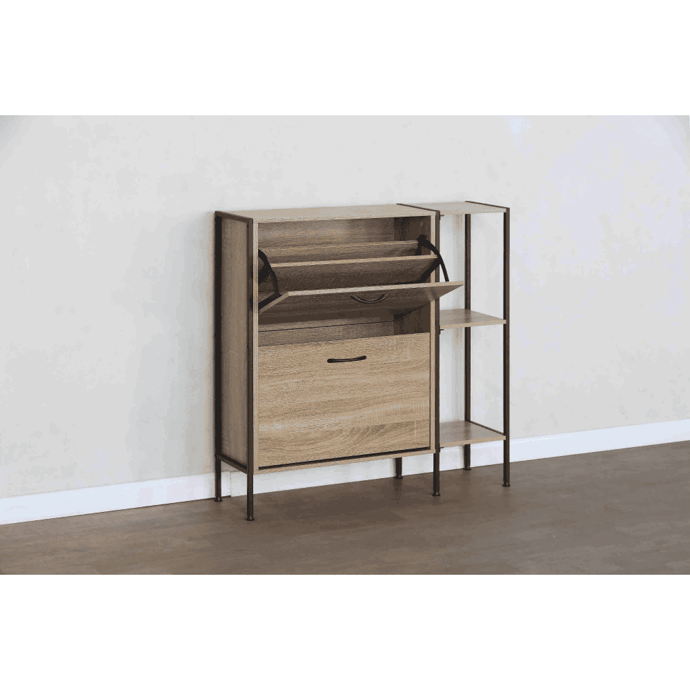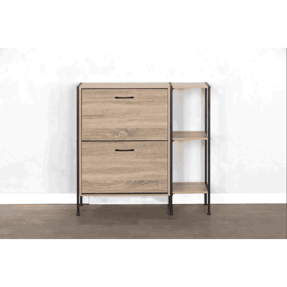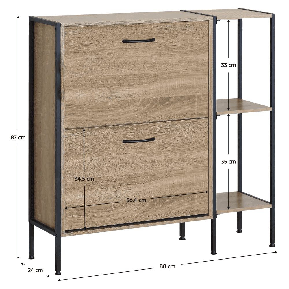 Material: PAL/oţel/plastic Culoare: stejar/negru Dimensiuni (lxAxh): 88x24x87 cm Grosime material: 1,2-1,5 cm Pe picioare Două sertare rabatabile Sertar împărţit în 2 părţi Dimensiuni sertar basculabil (lxh): 56,4×34,5 cm Portanţa sertarului basculabil: 6 kg Poliţe Portanţa blatului superior: 10 kg Design modern Practic Livrat dezasamblat