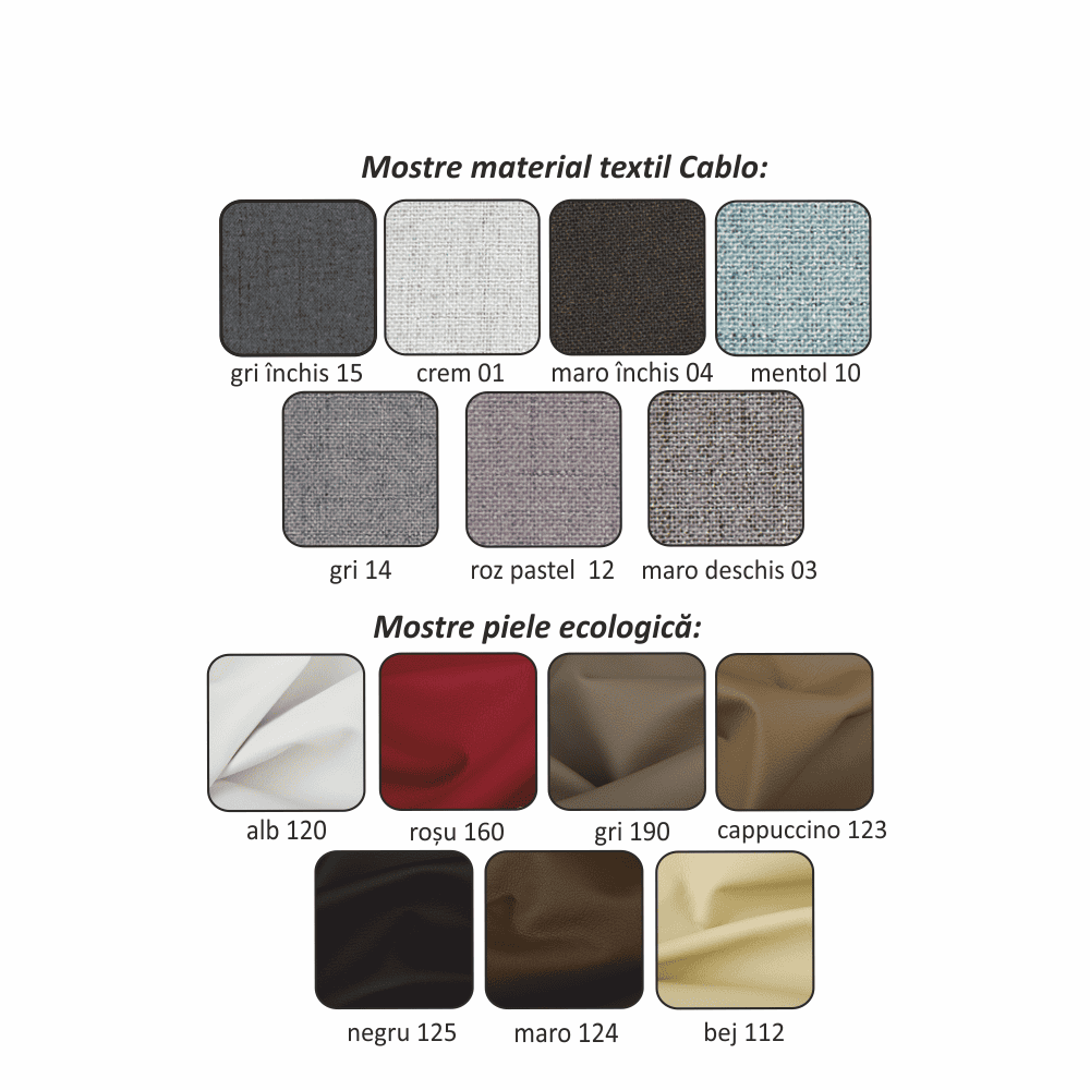 Posibilitatea de a comanda în 7 nuanţe a materialului textil Cablo sau în 7 nuanţe a pielii ecologice din modelele afişate. Pentru o comandă individuală, este necesar să plătiţi un avans de 20% din sumă. După achitarea avansului, comanda dvs. va fi dată în producţie. Timpul de livrare este de 6-8 săptămâni.