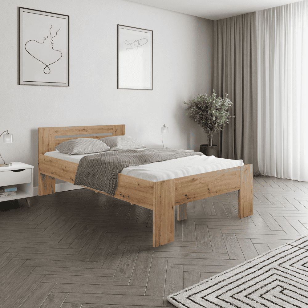 Material: DTD laminat/margini ABS Culoare: stejar artisan Dimensiuni (lxAxh): 125×203,6×75,5 cm Suprafaţa pentru dormit (lxL): 120×200 cm Grosime DTD laminat: 1,6-1,8 kg Picioare din metal Înălţimea compartimentului inferior de la podea: 25,1 cm glisoare din plastic Înălţimea glisoarelor din plastic: 0,5 cm Înălţimea lateralei: 19,8 cm Înălţimea minimă recomandată a saltelei: 15 cm Încastrarea saltelei: 11 cm Portanţă: 100 kg Pat single Livrat fără somieră şi saltea Vă recomandăm să achiziţionaţi somieră cu cadru solid şi o saltea din oferta noastră Design modern Livrat dezasamblat