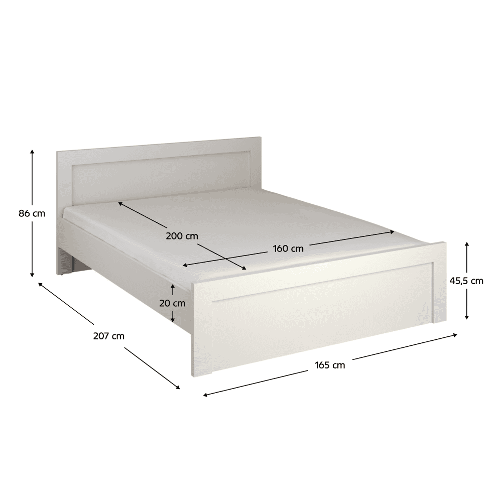 Material: DTD laminat Culoare: caşmir Dimensiuni (lxAxh): 165x207x86 cm Grosimea materialului DTD: 1,6-3,2 cm Suprafaţa pentru dormit (lxL): 160×200 cm Portanţă pe persoană: 90 kg Înălţime până la somieră: 32 cm Livrat fără somieră şi saltea Opţiune de achiziţionare a unei somiere şi a unei saltele roluită din oferta noastră Încastrarea saltelei: 8 cm Înălţimea minimă recomandată a saltelei: 10 kg Design modern Livrat dezasamblat