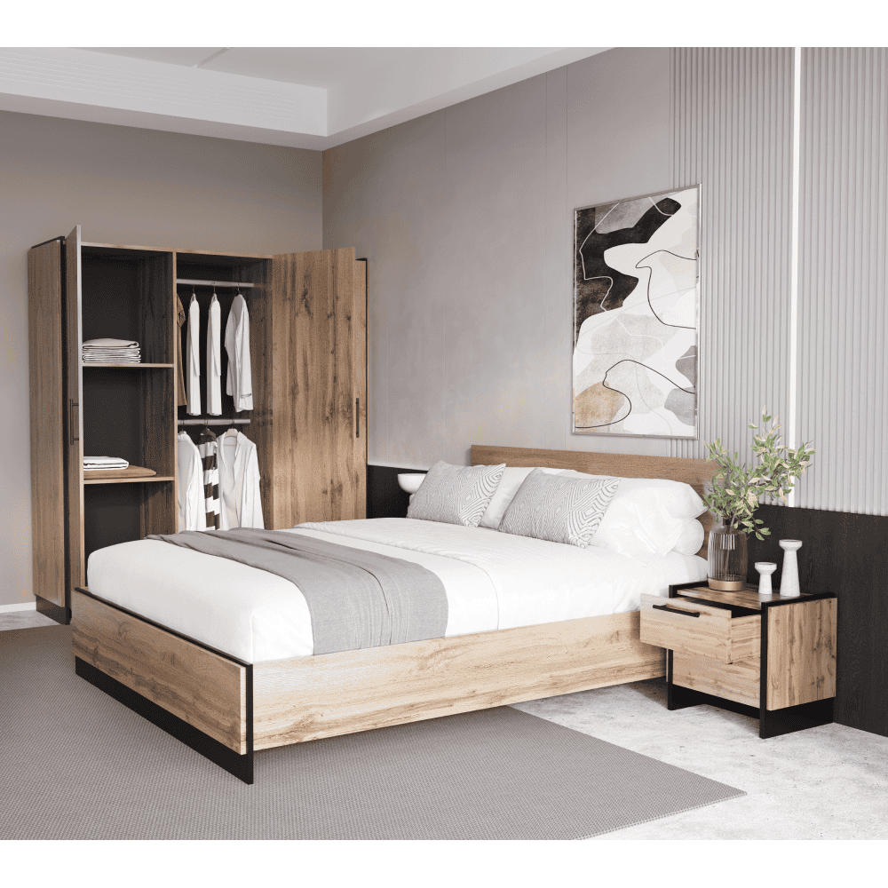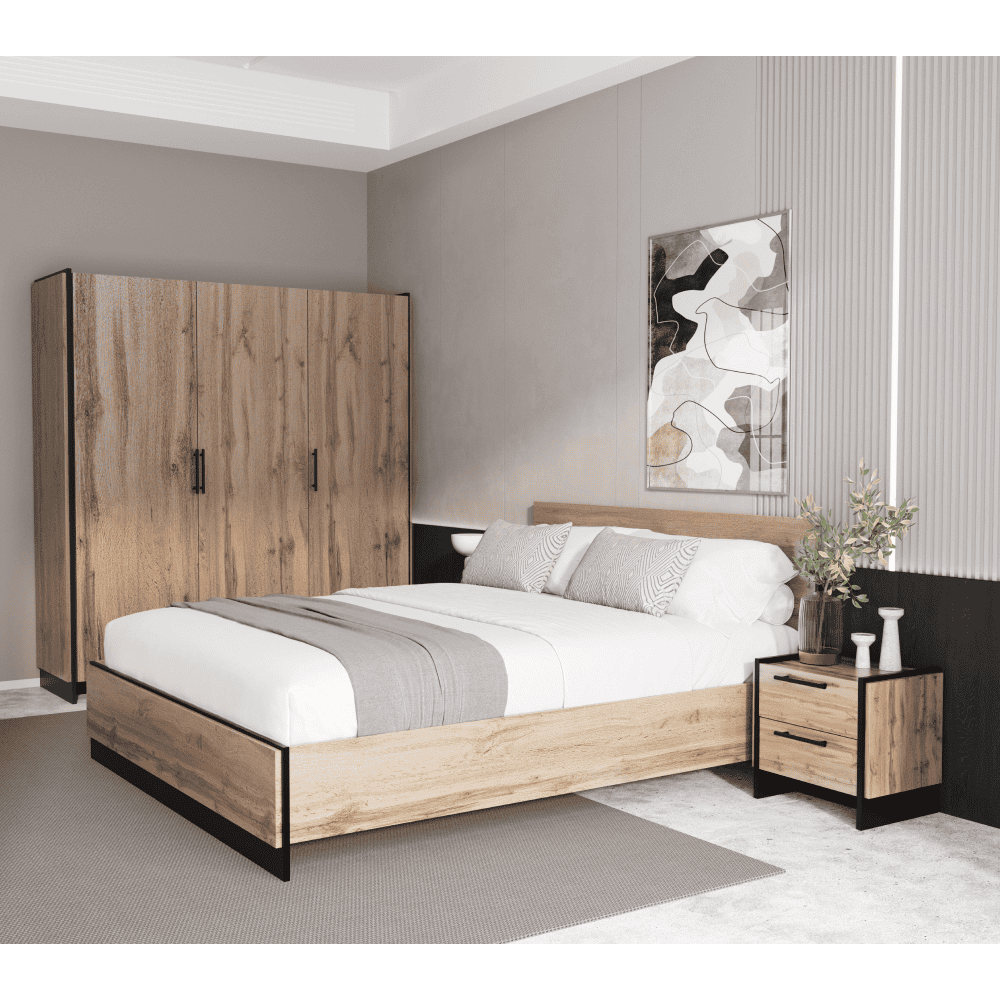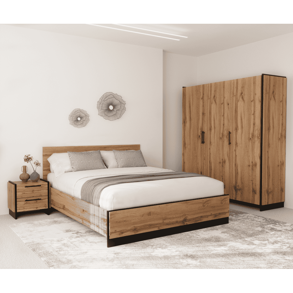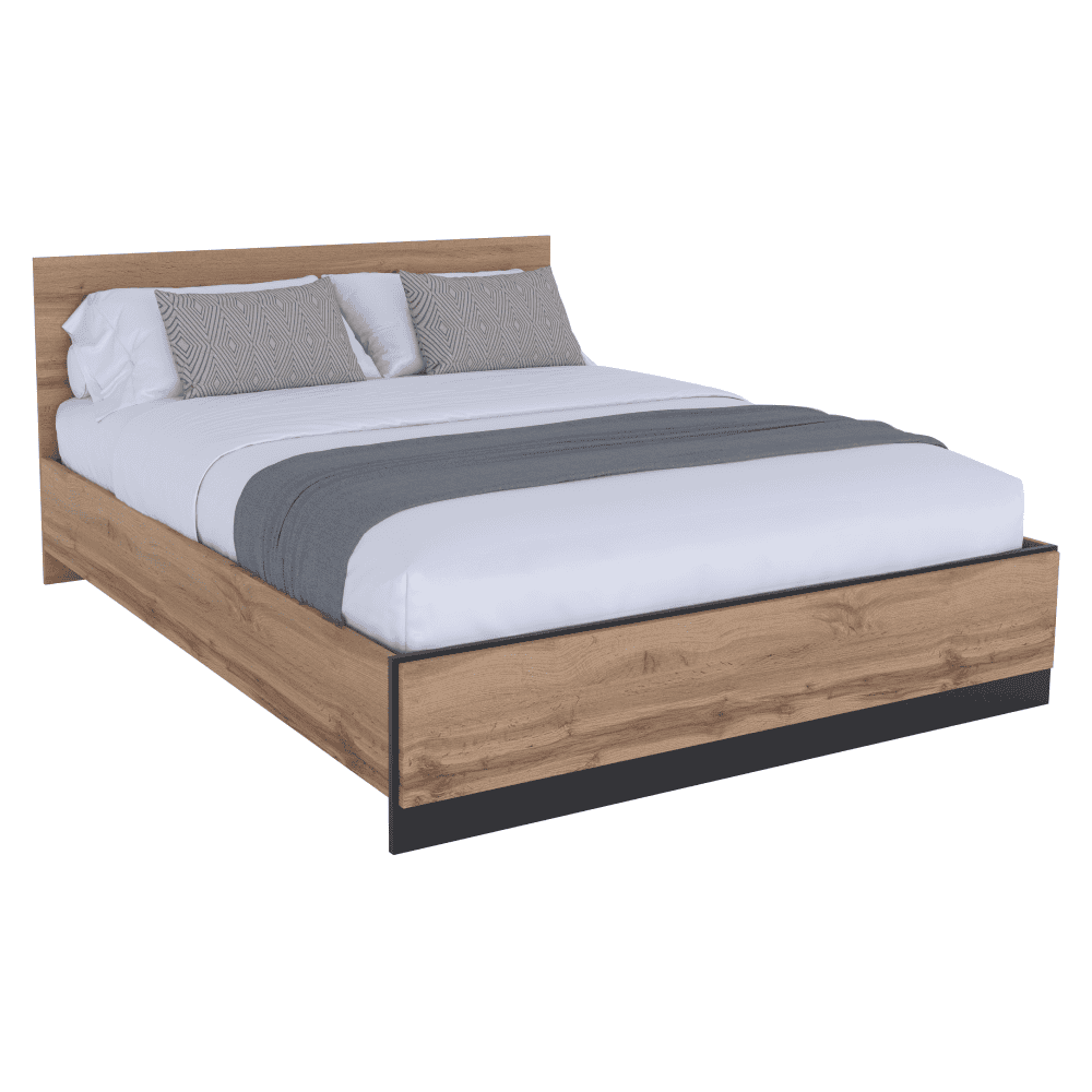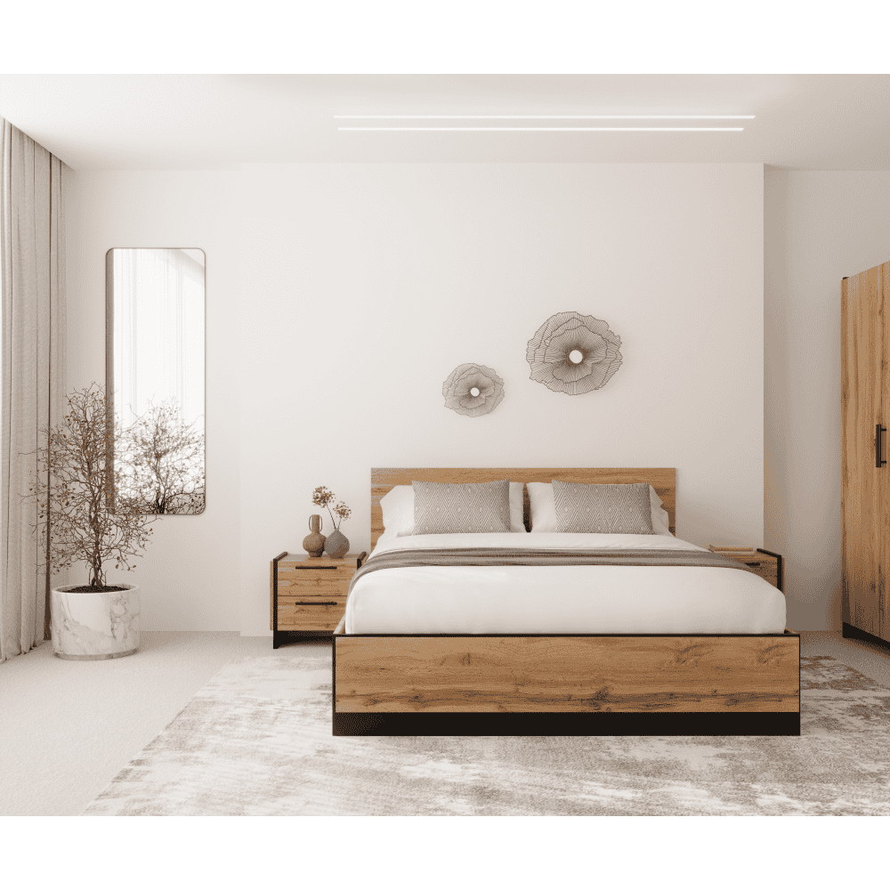 Material: DTD laminat/margini ABS Culoare: stejar wotan/negru Dimensiuni (Lxlxh): 164x204x90 cm Suprafaţa pentru dormit (Lxl): 160×200 cm Grosime material: 1,6 cm Portanţă pe persoană: 90 cm Înălţimea lateralei: 35,6 cm Livrat fără saltea Opţiunea de a cumpăra o saltea suplimentară din oferta noastră Înălţimea minimă recomandată a saltelei: 16 cm Livrat fără saltea şi somieră Opţiunea de a achiziţiona somieră din oferta noastră DTD dublu laminat Picioare de plastic Livrat dezasamblat