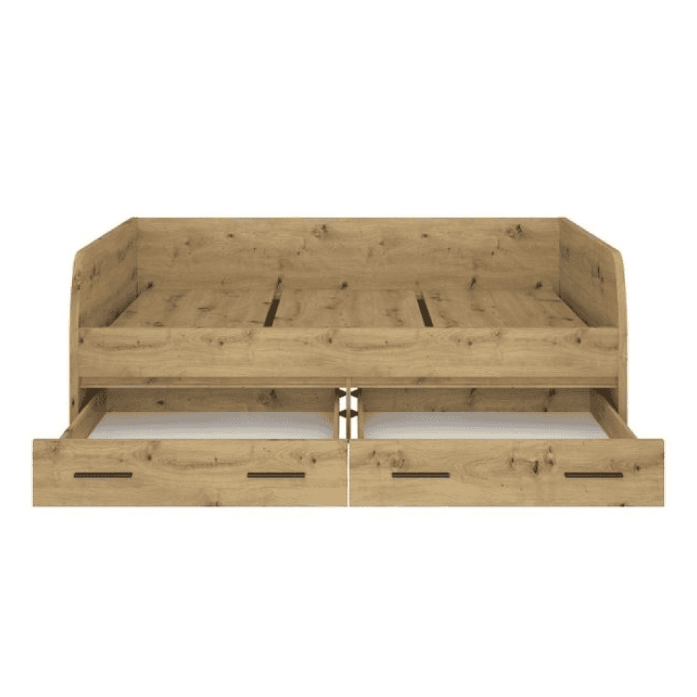Material: PAL melaminat / margini ABS Culoare: stejar Artisan Dimensiuni (LxAxÎ): 94,4×206,4×71 cm Grosimea materialului: 1,6-3,2 cm Dimensiuni suprafaţă de dormit (LxL): 90×200 cm Înălţimea recomandată a saltelei: 7,2 cm Cu spaţiu de depozitare Două sertare Înălţime sertar: 20,8 cm Capacitate de susţinere per persoană: 100 cm Furnizat cu somieră Somieră din 3 plăci Furnizat fără saltea Opţiunea de a cumpăra o saltea din oferta noastră Picioare din plastic Design modern Livrat dezasamblat