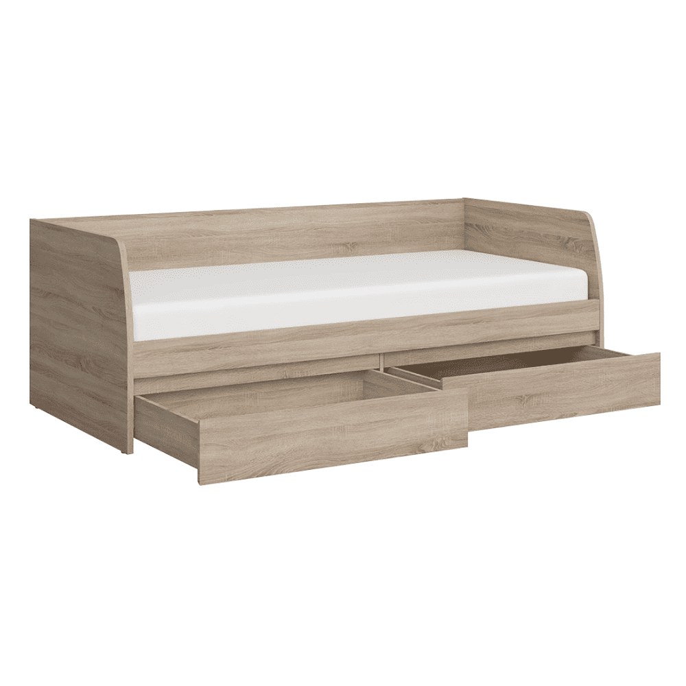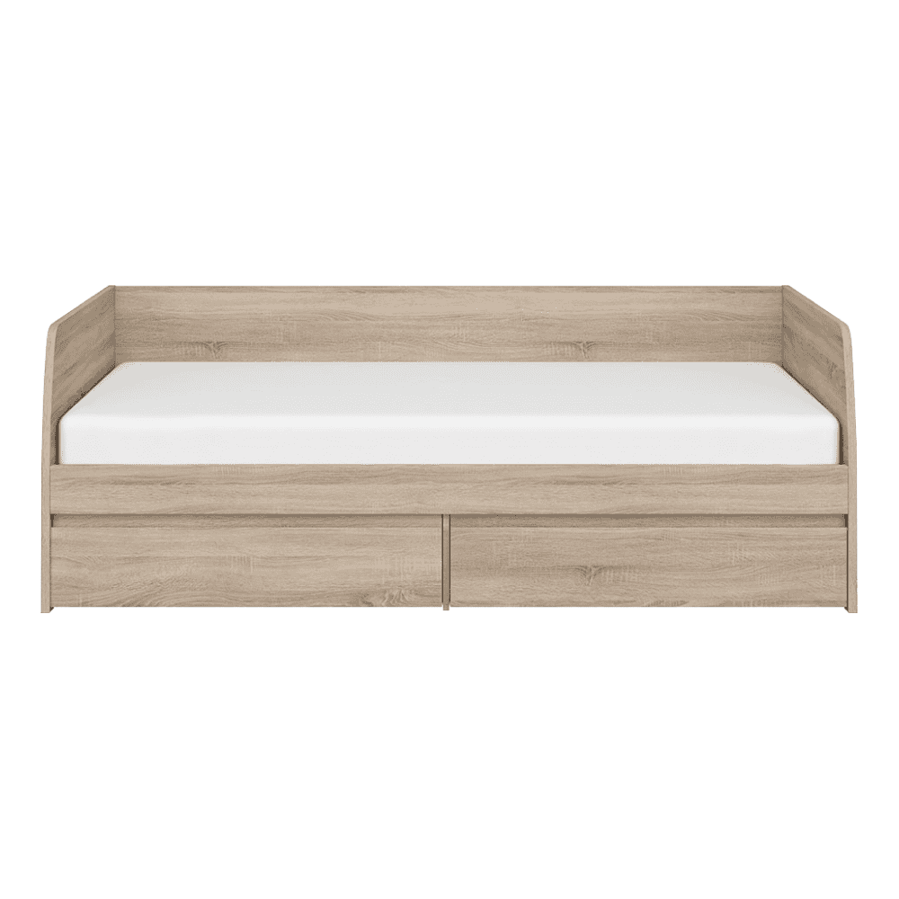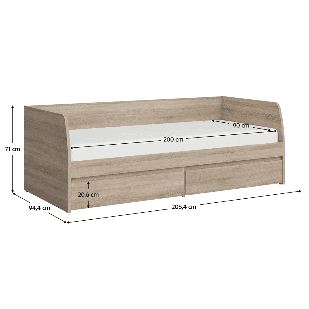 Material: DTD melaminat Culoare: stejar sonoma Dimensiuni (Lxlxh): 94,4×206,4×71 cm Grosimea materialului: 3,2 cm Grosimea materialului celelalte părţi: 1,6 cm Dimensiuni suprafaţă de dormit (Lxl): 90×200 cm Înălţimea minimă recomandată a saltelei: 7,2 cm Cu spaţiu de depozitare Două sertare Înălţime sertar: 20,6 cm Portanţa per persoană: 90 kg Livrat cu somieră 3 plăci de somieră Livrat fără saltea Opţiunea de a cumpăra o saltea din oferta noastră Livrat dezasamblat