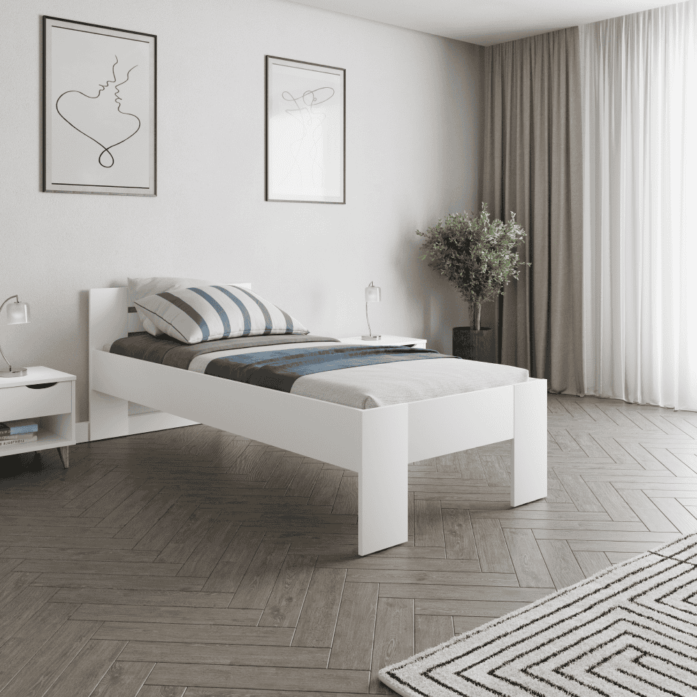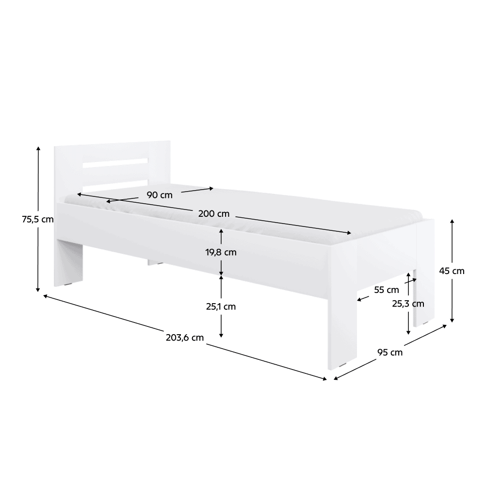 Material: DTD laminat/margini ABS Culoare: albă Dimensiuni (lxAxh): 95×203,6×75,5 cm Suprafaţa pentru dormit (lxL): 90×200 cm Grosime DTD laminat: 1,6-1,8 kg Picioare din metal Înălţimea compartimentului inferior de la podea: 25,1 cm glisoare din plastic Înălţimea glisoarelor din plastic: 0,5 cm Înălţimea lateralei: 19,8 cm Înălţimea minimă recomandată a saltelei: 15 cm Încastrarea saltelei: 11 cm Portanţă: 100 kg Pat single Livrat fără somieră şi saltea Opţiunea de achiziţie a somierăului şi saltelei din oferta noastră Design modern Livrat dezasamblat