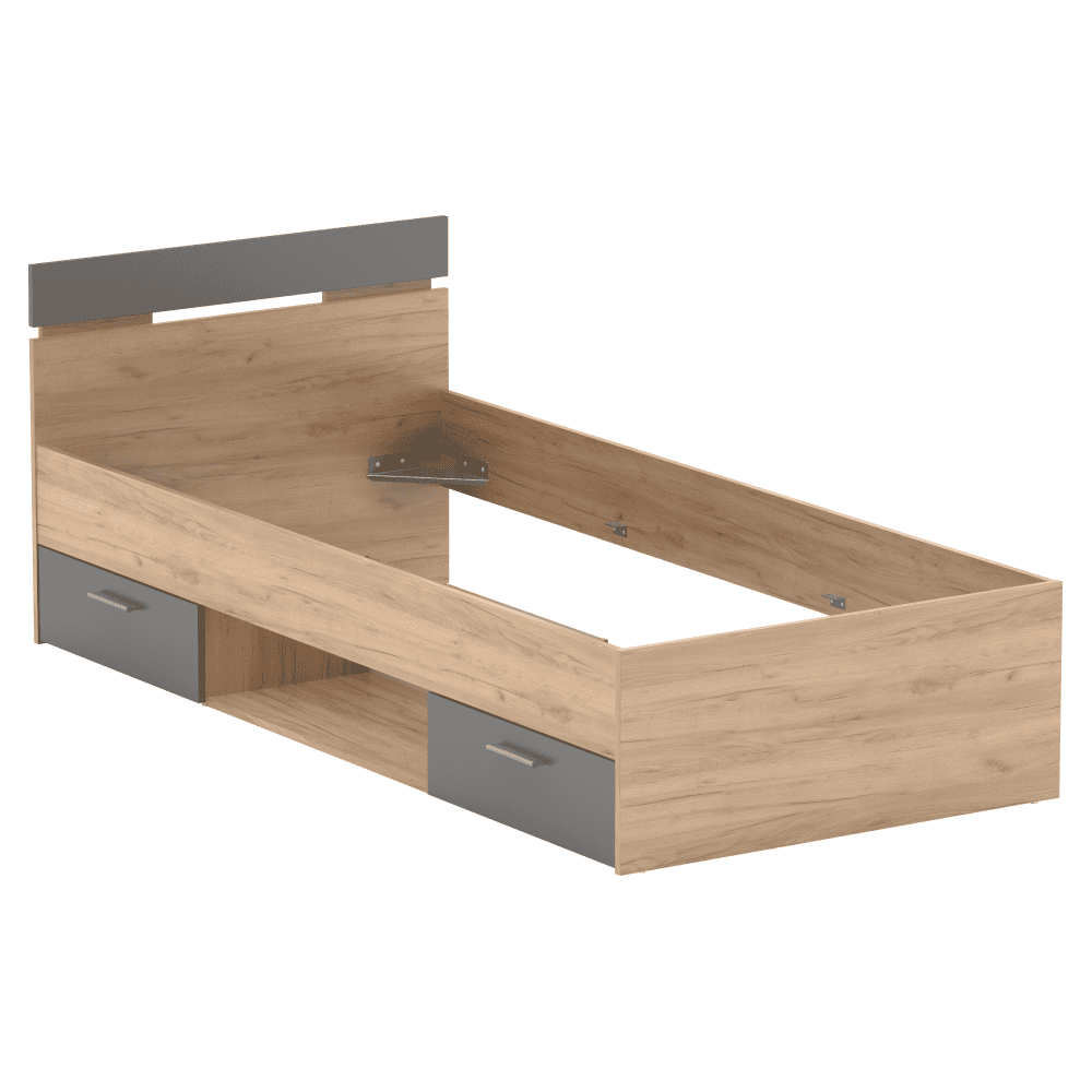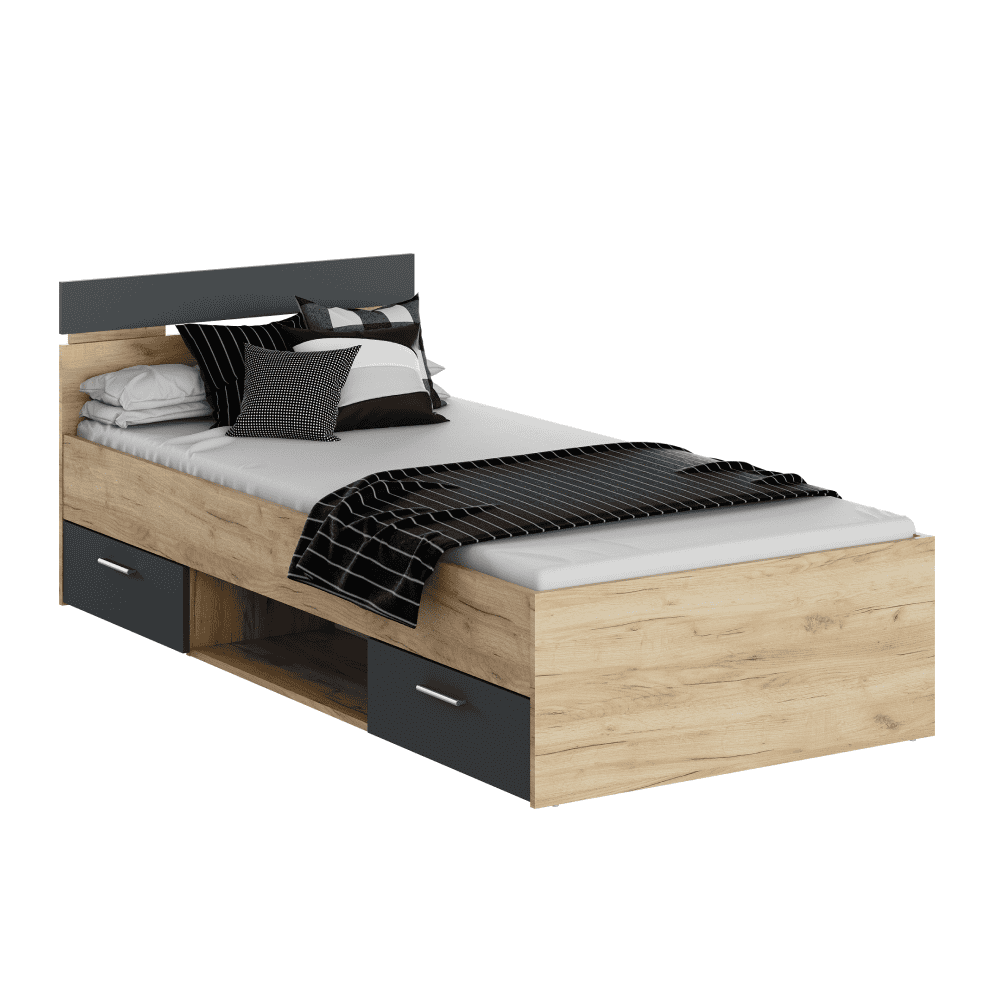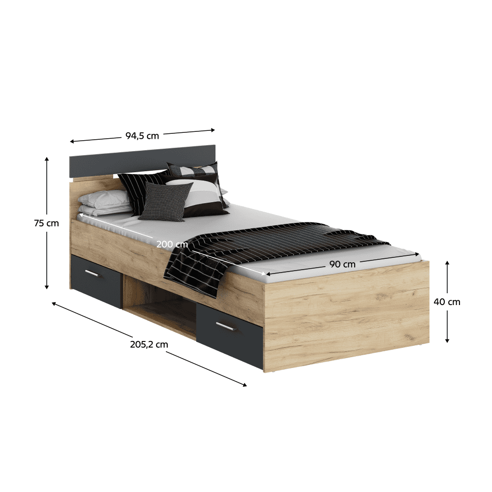 Este fabricat din material Pal melaminat în culoarea stejar artisan/grafit, cu dimensiuni (LxAxl): 94,5×74,2×204,3 cm, dimensiuni sertare (LxAxH): 55,5×33,5×11 cm suprafaţă utilă de dormit: 90×200 cm.