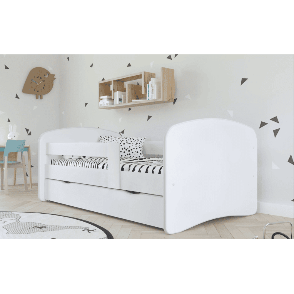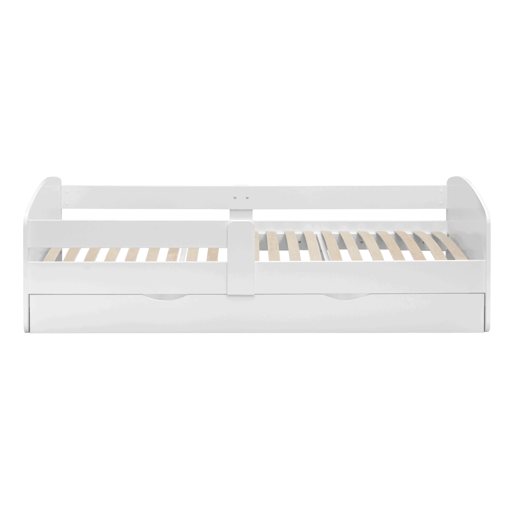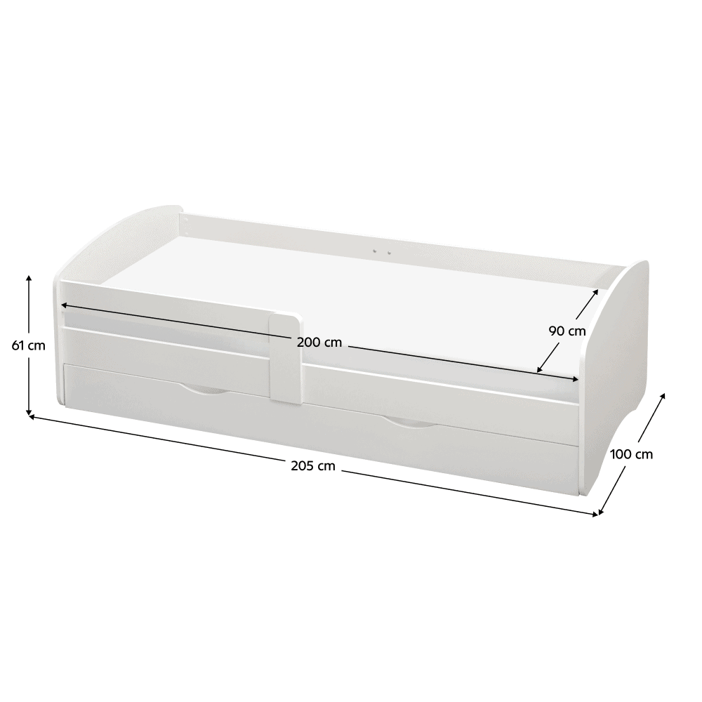 Material: DTD laminat Culoare: albă Dimensiuni (Lxlxh): 205x100x61 cm Dimensiuni părţii de dormit (Lxl): 90×200 cm Grosime material: 1,8 cm Posibilitatea de a monta bariera pe partea stângă sau dreaptă Modern şi practic Cu spaţiu de depozitare Spaţiu de depozitare pe roţi Două sertare Greutate: 55 cm Portanţă: 90 kg Livrat cu somieră cu lamele Livrat fără saltea Înălţimea recomandată a saltelei: 13 cm