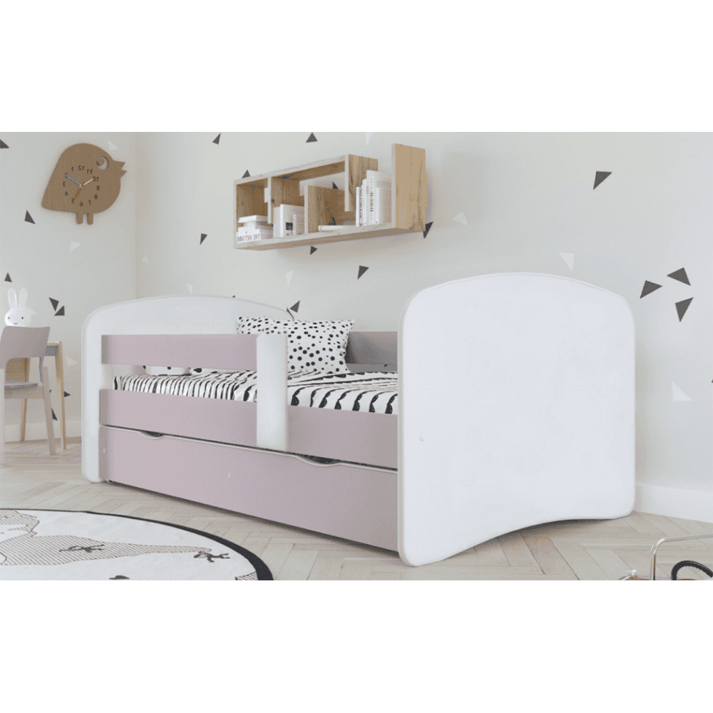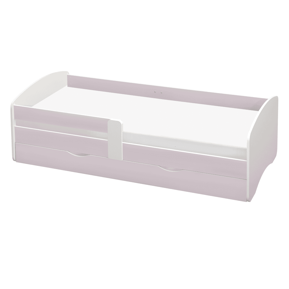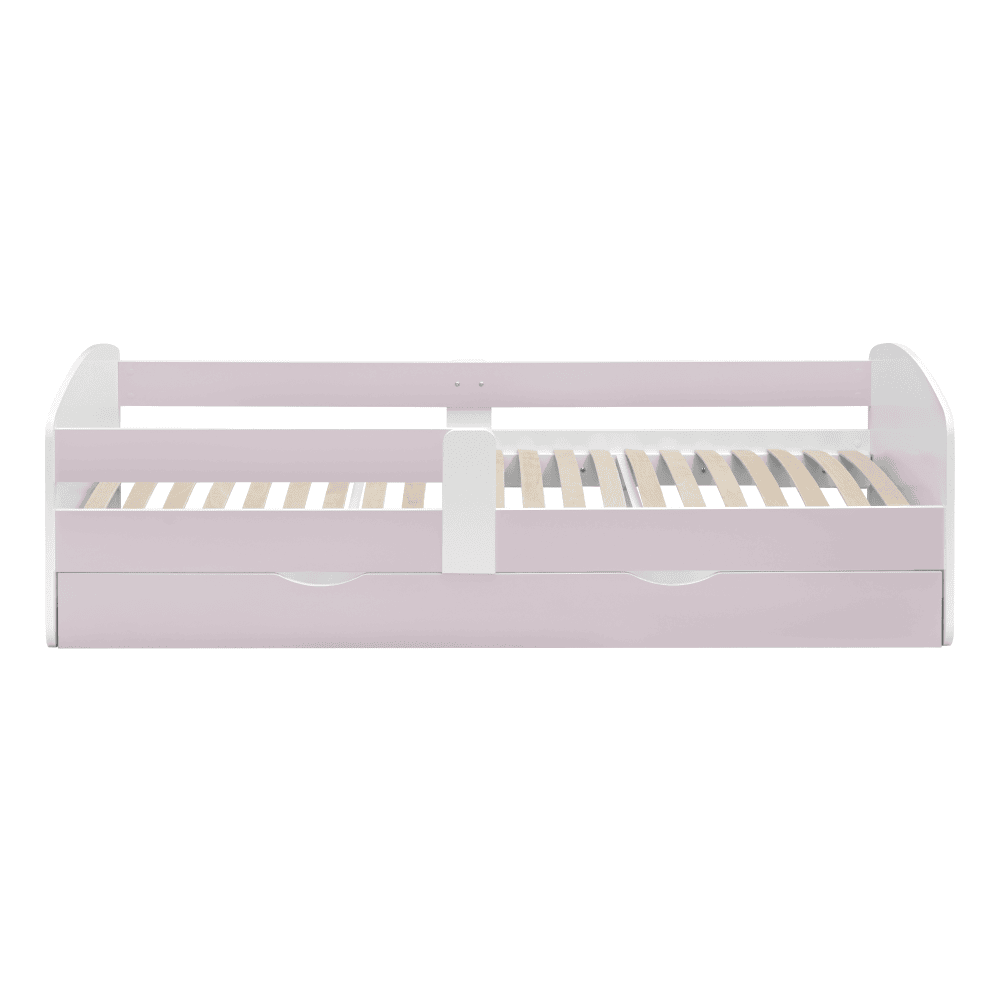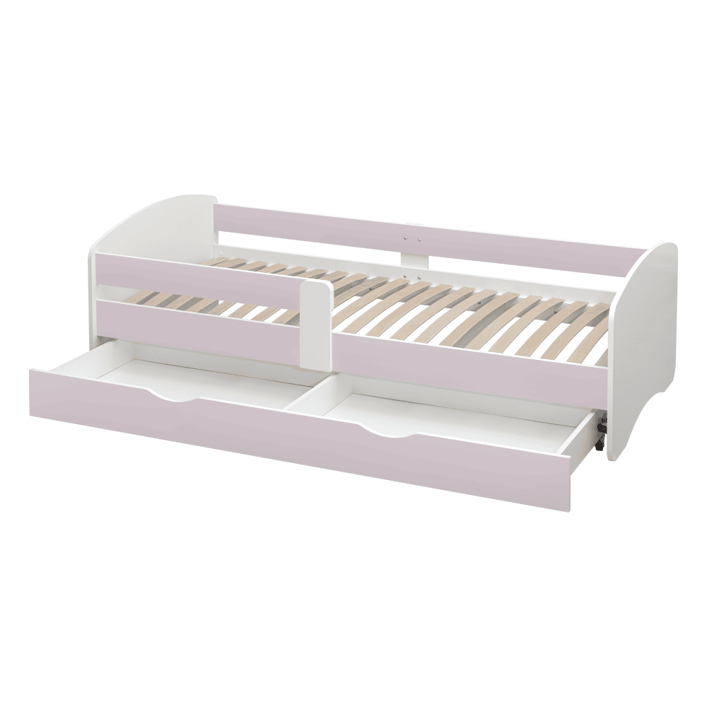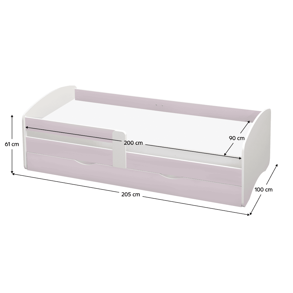 Material: DTD laminat Culoare: albă/roz Dimensiuni (Lxlxh): 205x100x61 cm Dimensiuni părţii de dormit (Lxl): 90×200 cm Grosime material: 1,8 cm Posibilitatea de a monta bariera pe partea stângă sau dreaptă Modern şi practic Cu spaţiu de depozitare Spaţiu de depozitare pe roţi Două sertare Greutate: 55 cm Portanţă: 90 kg Livrat cu somieră cu lamele Livrat fără saltea Înălţimea recomandată a saltelei: 13 cm