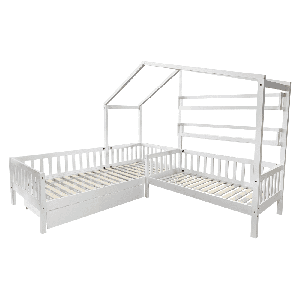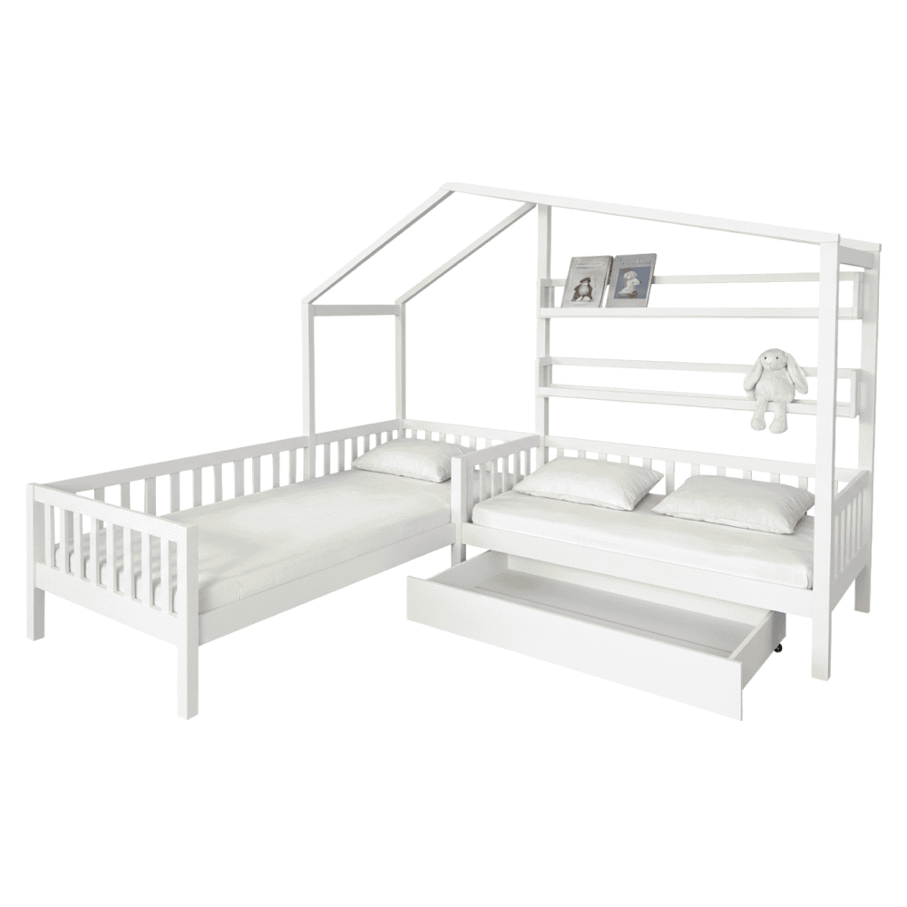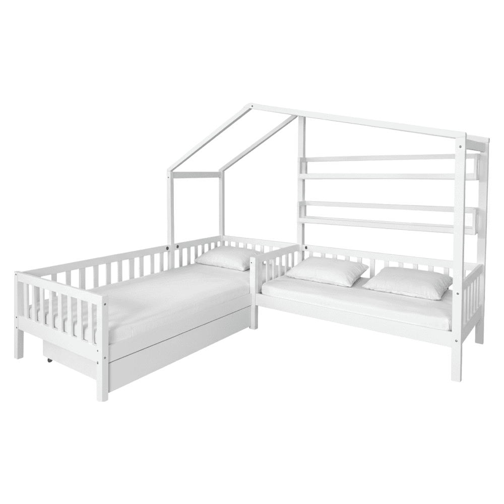 Pat cu şipci pentru 2 copii, 90×200 +70×140 cm, alb, ENOLA