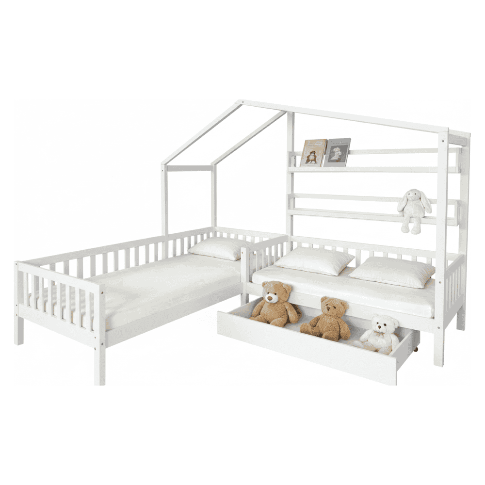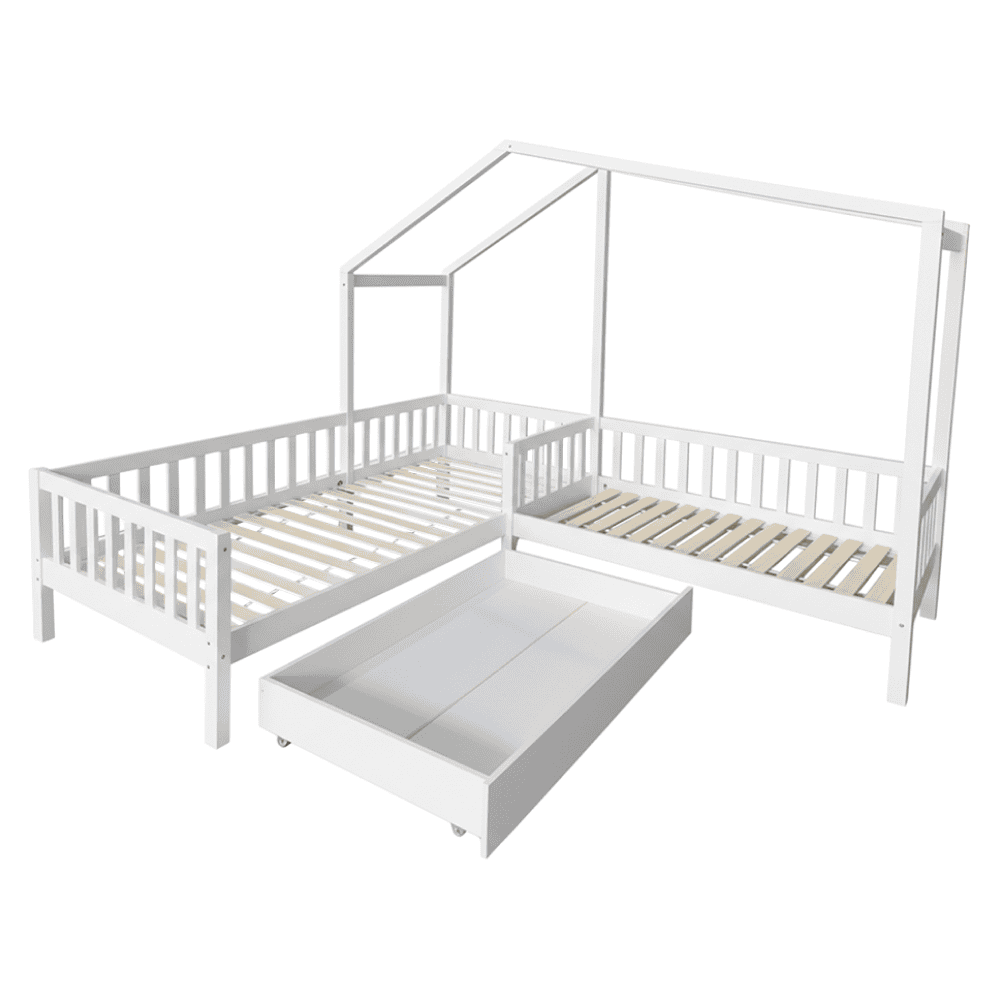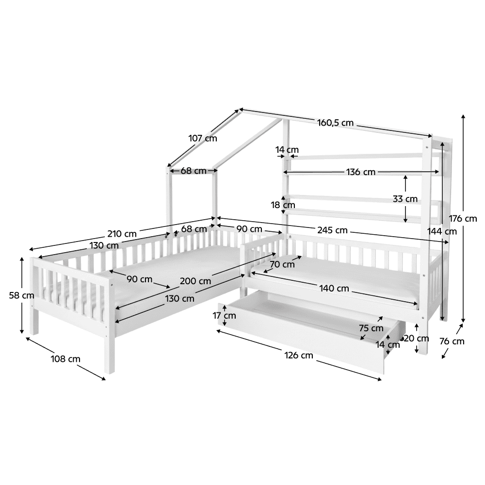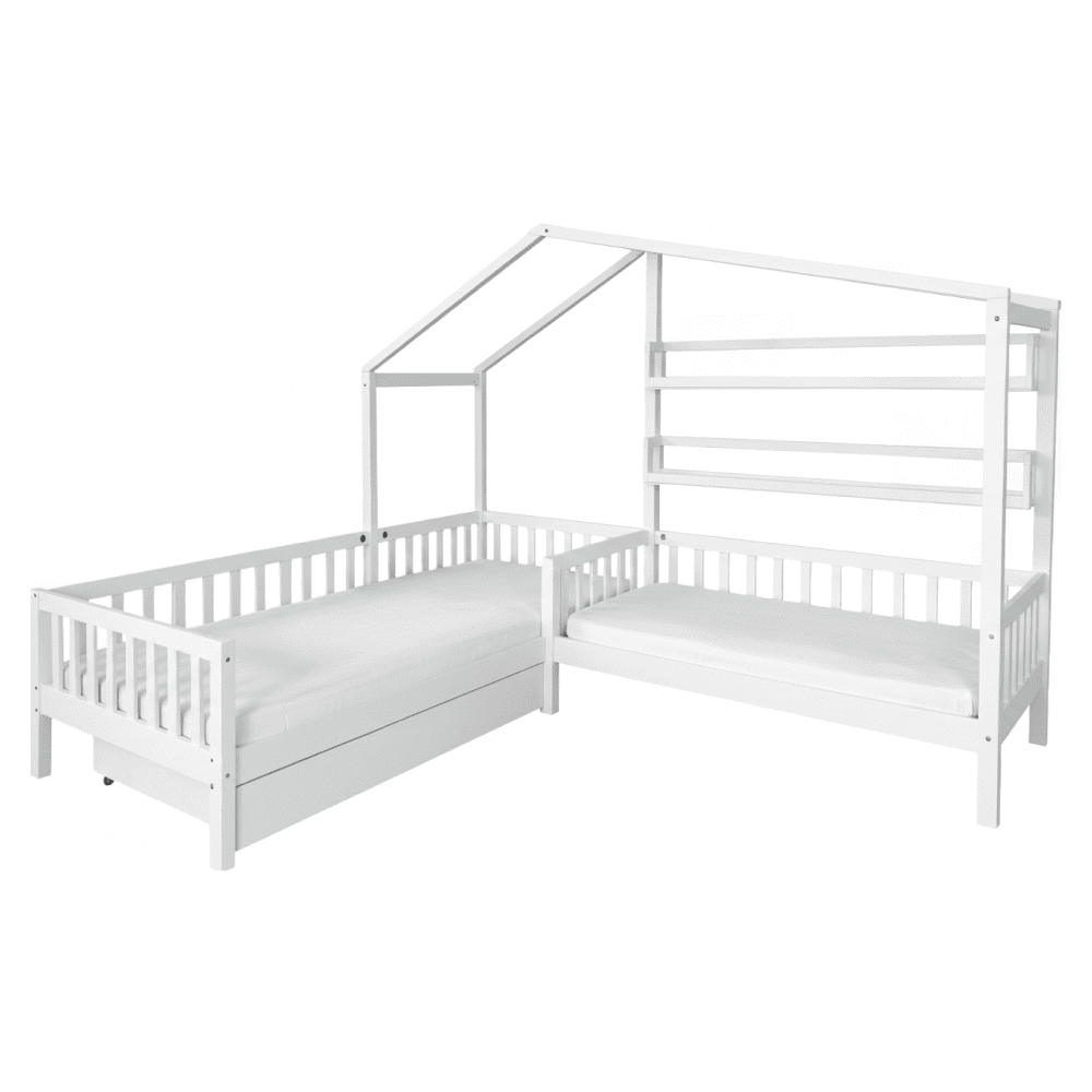 Pat cu şipci pentru 2 copii, 90×200 +70×140 cm, alb, ENOLA