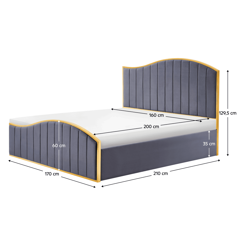 Material: ţesătură Velvet/MDF Rezistenţa ţesăturii la frecare conform testului Martindale: 25 000 – 30 000 de cicluri de frecare Culoare: gri închis/gold crom auriu Dimensiuni (lxAxh): 170x210x129,5 cm, spaţiu de dormit (lxL): 160×200 cm Înălţimea până la somieră: 30 cm Înălţimea lateralei: 35 cm Portanţă pe loc de dormit: 120 kg Cu frontala înaltă înălţime frontalei: 60 cm Înălţimea frunţii posterioare: 129,5 cm Frontală matlasată Livrat cu somieră cu lamele Spaţiu între lamele: 5,5 cm Picior de sprijin Livrat fără saltea Opţiunea de a cumpăra saltele din oferta noastră Înălţimea recomandată a saltelei: 20 cm Încastrarea saltelei: 5 cm Design modern Livrat dezasamblat