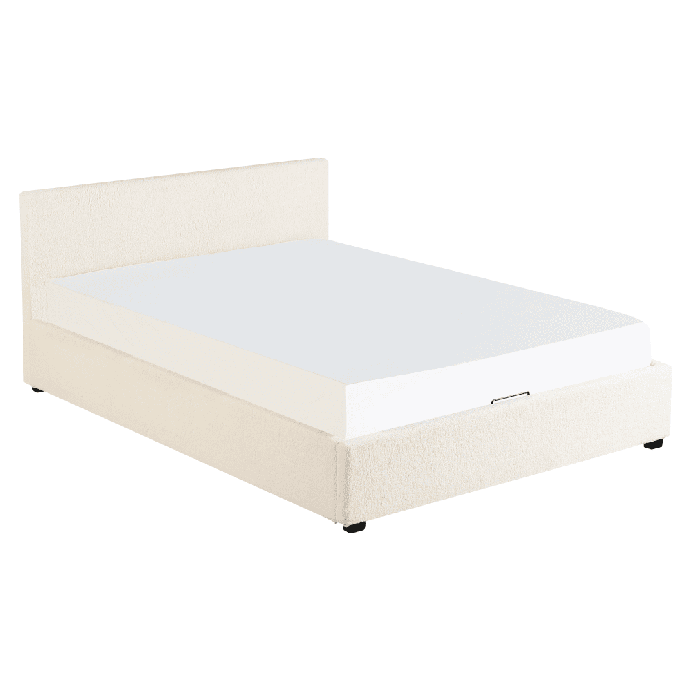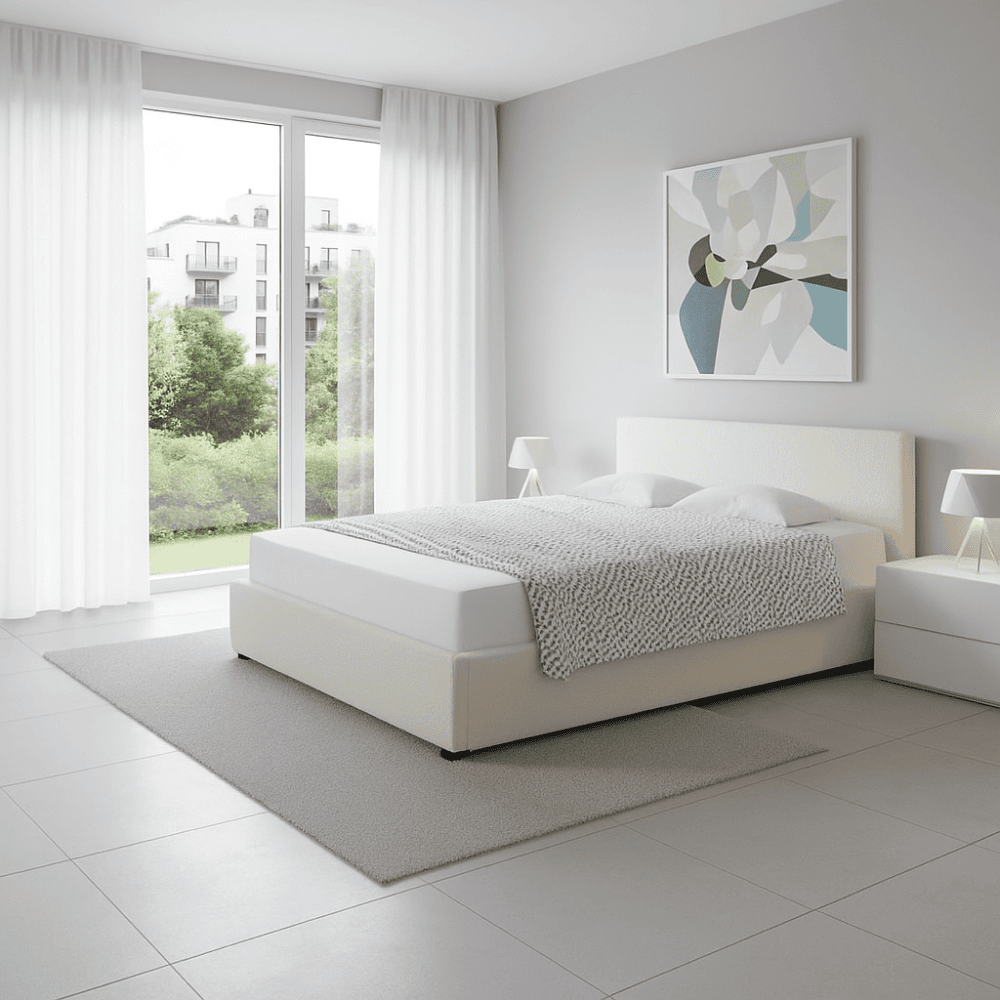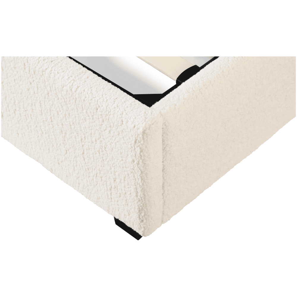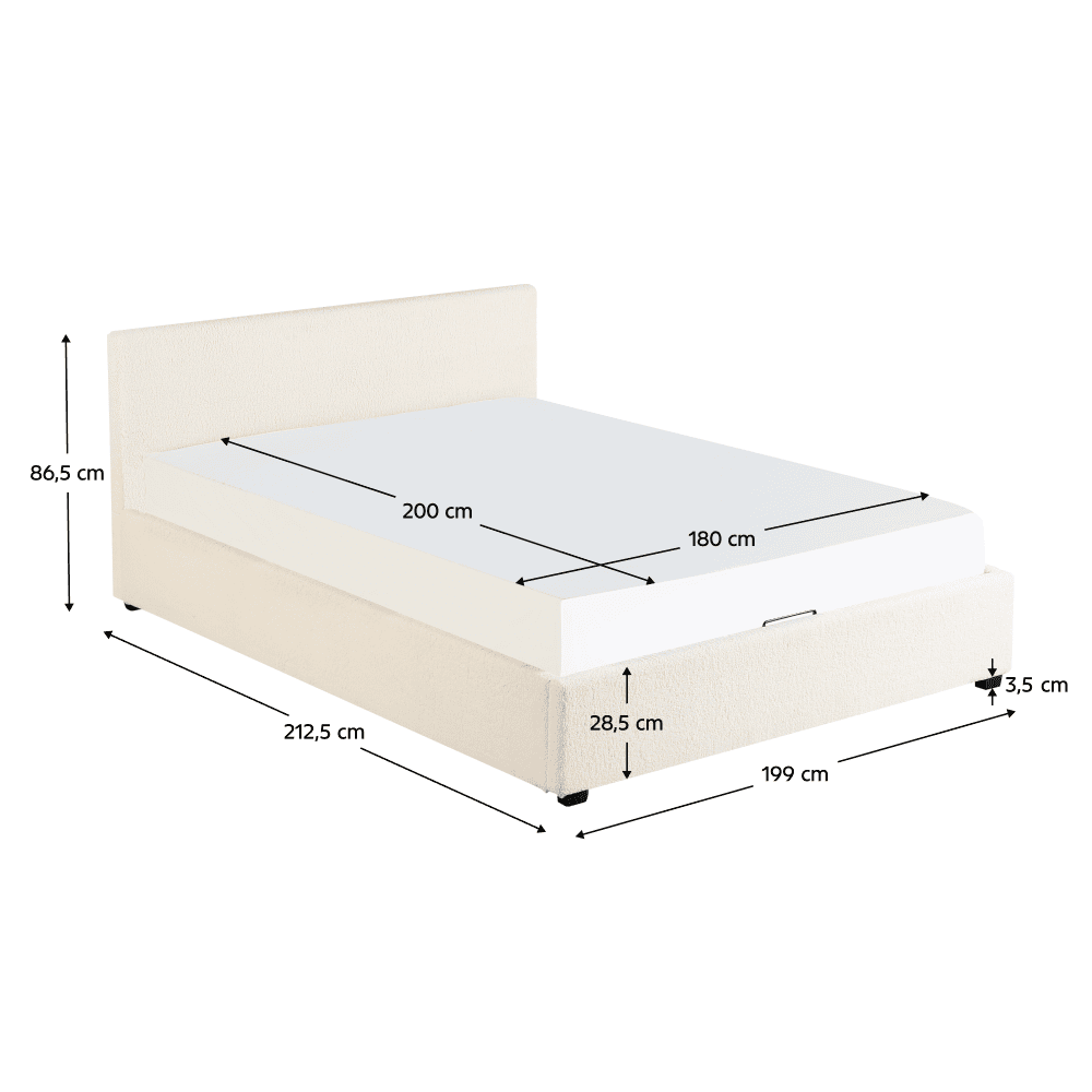 Material: ţesătură Bouclé/MDF melaminat Rezistenţa ţesăturii la frecare conform testului Martindale: 70 000 – 100 000 de cicluri de frecare Culoare: albă Dimensiuni (lxAxh): 199×212,5×86,5 cm Suprafaţă de dormit (lxL): 180×200 cm Înălţimea până la somieră: 28 cm Portanţa pe locul de dormit: 250 kg Cu frontală înaltă Înălţimea frontalei din faţă: 32 cm Înălţime frontală spate: 86,5 cm Pe picioare Materialul picioarelor: lemn Culoarea picioarelor: neagră Înălţimea picioarelor: 3,5 cm Livrat cu somieră cu lamele Spaţiu între lamele: 5 cm Pistoane pe gaz Livrat fără saltea Opţiunea de a cumpăra o saltea suplimentară din oferta noastră Înălţimea recomandată a saltelei: max. 20 cm Încastrarea saltelei: 3,5 cm Design modern Livrat dezasamblat