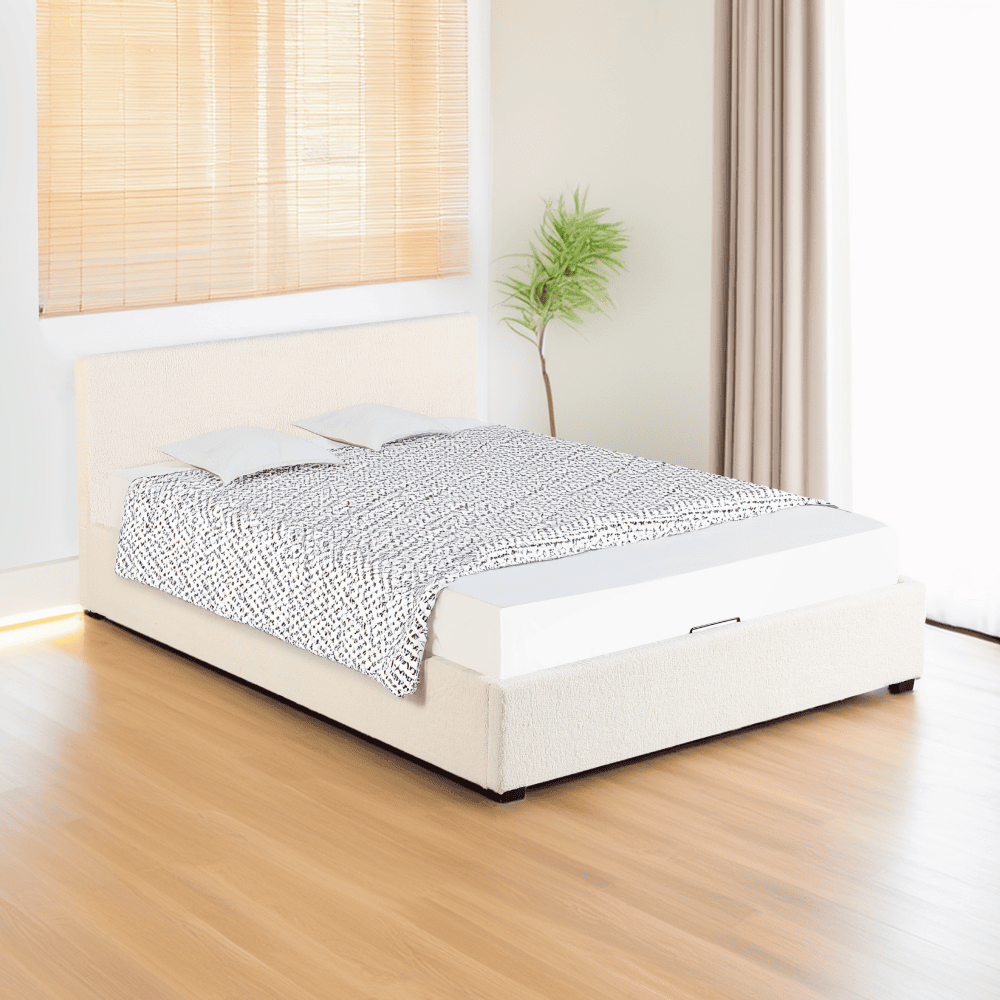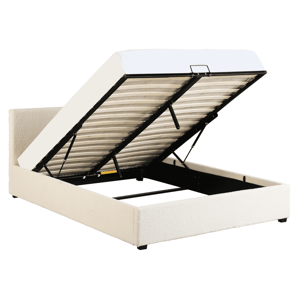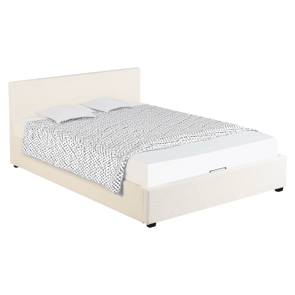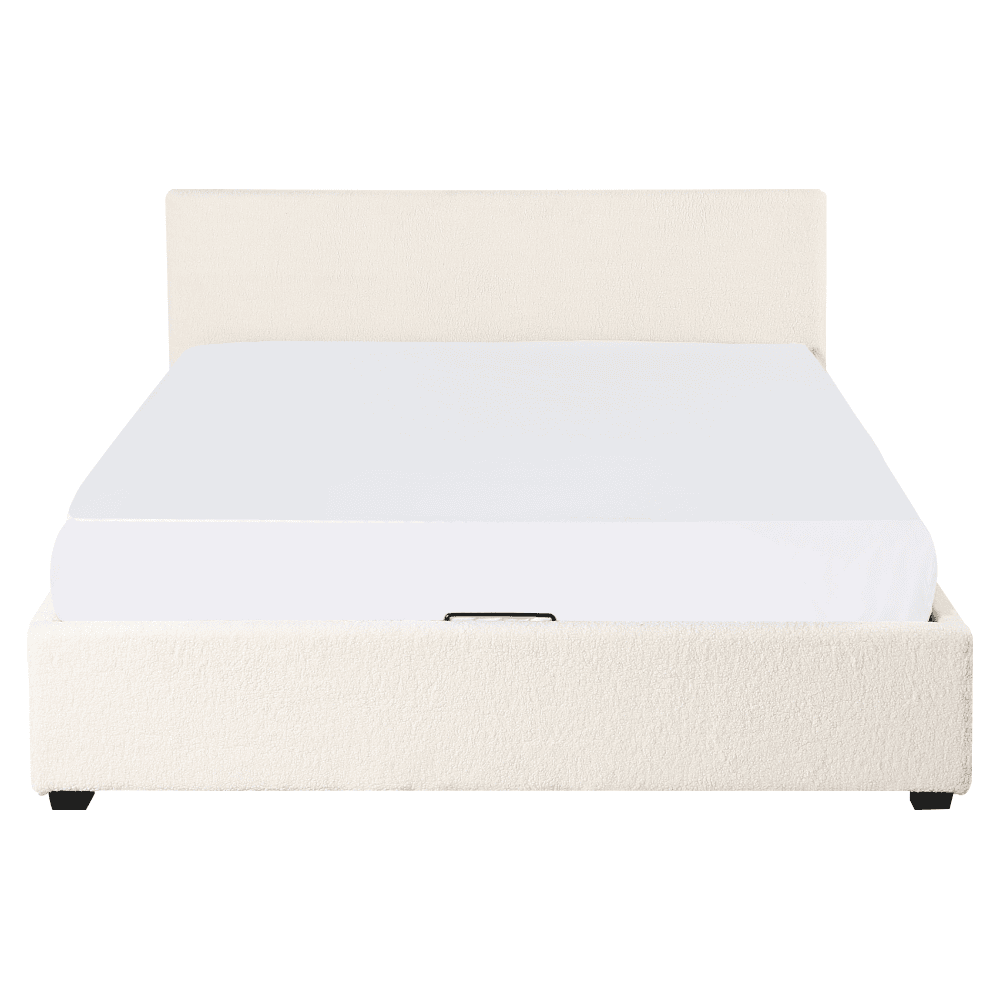 Material: ţesătură Bouclé/MDF melaminat Rezistenţa ţesăturii la frecare conform testului Martindale: 70 000 – 100 000 de cicluri de frecare Culoare: albă Dimensiuni (lxAxh): 199×212,5×86,5 cm Suprafaţă de dormit (lxL): 180×200 cm Înălţimea până la somieră: 28 cm Portanţa pe locul de dormit: 250 kg Cu frontală înaltă Înălţimea frontalei din faţă: 32 cm Înălţime frontală spate: 86,5 cm Pe picioare Materialul picioarelor: lemn Culoarea picioarelor: neagră Înălţimea picioarelor: 3,5 cm Livrat cu somieră cu lamele Spaţiu între lamele: 5 cm Pistoane pe gaz Livrat fără saltea Opţiunea de a cumpăra o saltea suplimentară din oferta noastră Înălţimea recomandată a saltelei: max. 20 cm Încastrarea saltelei: 3,5 cm Design modern Livrat dezasamblat