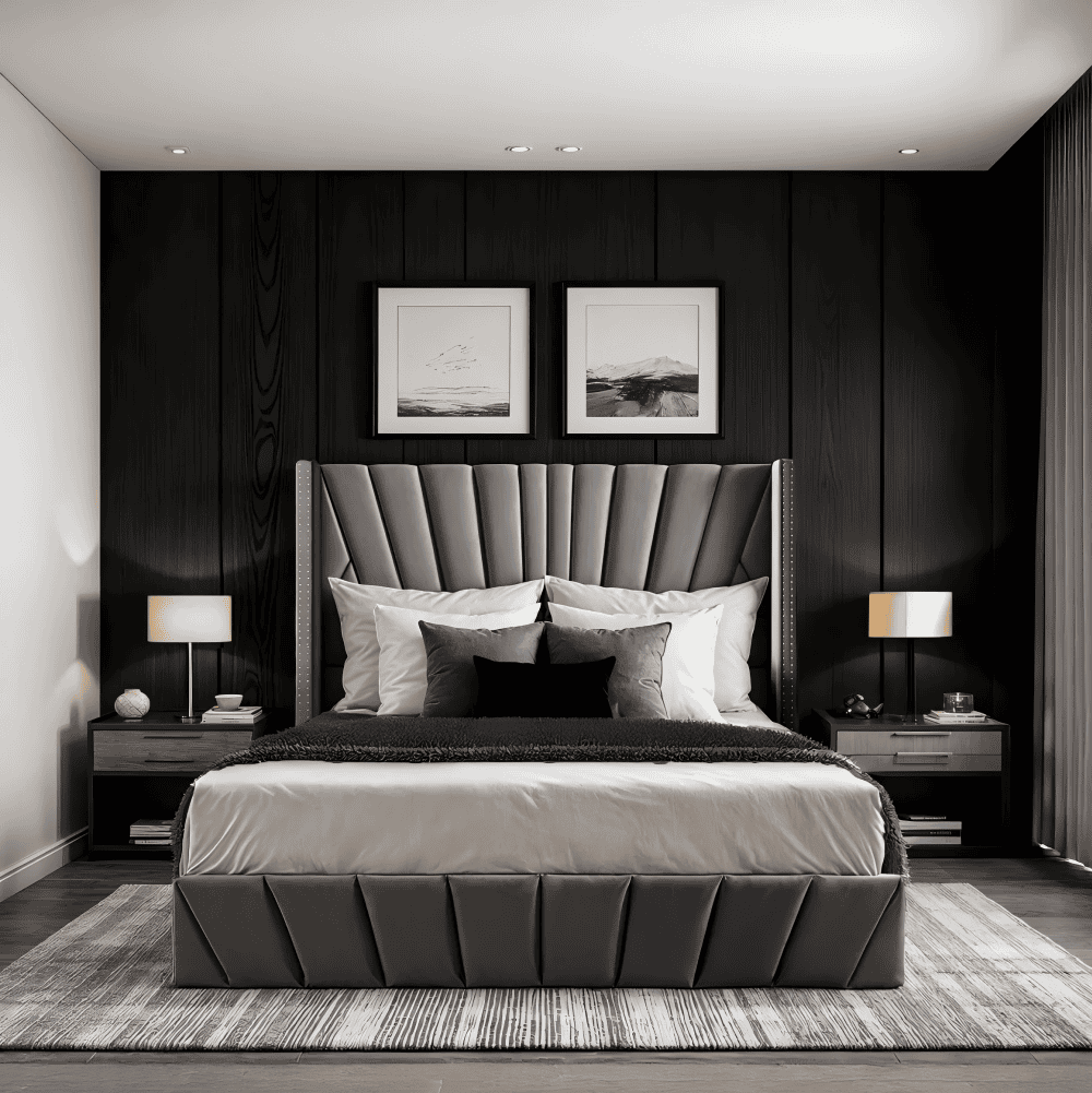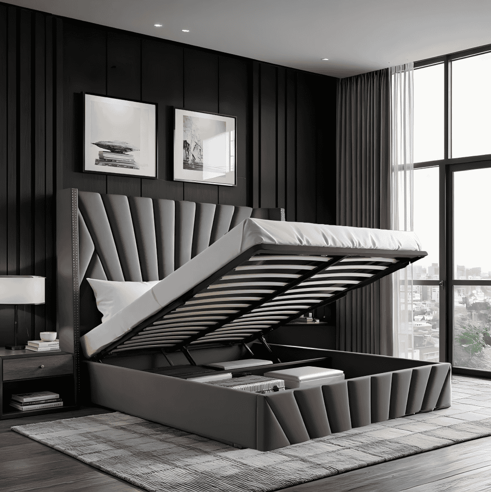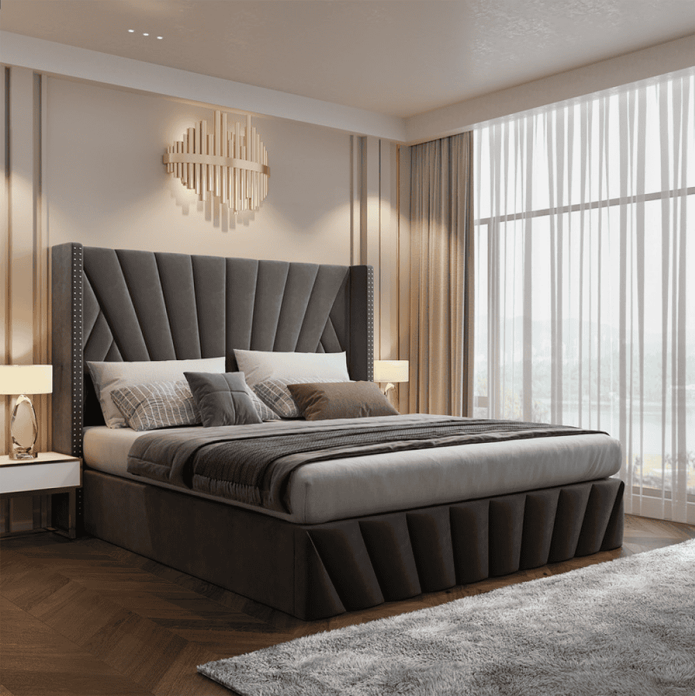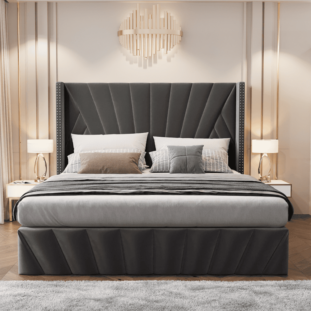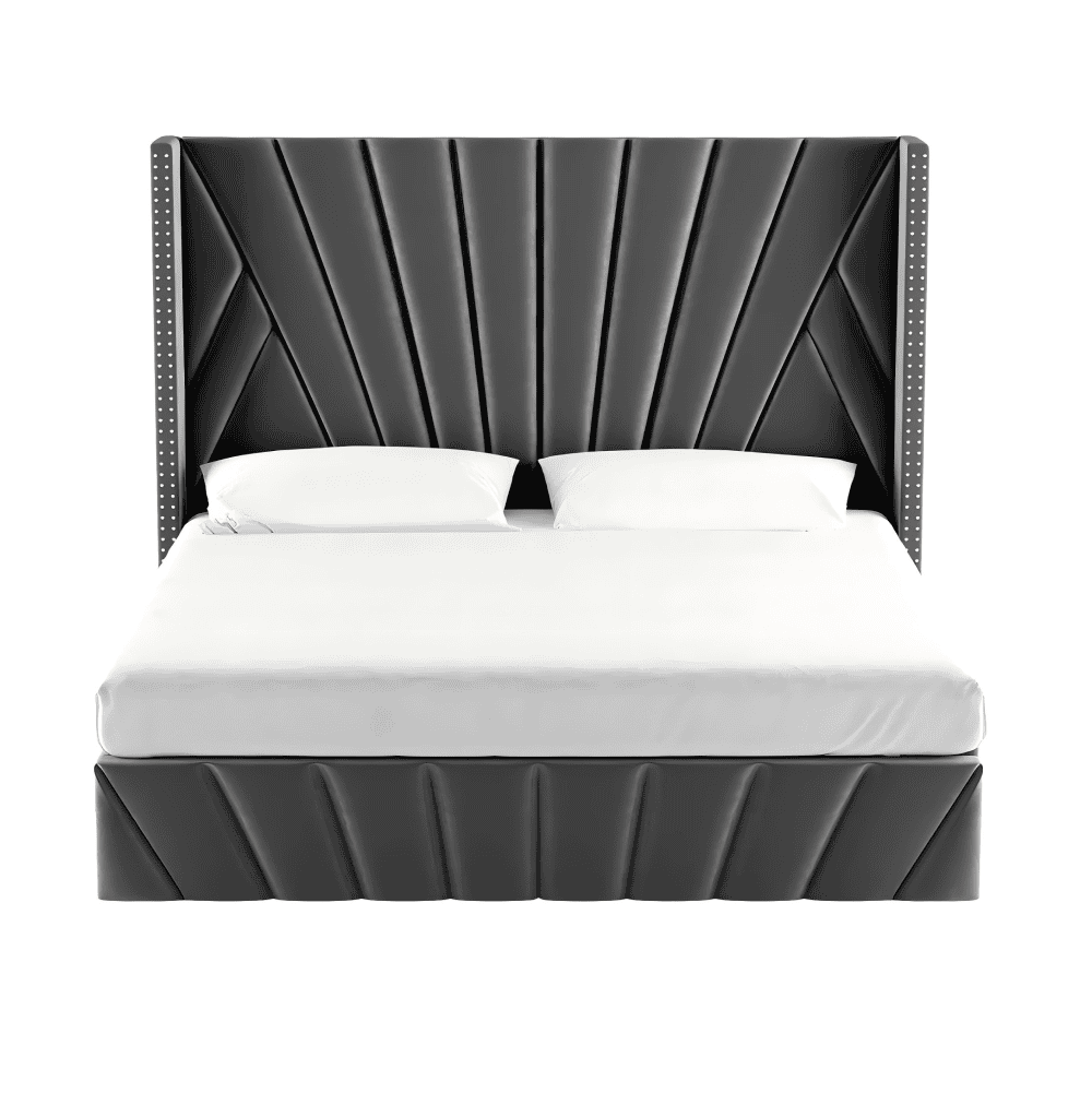 Material: ţesătură Velvet/MDF/placaj/metal Rezistenţa ţesăturii la frecare conform testului Martindale: 25 000 – 30 000 de cicluri de frecare Culoare: gri închis Dimensiuni (lxAxh): 201x219x140 cm, Suprafaţa de dormit (lxL): 180×200 cm Înălţimea până la somieră: 33 cm Portanţa pe locul de dormit: 110 kg Cu frontală înaltă Înălţimea lateralei: 35 cm Înălţime frontală spate: 140 cm frontală matlasată Cu spaţiu de depozitare Livrat cu somieră batant cu lamele Spaţiu între lamele: 5,5 cm Pistoane pe gaz Livrat fără saltea Opţiunea de a cumpăra o saltea suplimentară din oferta noastră Înălţimea recomandată a saltelei: 20 cm Încastrarea saltelei: 2 cm Design modern Livrat dezasamblat