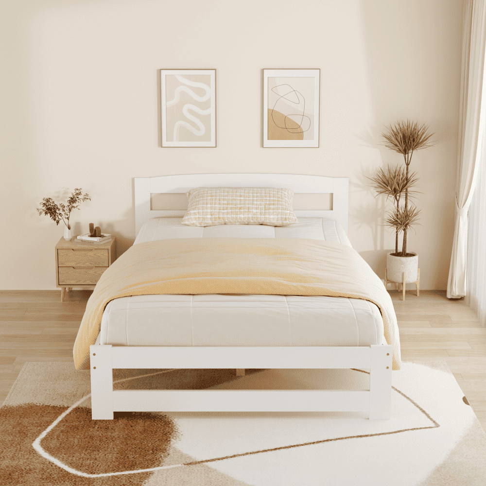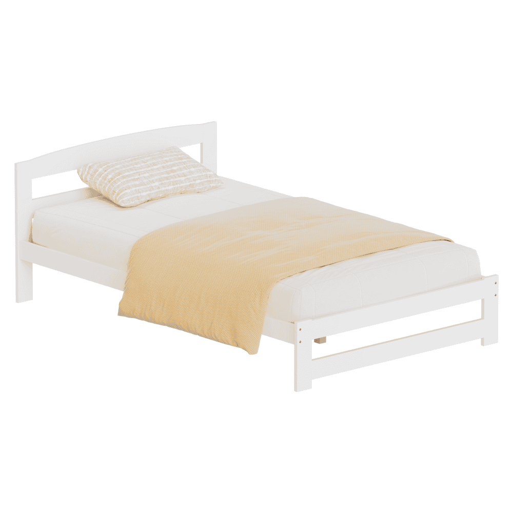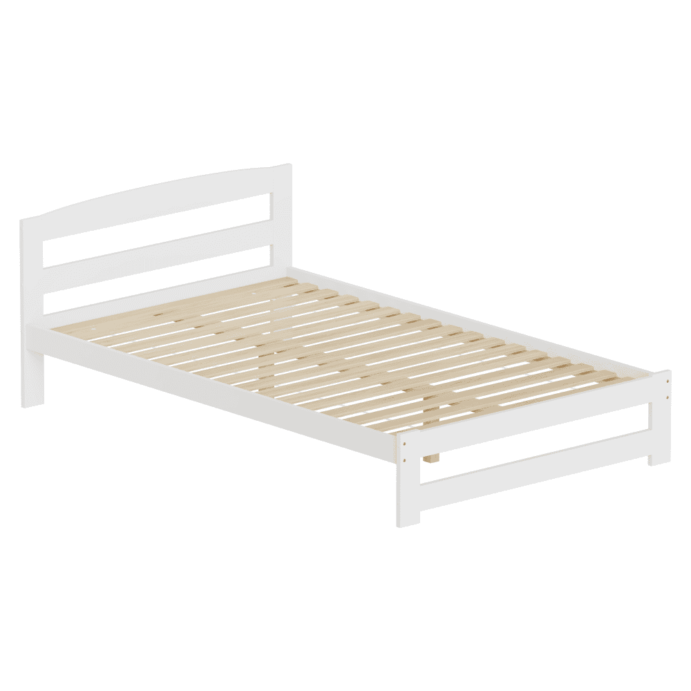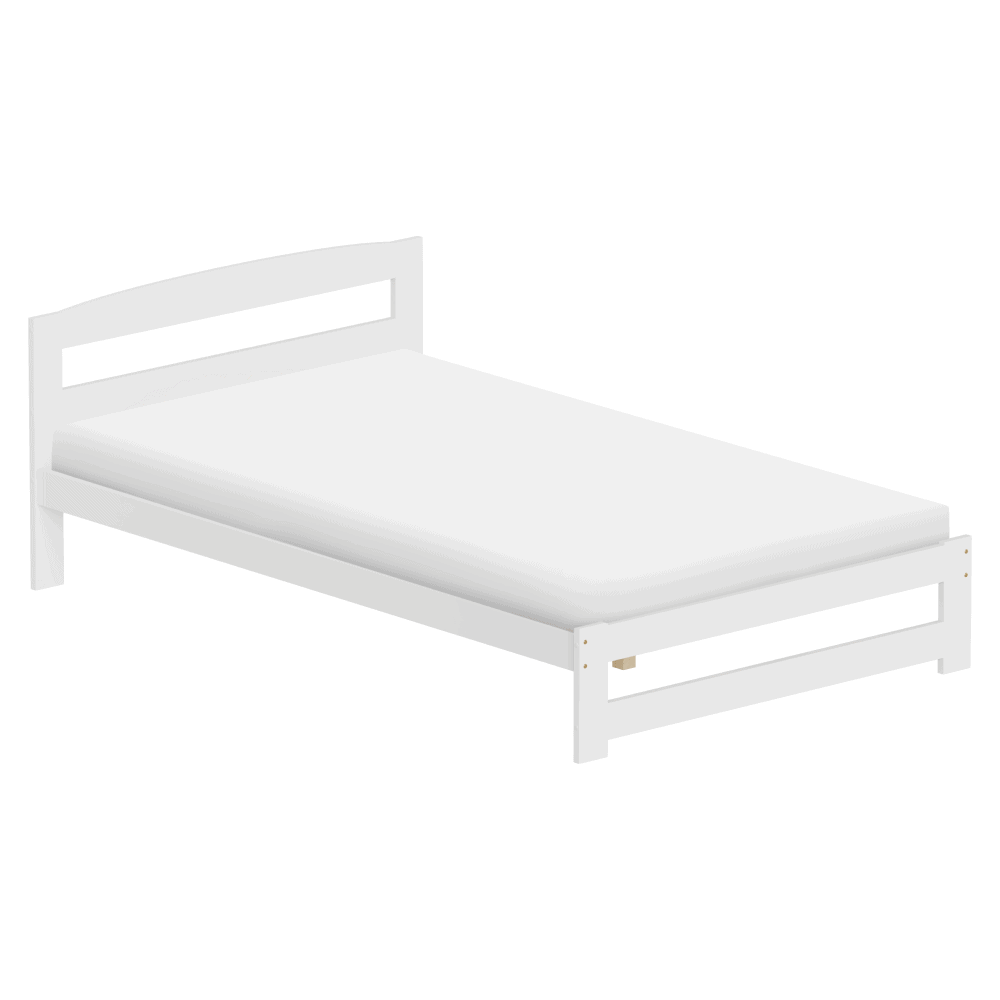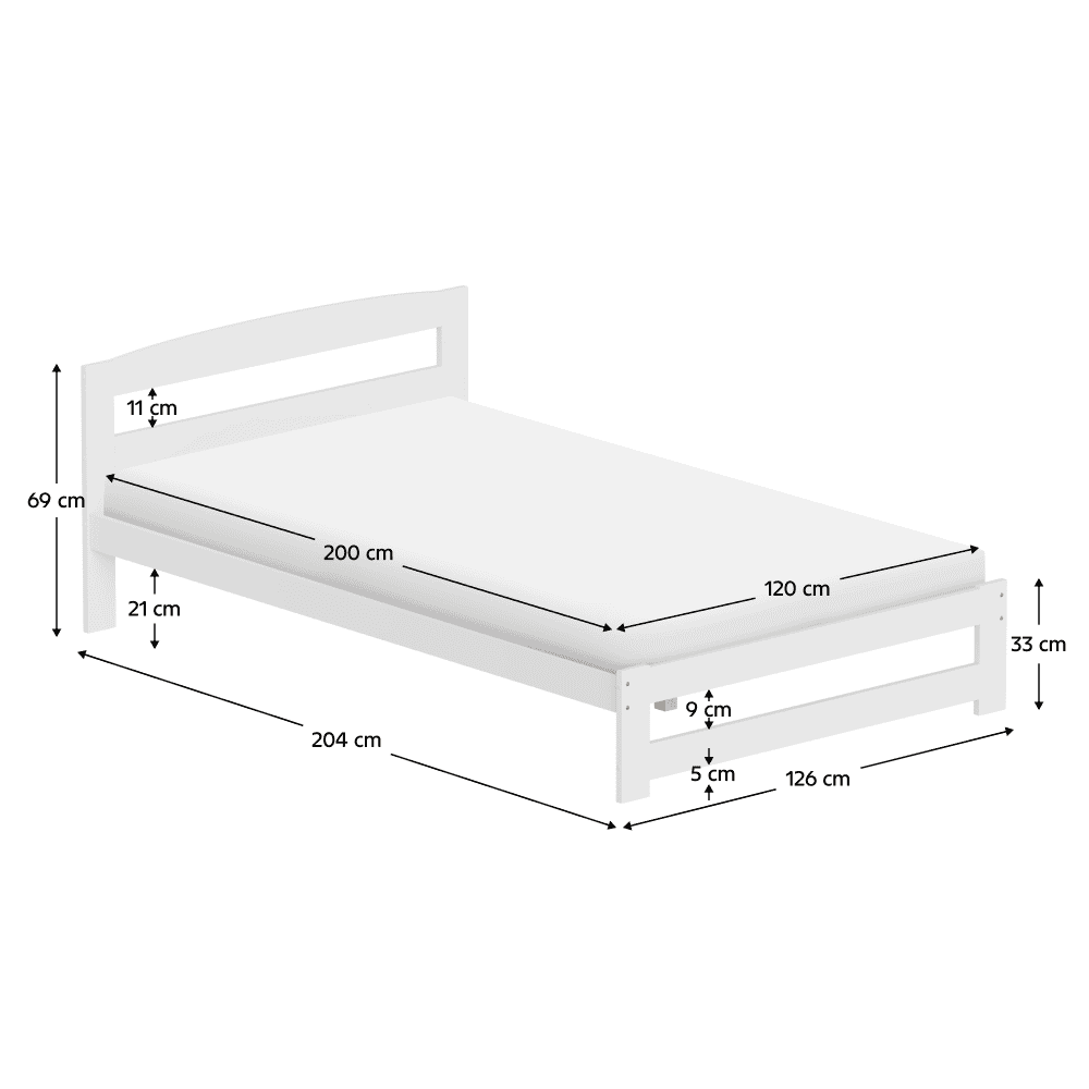 Material: lemn de pin Culoare: alb Dimensiuni (lxAxh): 126x204x69 cm Suprafaţa pentru dormit (lxL): 120×200 cm Grosime material: 2 cm Portanţa pe locul de dormit: 90 kg Înălţime până la somieră: 28 cm Picioare din metal Înălţimea compartimentului inferior de la podea: 21 cm Livrat cu somieră roluibilă din placaj laminat. Livrat fără saltea. Opţiunea de a cumpăra o saltea cu arcuri din oferta noastră. Înălţimea maximă recomandată a saltelei: 7 cm Încastrarea saltelei: 3 cm Design simplu Practic Livrat asamblat