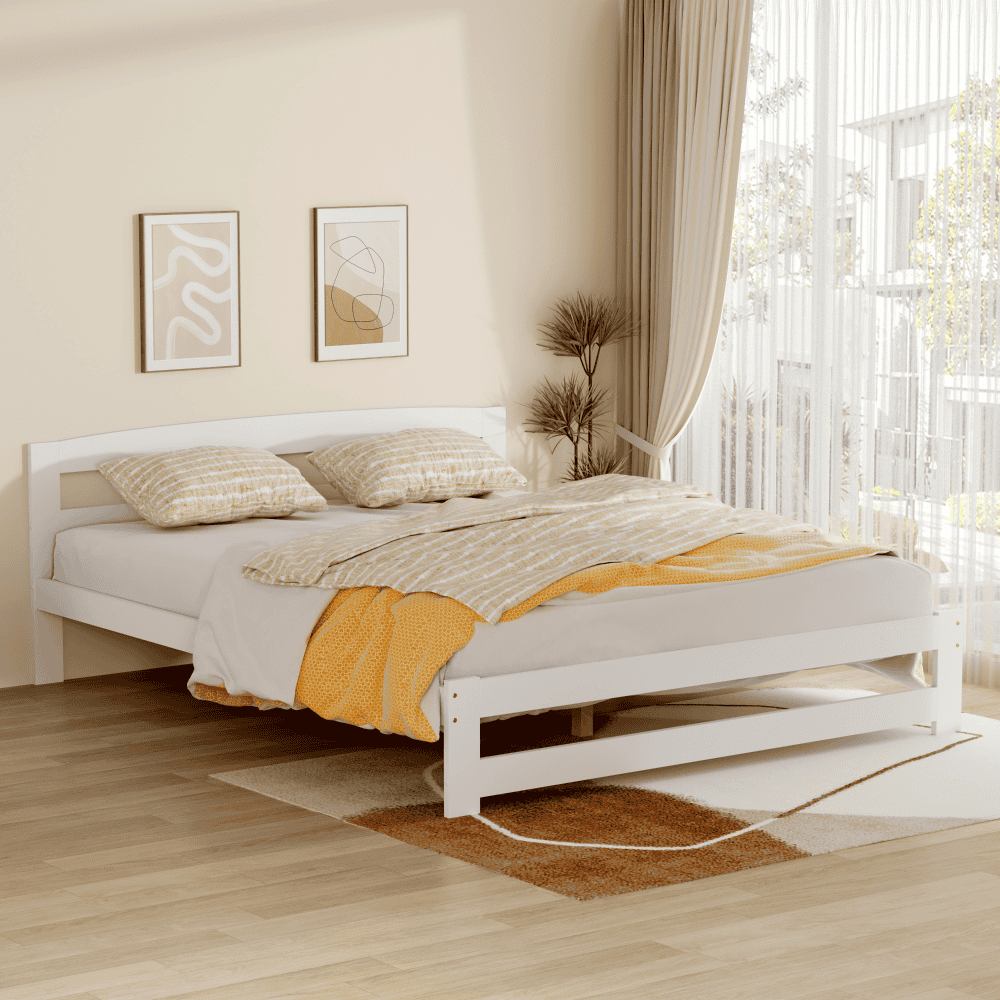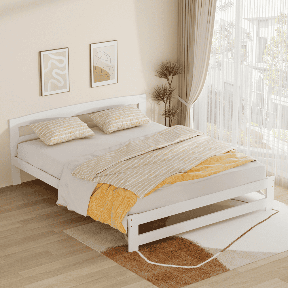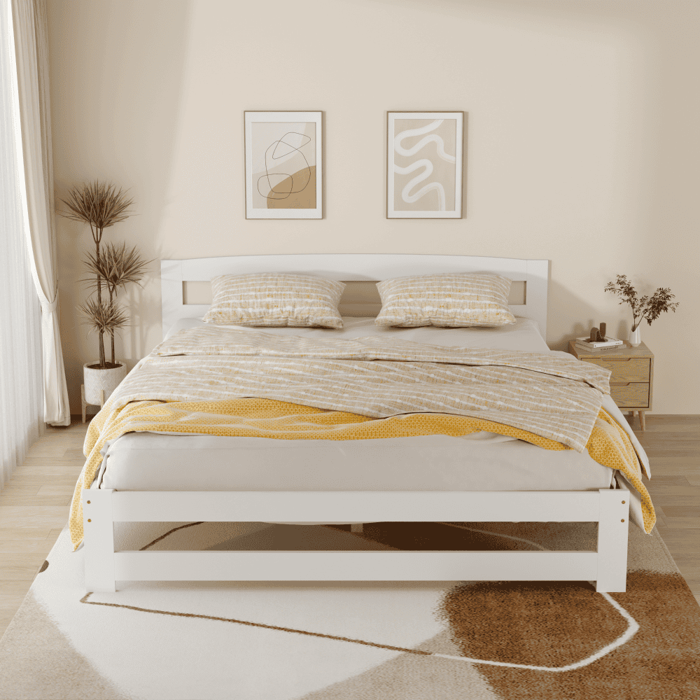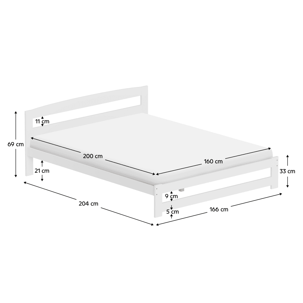 Material: lemn de pin Culoare: alb Dimensiuni (lxAxh): 166x204x69 cm Suprafaţa pentru dormit (lxL): 160×200 cm Grosime material: 2 cm Portanţa pe locul de dormit: 90 kg Înălţime până la somieră: 28 cm Picioare din metal Înălţimea compartimentului inferior de la podea: 21 cm Livrat cu somieră roluibilă din placaj laminat. Livrat fără saltea. Opţiunea de a cumpăra o saltea cu arcuri din oferta noastră. Înălţimea maximă recomandată a saltelei: 7 cm Încastrarea saltelei: 3 cm Design simplu Practic Livrat asamblat