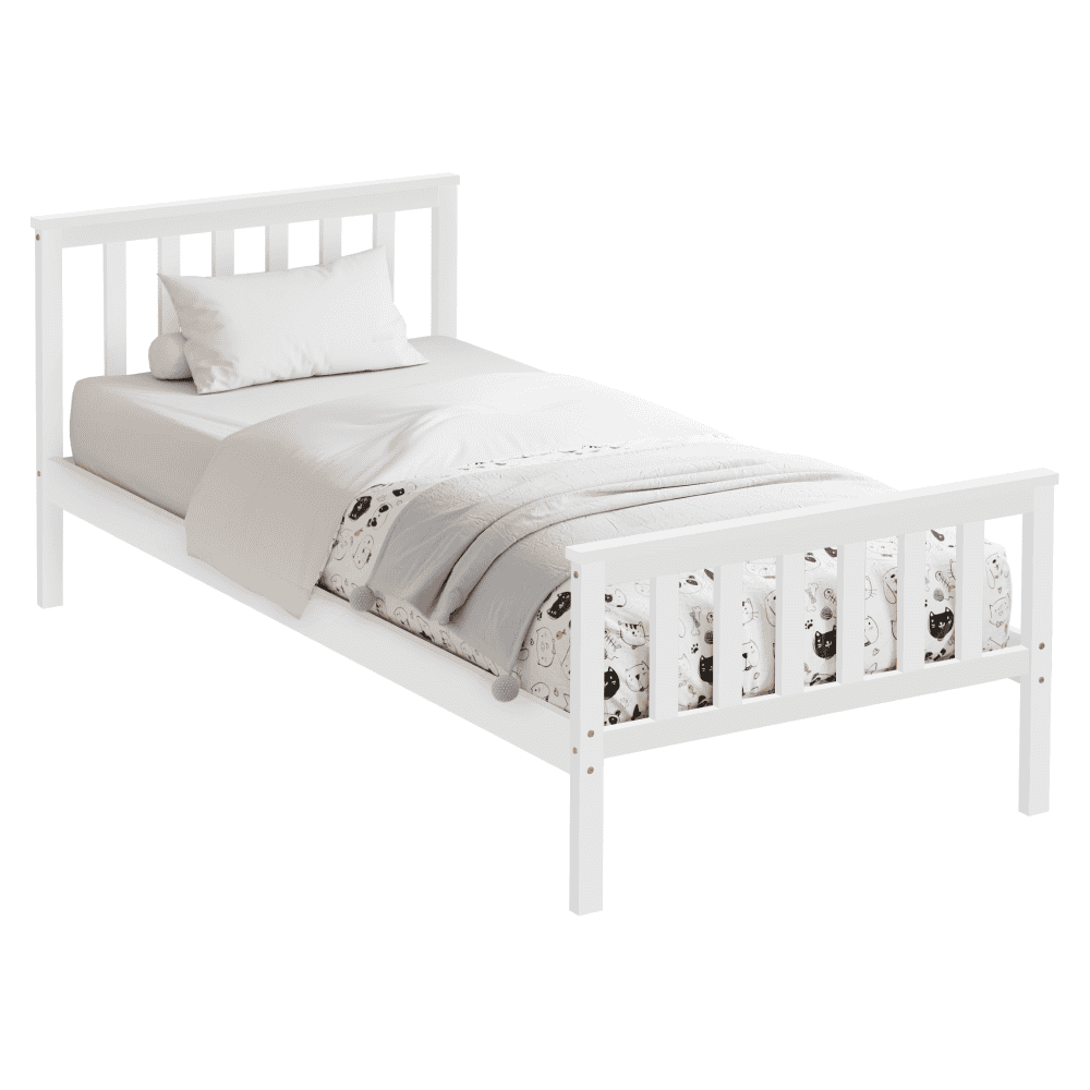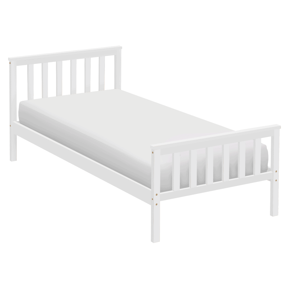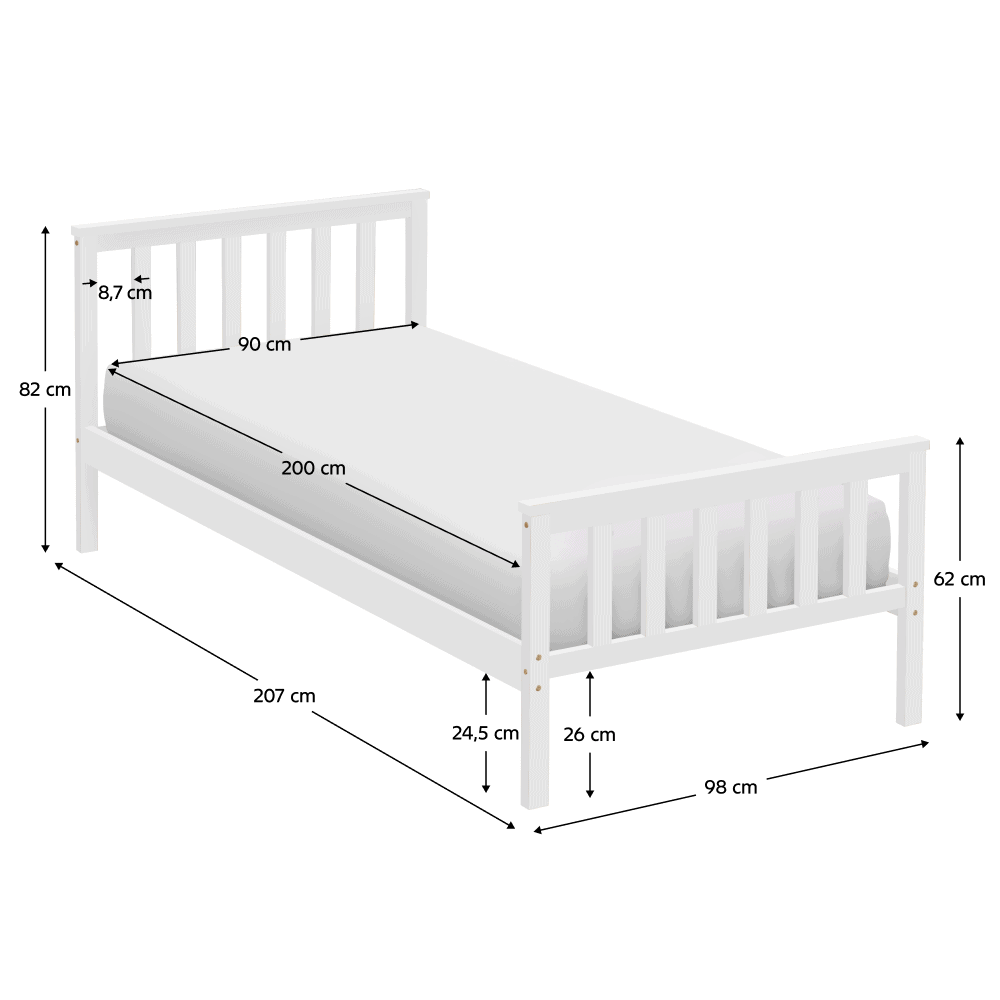 Material: lemn de pin Culoare: alb Dimensiuni (lxAxh): 98x207x82 cm Suprafaţa pentru dormit (lxL): 90×200 cm Grosime material: 2 cm Portanţa pe locul de dormit: 90 kg Înălţime până la somieră: 26 cm Pe picioare Livrat cu somieră roluibilă din placaj Livrat fără saltea Opţiunea de a cumpăra o saltea din oferta noastră Înălţimea recomandată a saltelei: 7 cm Încastrarea saltelei: 3 cm Design simplu Practic Livrat asamblat