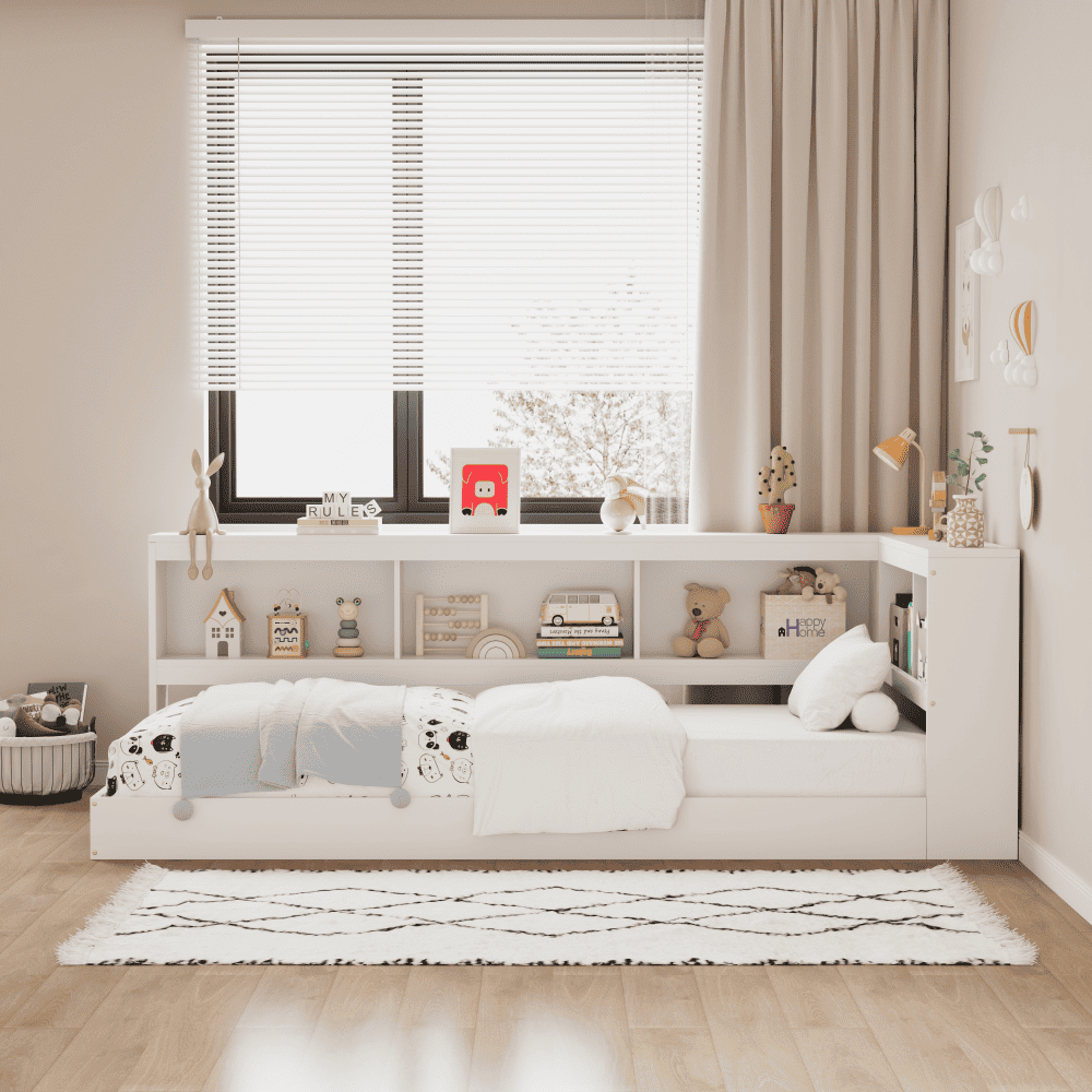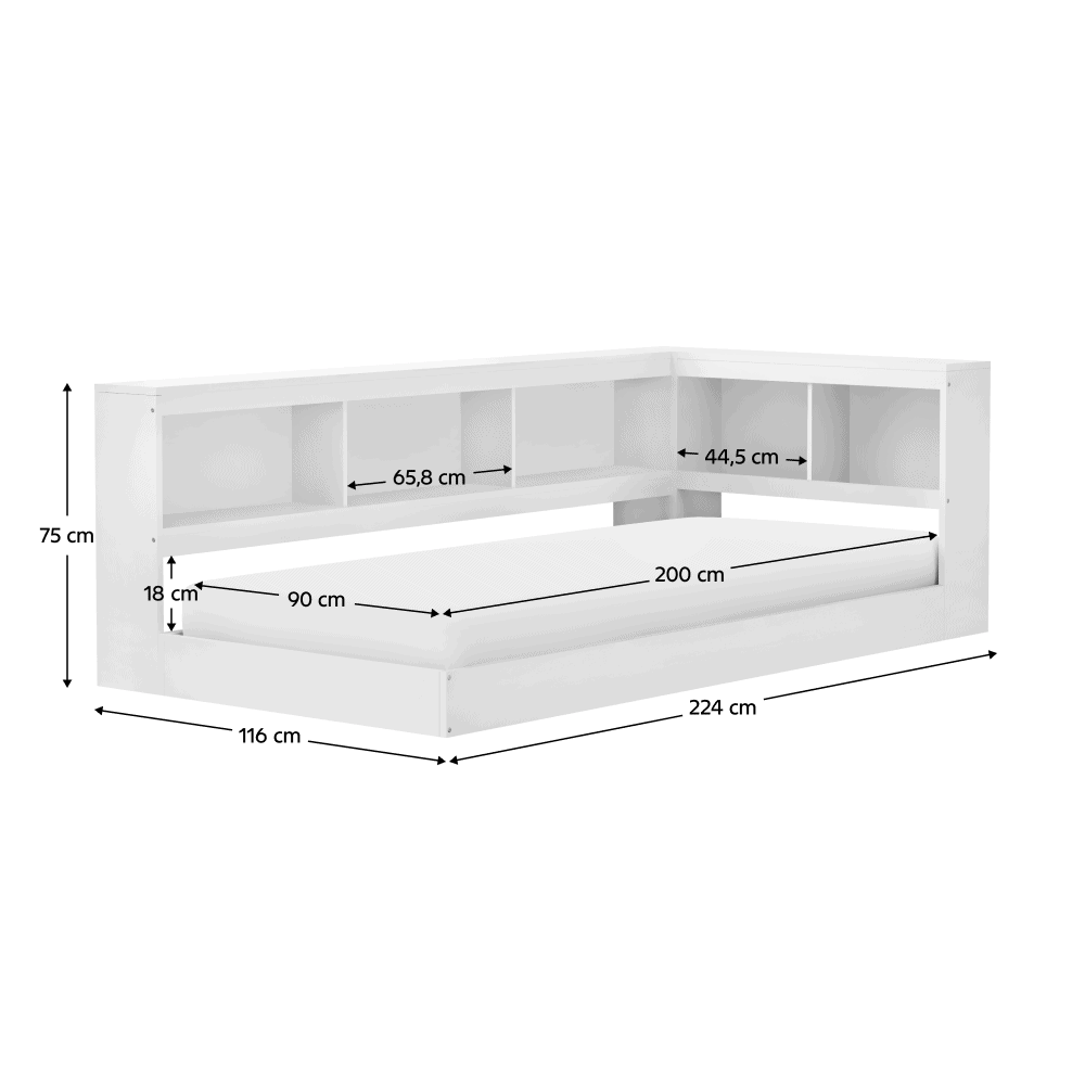 Material: lemn de pin Culoare: alb Dimensiuni (lxAxh): 224x116x75 cm Suprafaţa pentru dormit (lxL): 90×200 cm Grosime material: 2 cm Portanţa pe locul de dormit: 90 kg Spaţiu de depozitare Spaţiu de depozitare deschis Poliţă Portanţa poliţei: 7 kg Portanţa părţii mai lungi a plăcii superioare: 21 kg Portanţa părţii mai scurte a plăcii superioare: 14 kg Livrat cu saltea Somieră roluibilă din placaj Livrat fără saltea Opţiunea de a achiziţiona o saltea din oferta noastră Înălţimea minimă recomandată a saltelei: 14 cm Încastrarea saltelei: 11,5 cm Design modern Practic Livrat dezasamblat