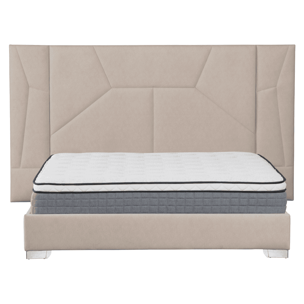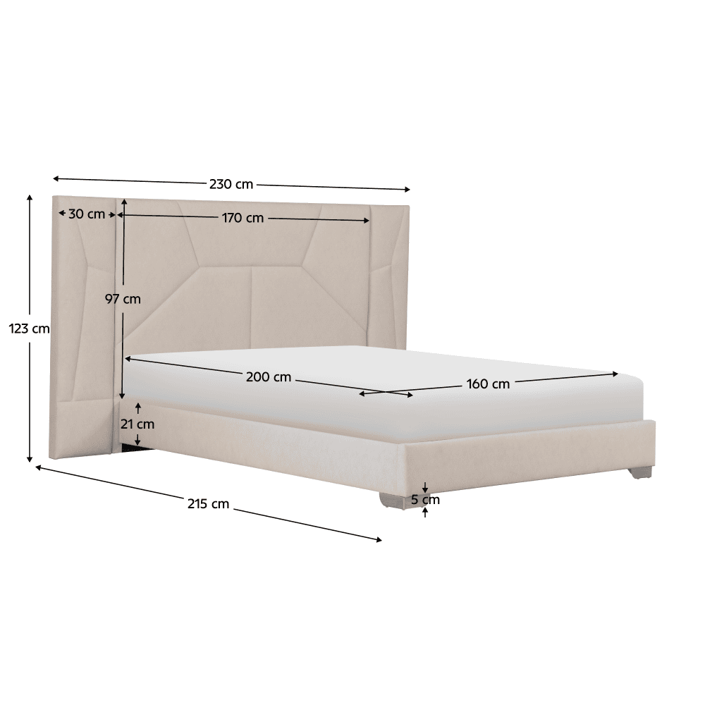 Material: ţesătură Velvet/MDF/placaj Rezistenţa ţesăturii la frecare conform testului Martindale: 25 000 de cicluri de frecare Culoare: bej Dimensiuni (lxAxh): 230x215x123 cm Suprafaţa pentru dormit (lxL): 160×200 cm Înălţimea somierei de la sol: 21,5 cm Înălţimea lateralei: 21 cm Cu tăblie frontală înaltă Frontală matlasată Înălţimea frontalei din spate: 123 cm Grosimea frontalei din spate: 6 cm Grosimea frontalei din faţă: 5 cm Pe picioare Material picioare: plastic Culoare picioare: argintiu Înălţime picioare: 5 cm Livrat cu iluminare LED Număr de culori de iluminare LED: 16 Cu telecomandă Furnizat cu somieră cu lamele Distanţă între lamele: 5,5 cm Livrat fără saltea Opţiunea de a cumpăra o saltea suplimentară din oferta noastră Înălţimea recomandată a saltelei: 15 – 25 cm Încastrarea saltelei: 4,5 cm Design elegant Portanţă pat: 150 kg Livrat dezasamblat