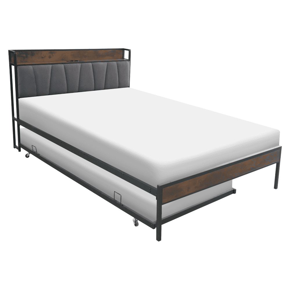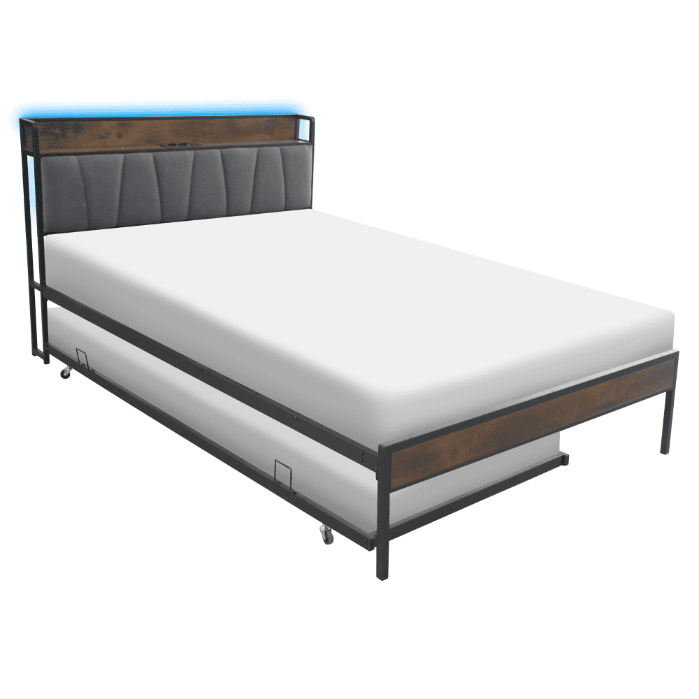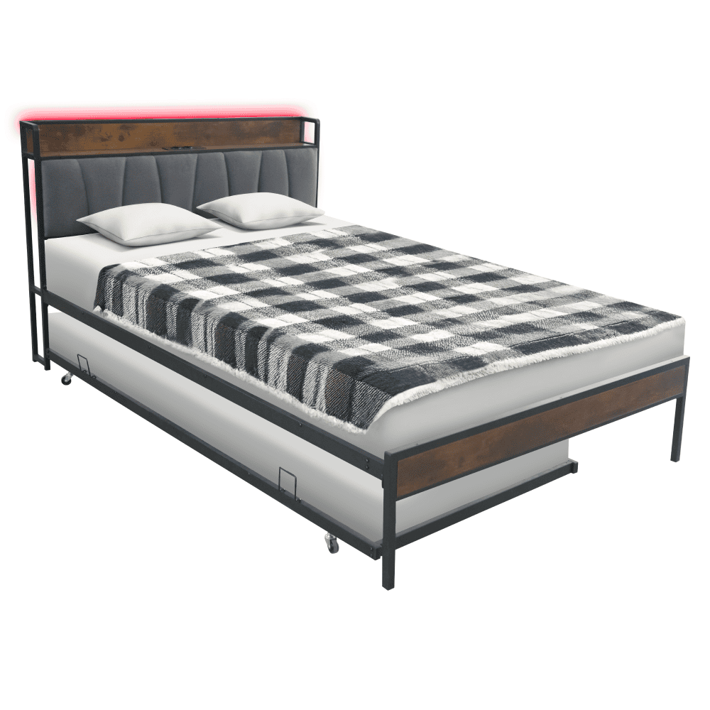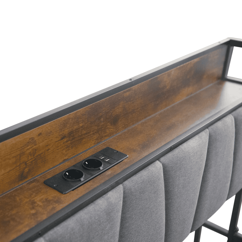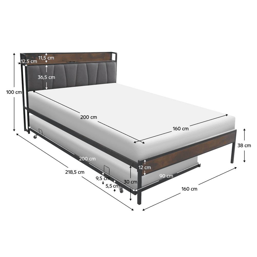 Material: metal/MDF/ţesătură de in Rezistenţa la frecare a ţesăturii conform testului Martindale: 20 000 de cicluri de frecare Culoare: negru/lemn rustic/gri Dimensiuni (lxAxh): 160×218,5×100 cm Suprafaţa pentru dormit (lxL): 160×200 cm Portanţă pe loc de dormit: 150 kg Cu poliţă Portanţă poliţă: 20 kg 2× priză electrică 2× port USB Livrat cu iluminare LED Număr de culori de iluminare LED: 16 Cu telecomandă Livrat cu somieră metalică Livrat fără saltea Recomandăm să cumpăraţi saltea din oferta noastră Înălţimea recomandată a saltelei: 15-20 cm Cu pat suplimentar Portanţă pe pat suplimentar: 200 kg Pe roţi Dimensiuni pat suplimentar (lxAxh): 90x200x9,5 cm Dimensiunea saltelei pentru pat suplimentar: 90×200 cm Înălţimea recomandată a saltelei pentru patul superior: 15-18 cm Stil rustic Livrat dezasamblat