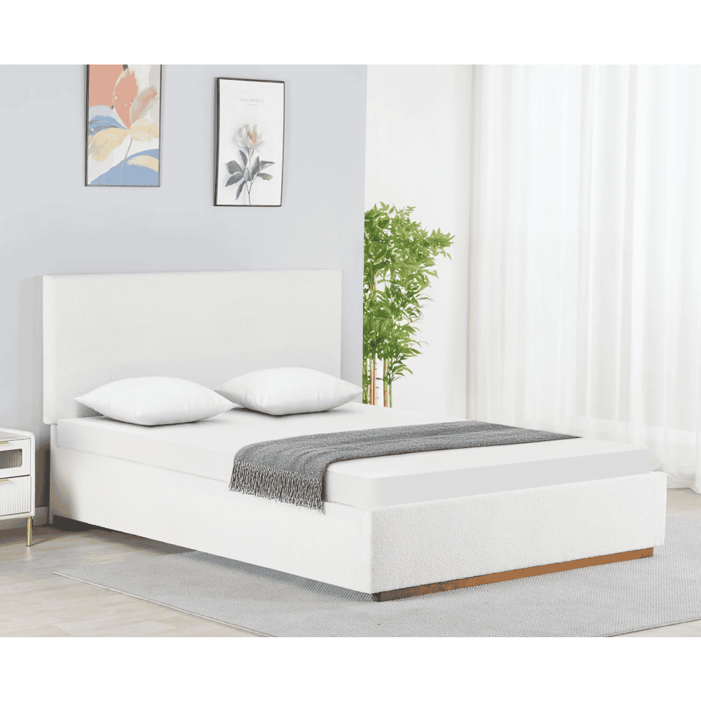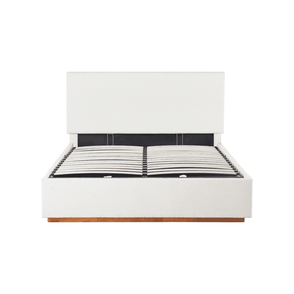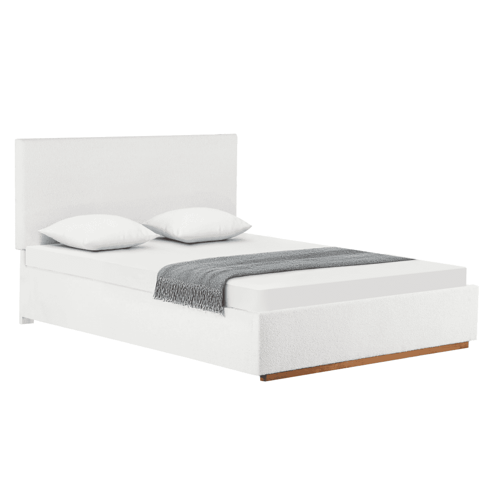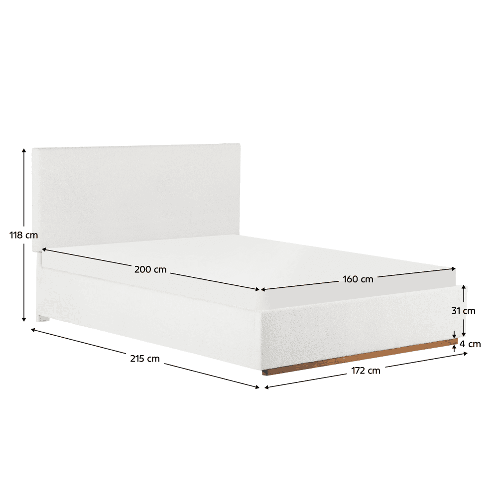 Material: ţesătură Bouclé/MDF/placaj/metal Rezistenţa ţesăturii la frecare conform testului Martindale: 10 000 de cicluri de frecare Culoare: albă Dimensiuni (lxAxh): 172x215x118 cm, Suprafaţa de dormit (lxL): 160×200 cm Înălţimea până la somieră: 33 cm Portanţa pe locul de dormit: 110 kg Cu frontală înaltă Înălţimea frontalei: 31 cm Înălţimea frontalei spate: 118 cm Înălţimea părţii inferioare din lemn: 4 cm Cu spaţiu de depozitare Spaţiul de depozitare nu are fund solid, partea inferioară este acoperită cu material textil Livrat cu somieră batant cu lamele Spaţiu între lamele: 5,5 cm Pistoane pe gaz Livrat fără saltea Opţiunea de a cumpăra o saltea suplimentară din oferta noastră Înălţimea recomandată a saltelei: 20 cm Încastrarea saltelei: 2 cm Design modern Livrat dezasamblat