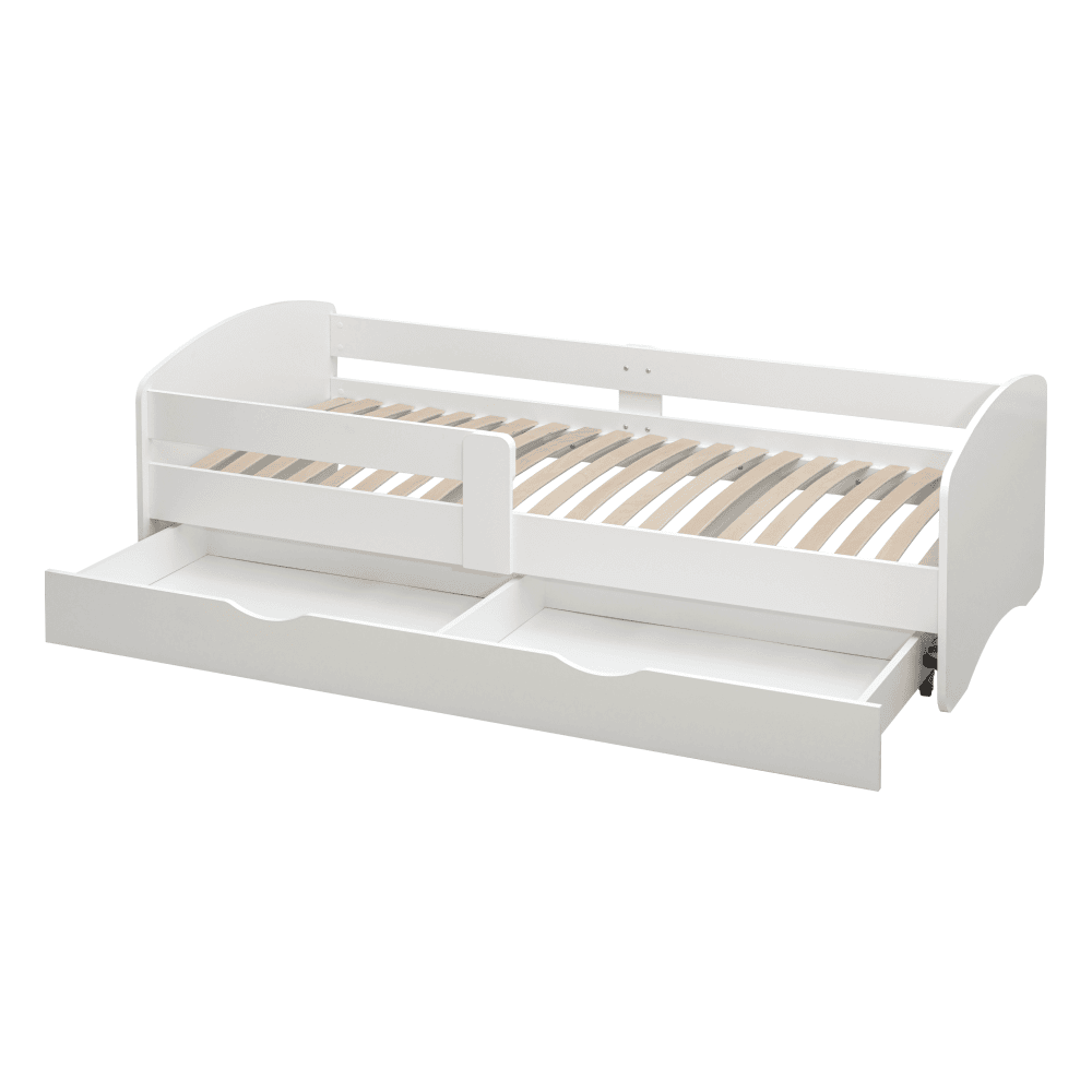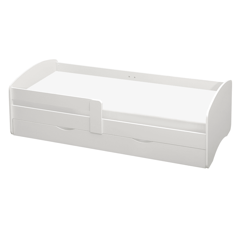 Material: DTD laminat Culoare: albă Dimensiuni (Lxlxh): 165x90x61 cm Dimensiuni spaţiu de dormit (Lxl): 80×160 cm Grosime material: 1,8 cm Posibilitatea de a monta bariera pe partea stângă sau dreaptă Modern şi practic Cu spaţiu de depozitare Spaţiu de depozitare pe roţi Două sertare Greutate: 47 kg Portanţa: 60 kg Livrat cu somieră cu lamele Livrat fără saltea Înălţimea recomandată a saltelei: 13 cm