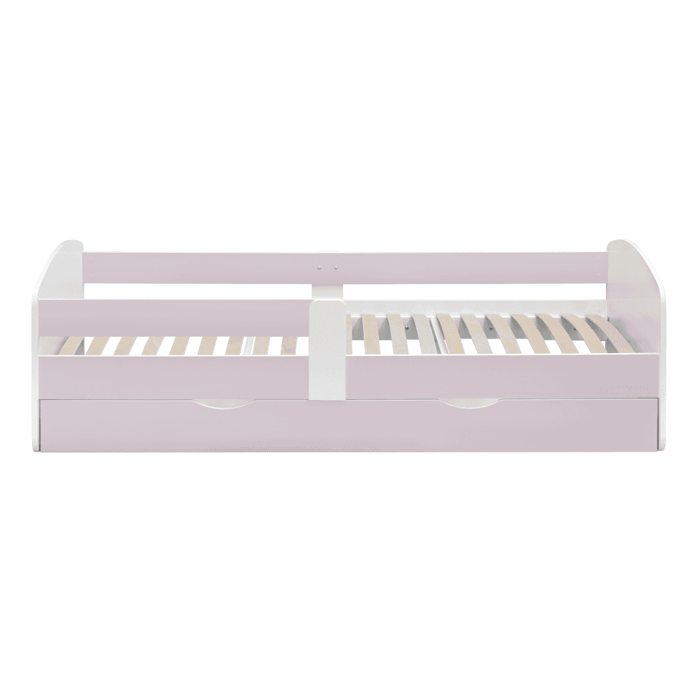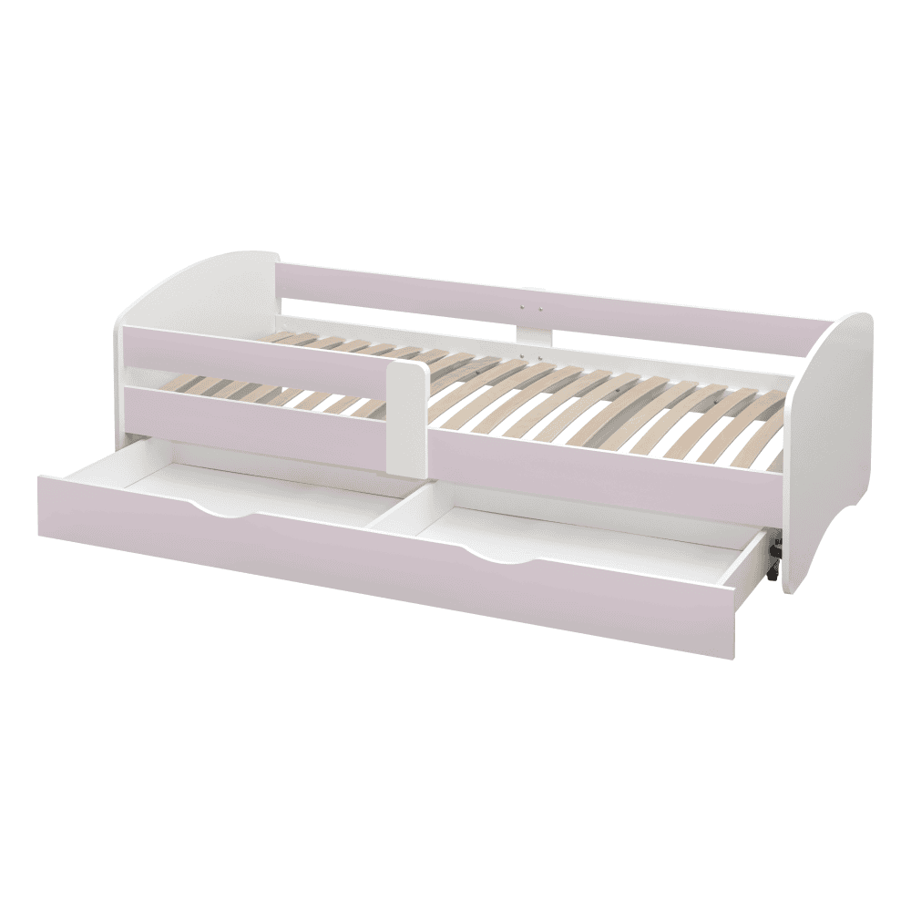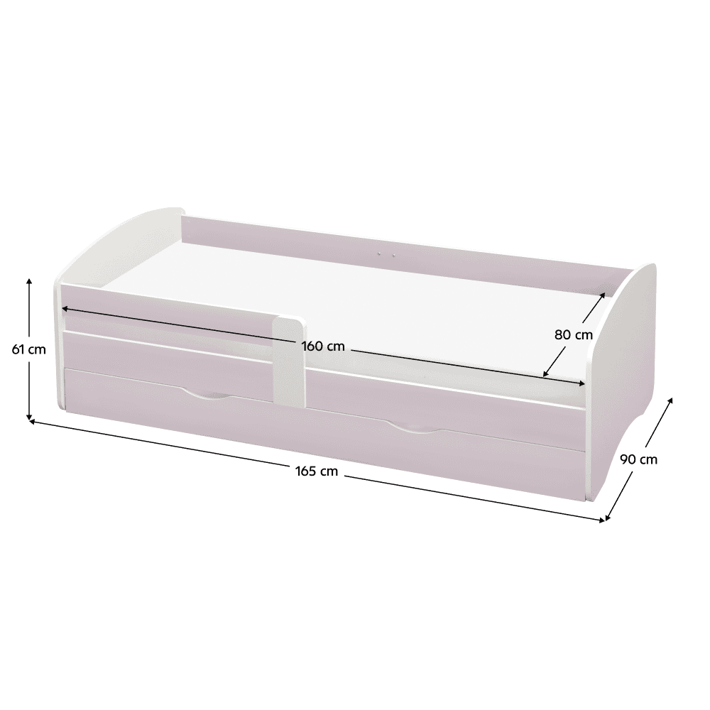 Material: DTD laminat Culoare: albă/roz Dimensiuni (Lxlxh): 165x90x61 cm Dimensiuni spaţiu de dormit (Lxl): 80×160 cm Grosime material: 1,8 cm Posibilitatea de a monta bariera pe partea stângă sau dreaptă Modern şi practic Cu spaţiu de depozitare Spaţiu de depozitare pe roţi Două sertare Greutate: 47 kg Portanţa: 60 kg Livrat cu somieră cu lamele Livrat fără saltea Înălţimea recomandată a saltelei: 13 cm