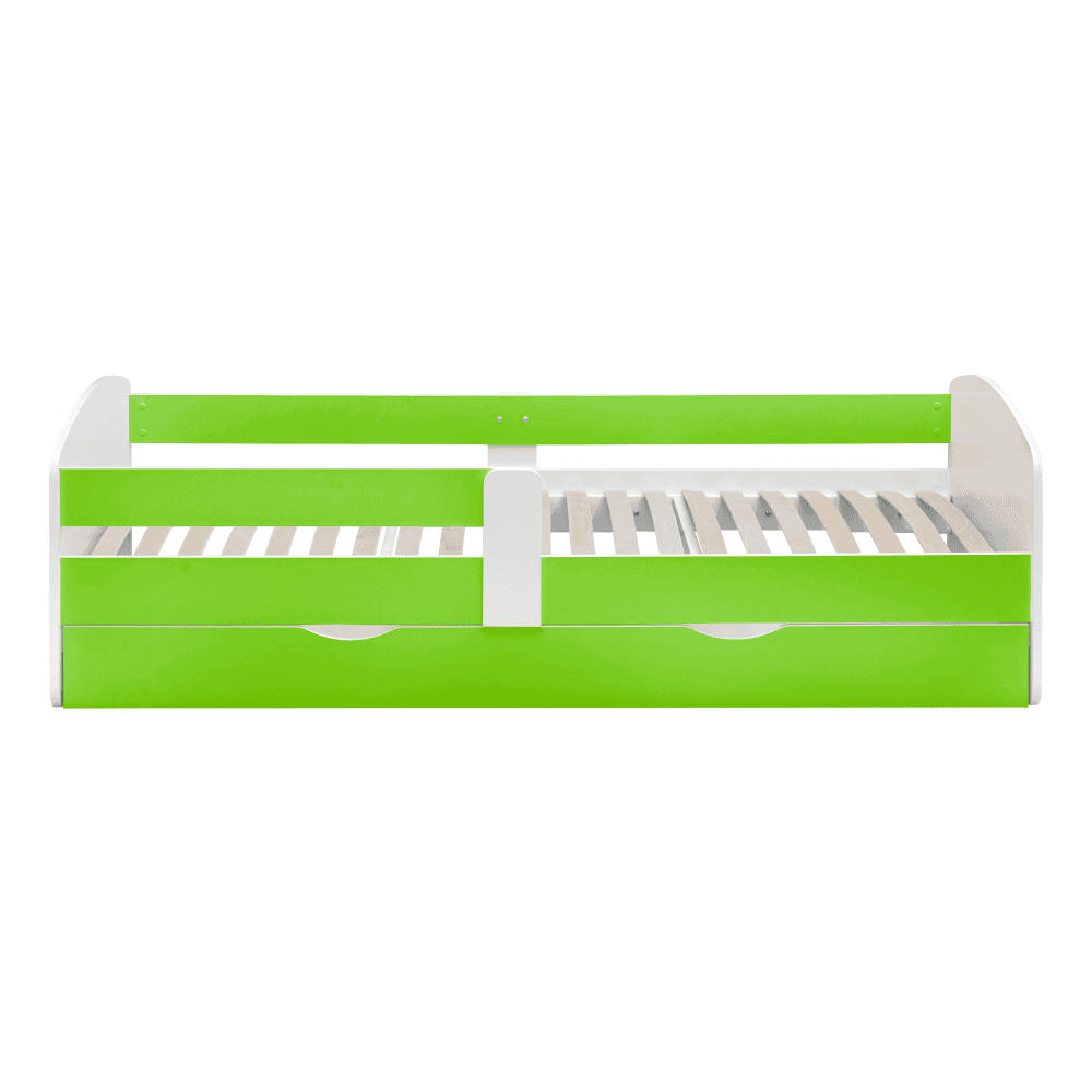 Material: DTD laminat Culoare: alb/verde Dimensiuni (Lxlxh): 165x90x61 cm Dimensiuni spaţiu de dormit (Lxl): 80×160 cm Grosime material: 1,8 cm Posibilitatea de a monta bariera pe partea stângă sau dreaptă Modern şi practic Cu spaţiu de depozitare Spaţiu de depozitare pe roţi Două sertare Greutate: 47 kg Portanţa: 60 kg Livrat cu somieră cu lamele Livrat fără saltea Înălţimea recomandată a saltelei: 13 cm