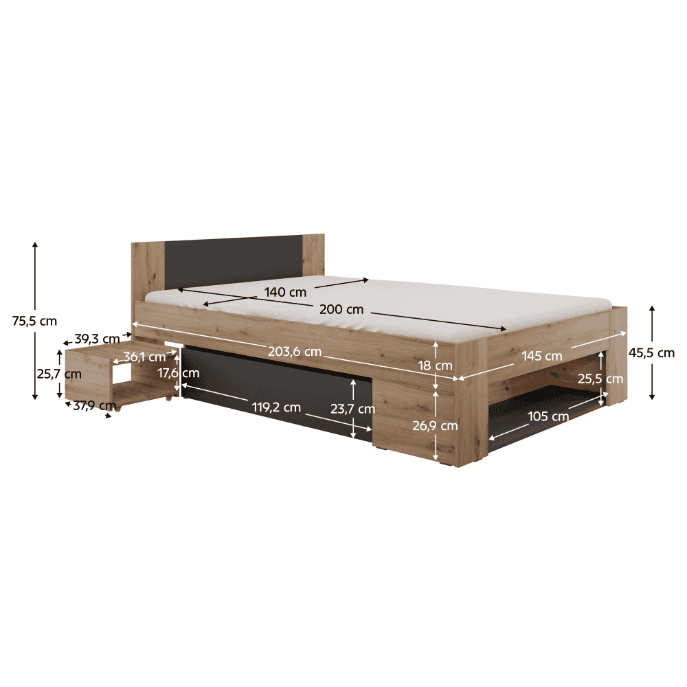 Material: DTD laminat Culoare: stejar artisan/antracit Dimensiuni (lxAxh): 145×203,6×75,5 cm Suprafaţa pentru dormit (lxL): 140×200 cm Grosime DTD laminat: 1,6-1,8 cm Înălţimea lateralei: 18 cm Înălţimea minimă recomandată a saltelei: 14 cm Portanţă per persoană: 90 kg 2x spaţiu de depozitare pe roţi 2x noptieră pe roţi Glisoare din plastic Înălţimea glisoarelor din plastic: 0,5 cm Livrat fără somieră şi saltea Opţiunea de achiziţionare somieră şi saltea din oferta noastră Design modern Livrat dezasamblat