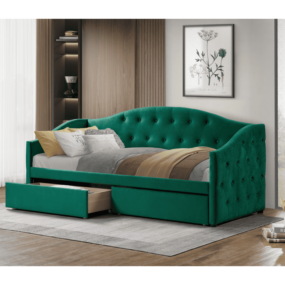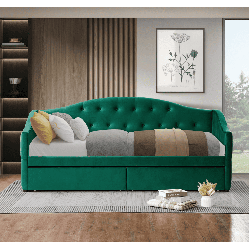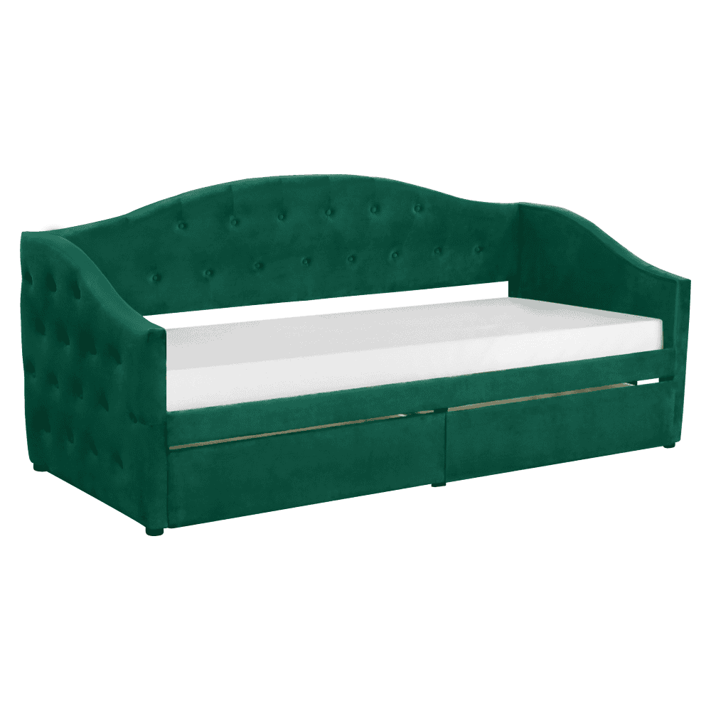 Material: ţesătură catifea/DTD/MDF/furnir laminat Rezistenţa la abraziune a ţesăturii conform testului Martindale: 70 000 de cicluri de frecare Culoare: verde Dimensiuni (Lxlxh): 217x95x95 cm Suprafaţa pentru dormit (Lxl): 90×200 cm Tapiţată Spaţiu de depozitare Două sertare Dimensiunea sertarului interior (Lxlxh): 37×91,4×14,8 cm Portanţa sertarului: 5 cm Portanţa pe loc de dormit: 150 kg Livrat cu 2 somierăe cu lamele Înălţimea somierei de la sol: 36,5 cm Livrat fără saltea Vă recomandăm să cumpăraţi o saltea din oferta noastră Înălţimea recomandată a saltelei:18 cm Laturi şi cap de pat decorative cusute Pe picioare Livrat dezasamblat
