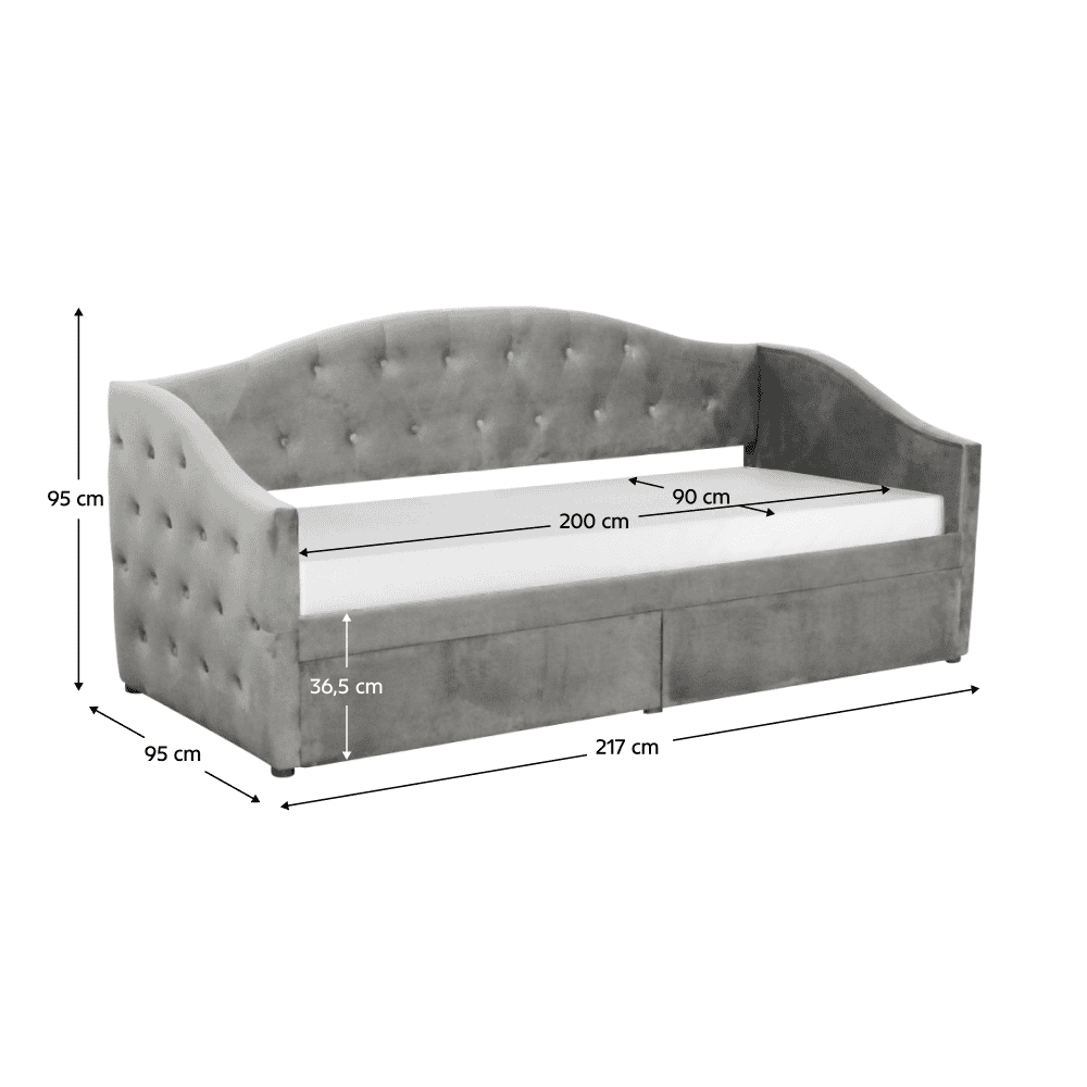 Material: ţesătură catifea/DTD/MDF/furnir laminat Rezistenţa la abraziune a ţesăturii conform testului Martindale: 70.000 de cicluri de frecare Culoare: gri Dimensiuni (Lxlxh): 217x95x95 cm Suprafaţa pentru dormit (Lxl): 90×200 cm Tapiţată Spaţiu de depozitare Două sertare Dimensiunea sertarului interior (Lxlxh): 37×91,4×14,8 cm Portanţa sertarului: 5 cm Portanţa pe loc de dormit: 150 kg Livrat cu 2 somierăe cu lamele Înălţimea somierei de la sol: 36,5 cm Livrat fără saltea Vă recomandăm să cumpăraţi o saltea din oferta noastră Înălţimea recomandată a saltelei:18 cm Laturi şi cap de pat decorative cusute Pe picioare Livrat dezasamblat