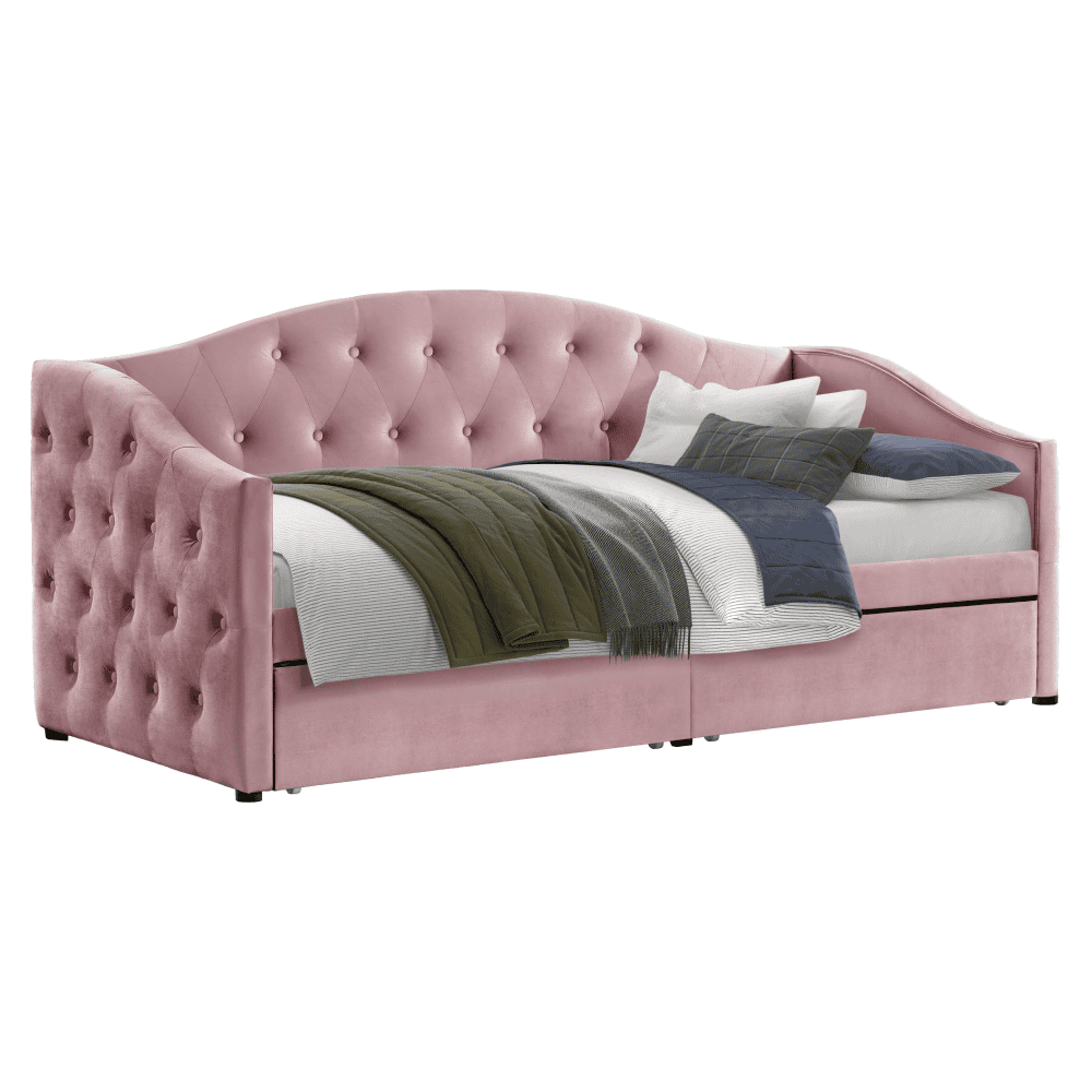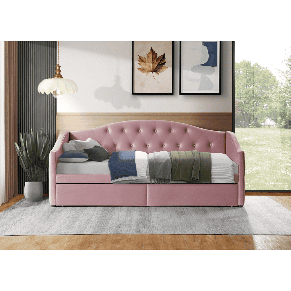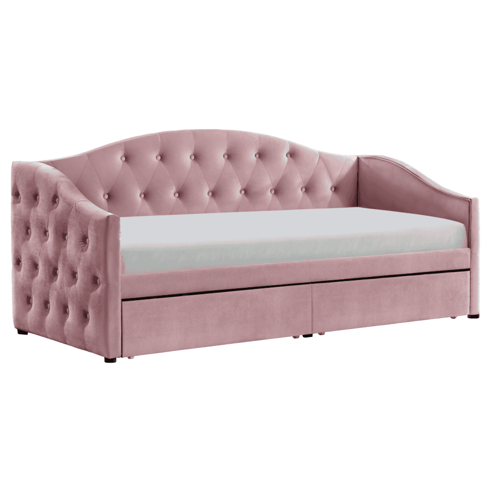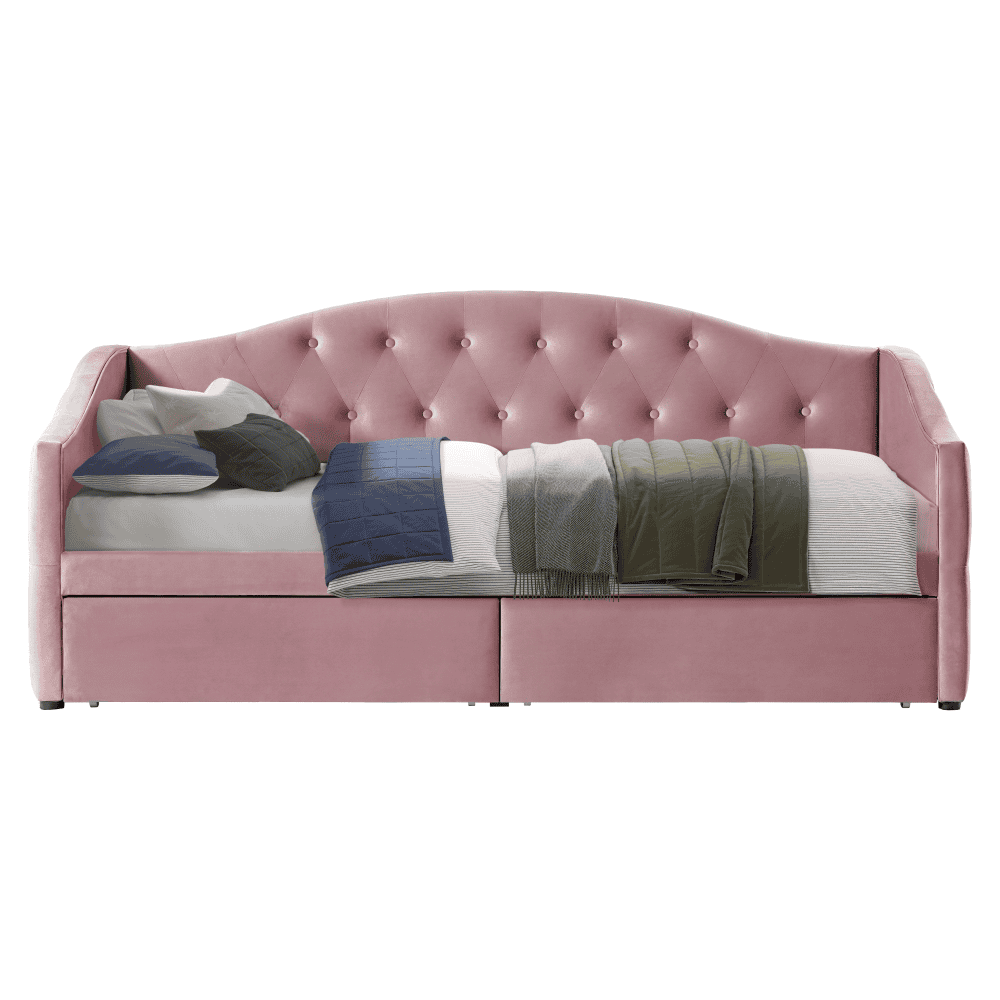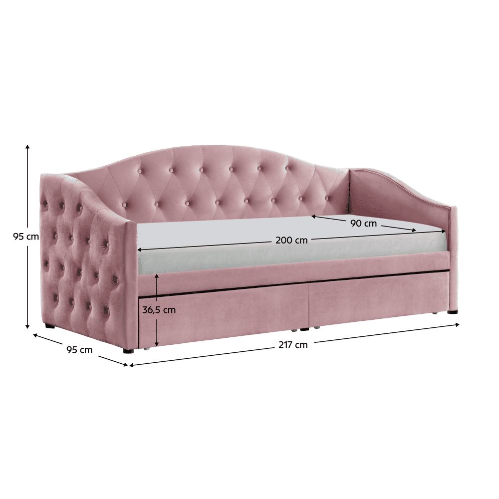 Material: ţesătură catifea/DTD/MDF/furnir laminat Rezistenţa la abraziune a ţesăturii conform testului Martindale: 70.000 de cicluri de frecare Culoare: roz Dimensiuni (Lxlxh): 217x95x95 cm Suprafaţa pentru dormit (Lxl): 90×200 cm Tapiţată Spaţiu de depozitare Două sertare Dimensiunea sertarului interior (Lxlxh): 37×91,4×14,8 cm Portanţa sertarului: 5 cm Portanţa pe loc de dormit: 150 kg Livrat cu 2 grătare cu lamele Înălţimea grătarului de la sol: 36,5 cm Livrat fără saltea Vă recomandăm să cumpăraţi o saltea din oferta noastră Înălţimea recomandată a saltelei: 18 cm Laturi şi cap de pat decorative cusute Pe picioare Livrat dezasamblat