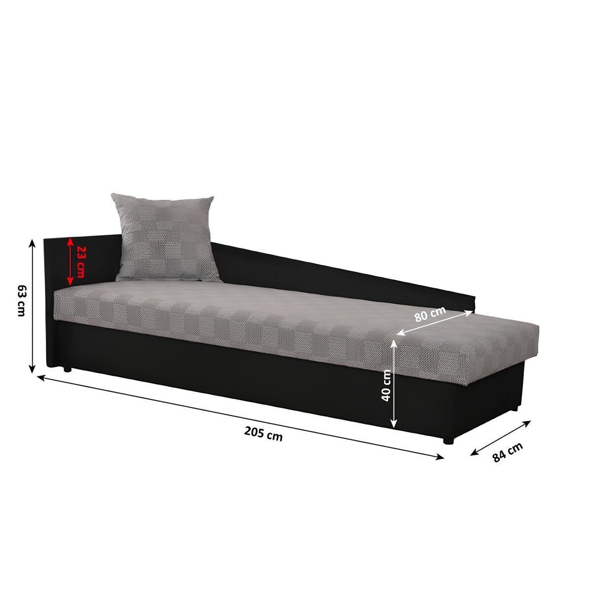 dimensiuni: LxÎxG: 205x63x84 cm, spaţiu pentru dormit: LxL: 80×200 cm, înălţime x adâncimea şezutului: 40×80 cm.