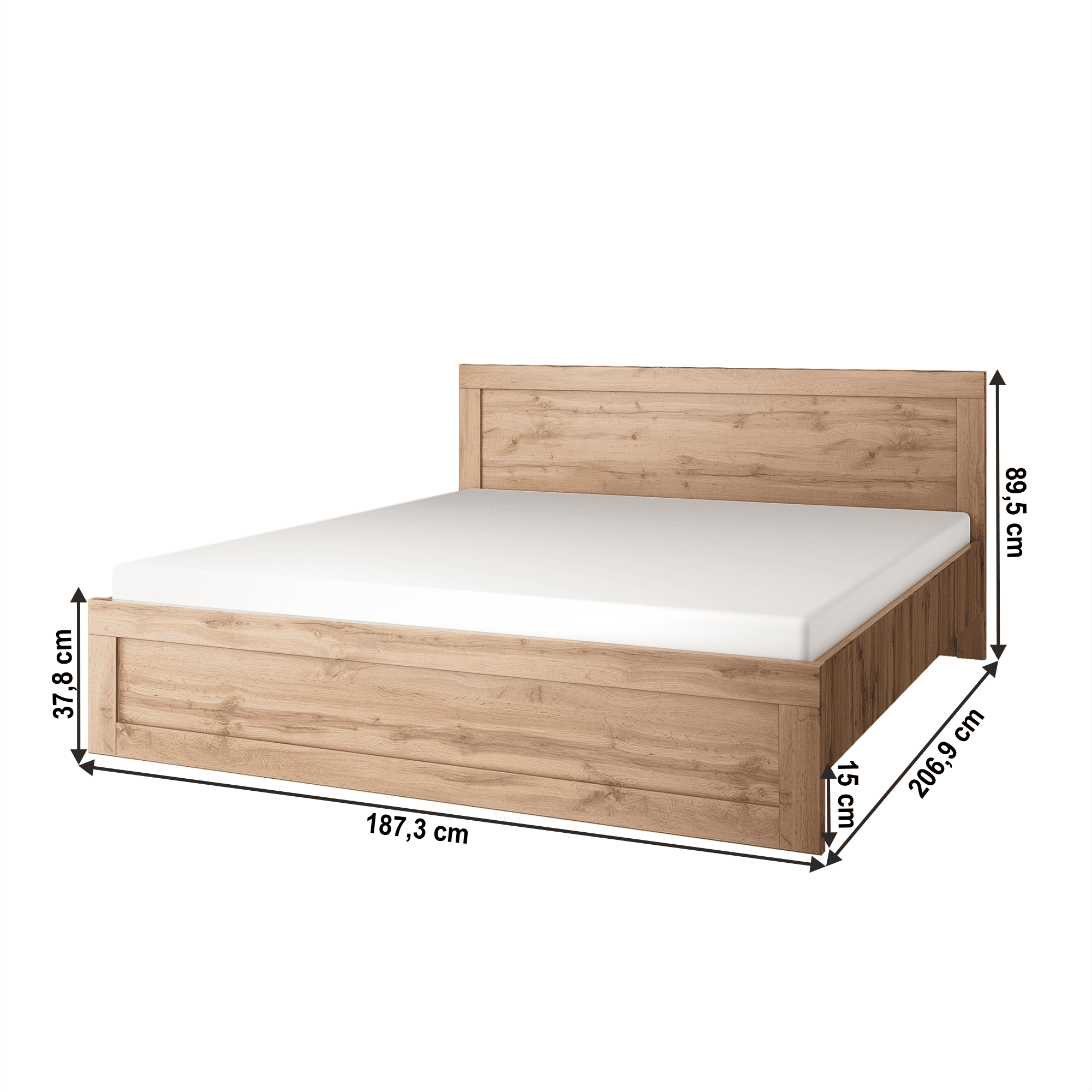 Pat matrimonial MORATIZ 180 Material: DTD laminat Culoare: stejar wotan Dimensiuni (LxlxÎ): 187,3×206,9×89,5 cm Grosimea materialului: 1,6 – 2,2 cm Înălţimea minimă recomandată a saltelei: 10 cm Înălţime de la podea: 15 cm Capacitatea de încărcare pe persoană: 100 kg Fără spaţiu de depozitare