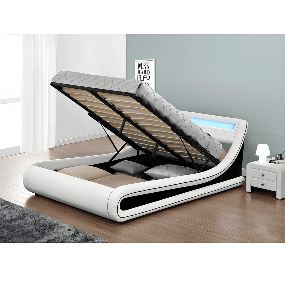 Pat matrimonial modern, cu spaţiu pentru depozitare, somieră rabatabilă şi iluminare RGB LED în tăblia patului.