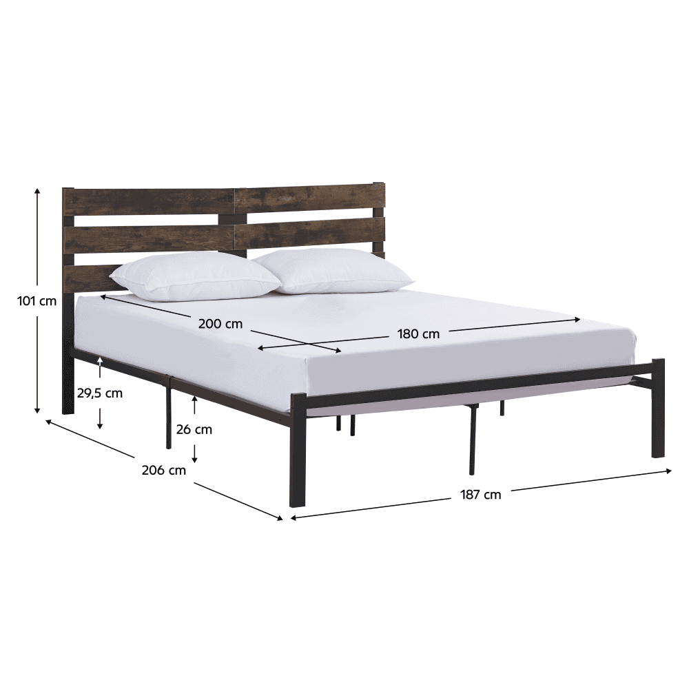 Material: metal/DTD Culoare: negru/stejar rustic Dimensiuni (lxAxh): 187x206x101 cm Suprafaţa de dormit (lxL): 180×200 cm Înălţimea până la somieră: 29,5 cm Portanţă: 300 kg. Cu picioare. Înălţime picioare: 26 cm Livrat cu somieră cu şipci Livrat fără saltea Opţiunea de a cumpăra saltele din oferta noastră Înălţimea recomandată a saltelei: 20 cm Stil rustic Livrat dezasamblat