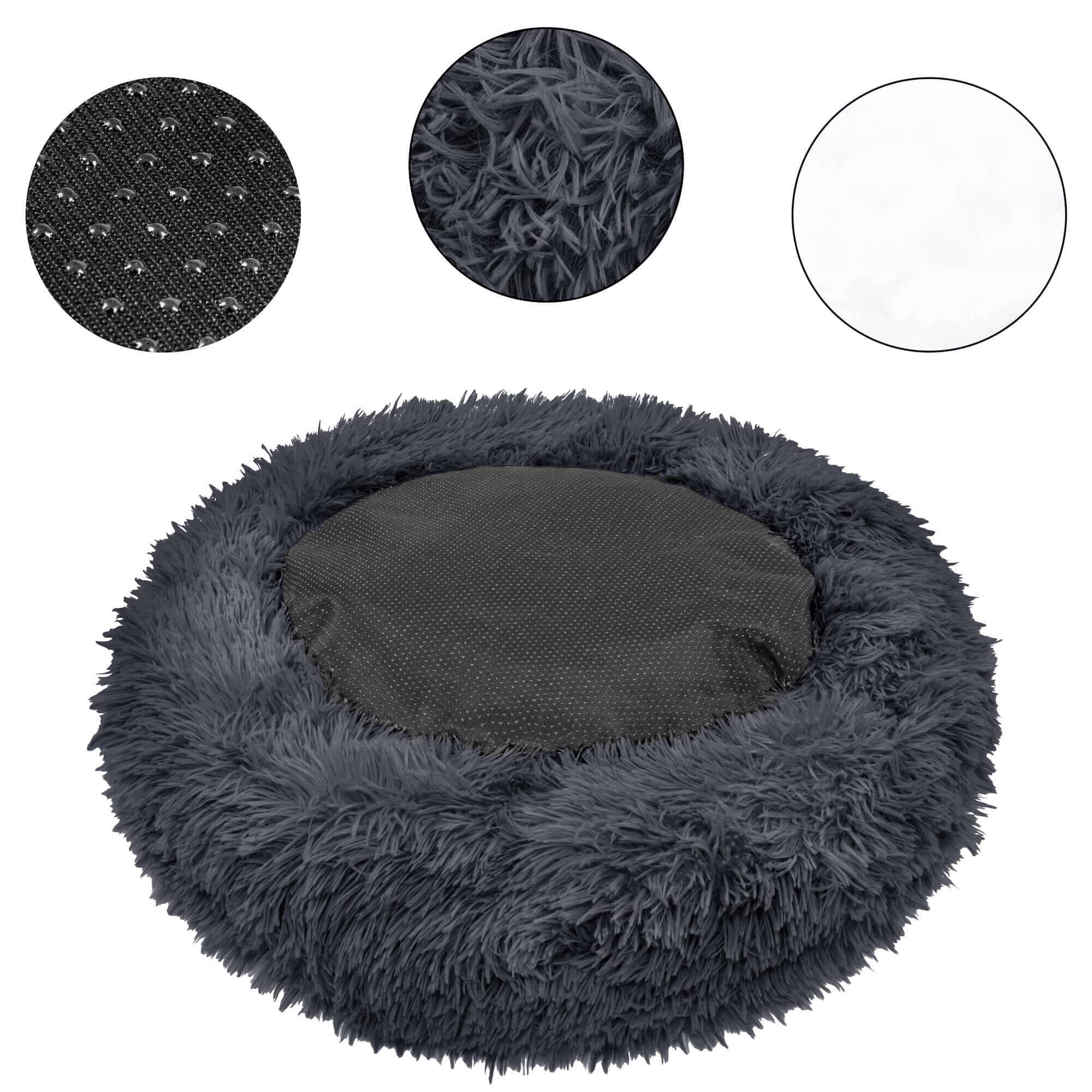 Material: poliester Culoare: gri inchis Forma: rotunda Diametru: 40 cm Potrivit pentru catei/pisici cu talie: mai mica de 2.5 kg Baza antiderapanta Acest pat pufos pentru catei si pisici va oferi animalului de companie un loc confortabil pentru odihna si somn. Materialul extrem de placut si pufos ofera un confort extraordinar, oferind in acelasi timp cainilor sau pisicilor un colt cald si sigur. Culcusul prezentat va fi un loc din care animalul tau de companie nu va dori sa se miste! Structura placuta, moale Materialul din care a fost facut patul va permite fiecarui animal de companie sa se simta confortabil si placut. Puful lung, extrem de placut la atingere, va infasoara animalul de companie, mentinandu-l cald. In plus, materialul moale si delicat nu va irita pielea sau parul unui caine sau al unei pisici. Fundul antiderapant, lipit ferm de sol Un mare avantaj al patului este baza sa, care este echipata cu proeminente antiderapante, datorita careia acesta nu aluneca pe podea. Acest element asigura faptul ca produsul se lipeste de podea stabil si nu se misca atunci cand animalul de companie se aseaza in el. Potrivit pentru a fi spalat in masina Dupa cum stiti, animalelor de companie le place adesea sa se murdareasca si astfel pot murdari culcusul. Prin urmare, producatorul s-a asigurat ca acesta poate fi reimprospatat cu usurinta. Tot ce trebuie sa faceti este sa indepartati bumbacul de umplutura – ascuns in spatele fermoarului din partea de jos – si sa spalati patul la 30 de grade. In plus, posibilitatea de a patrunde in interiorul produsului permite inlocuirea umplerii acestuia. Atentie! Umplutura nu poate fi spalata! Functionalitatea merge mana in mana cu un aspect atragator Patul pufos nu este doar un element confortabil al spatiului animalului de companie, ci si un plus de design la interior. Culoarea frumoasa, manopera solida si forma atractiva fac ca produsul sa arate elegant si eficient. AVANTAJE fabricat dintr-un material placut de inalta calitate, posibilitatea de spalare la 30 de grade, umplutura moale, inlocuibila din vata, fundul antiderapant mentine patul intr-un singur loc, forma usoara care usureaza transportul, culori frumoase, la moda