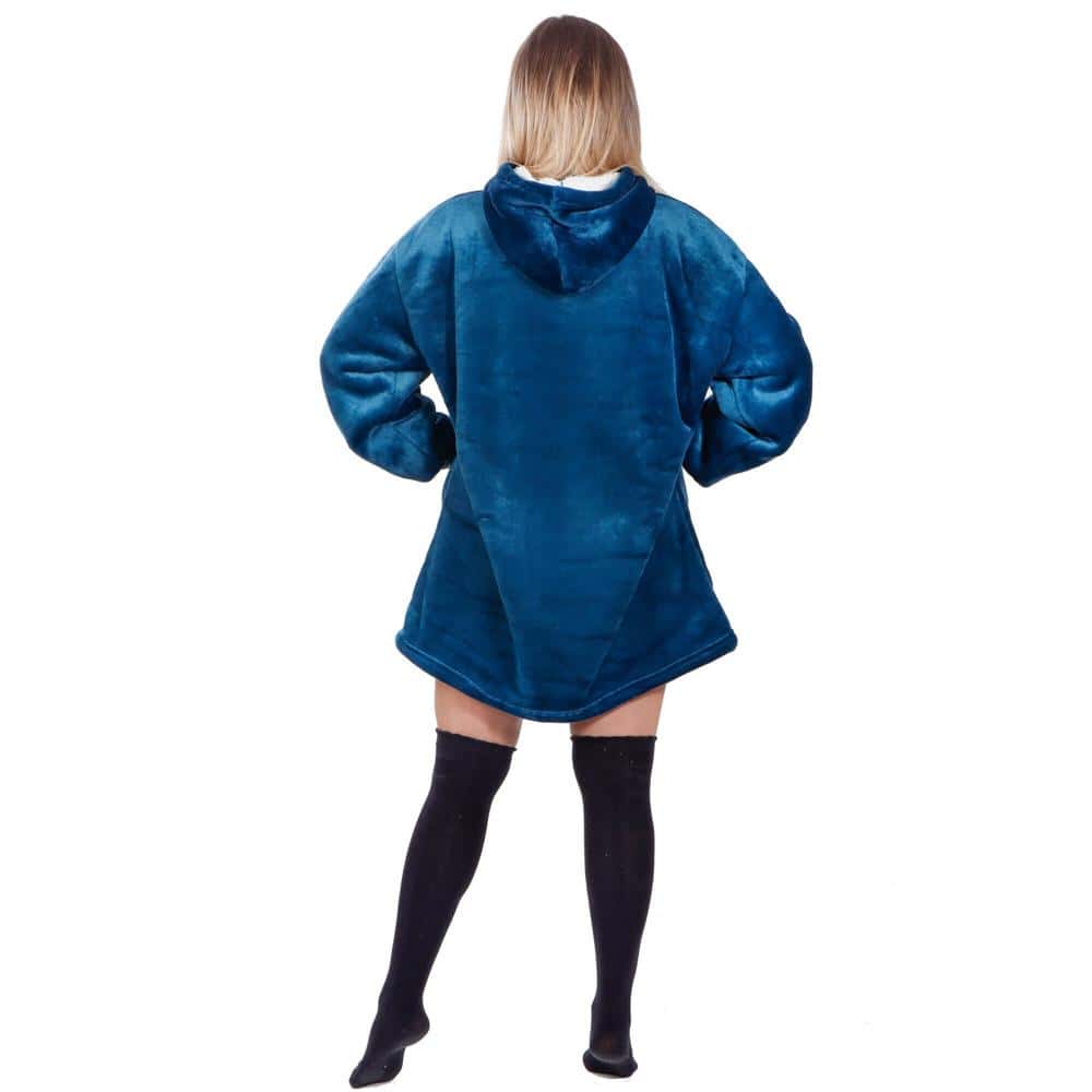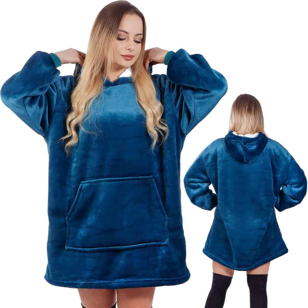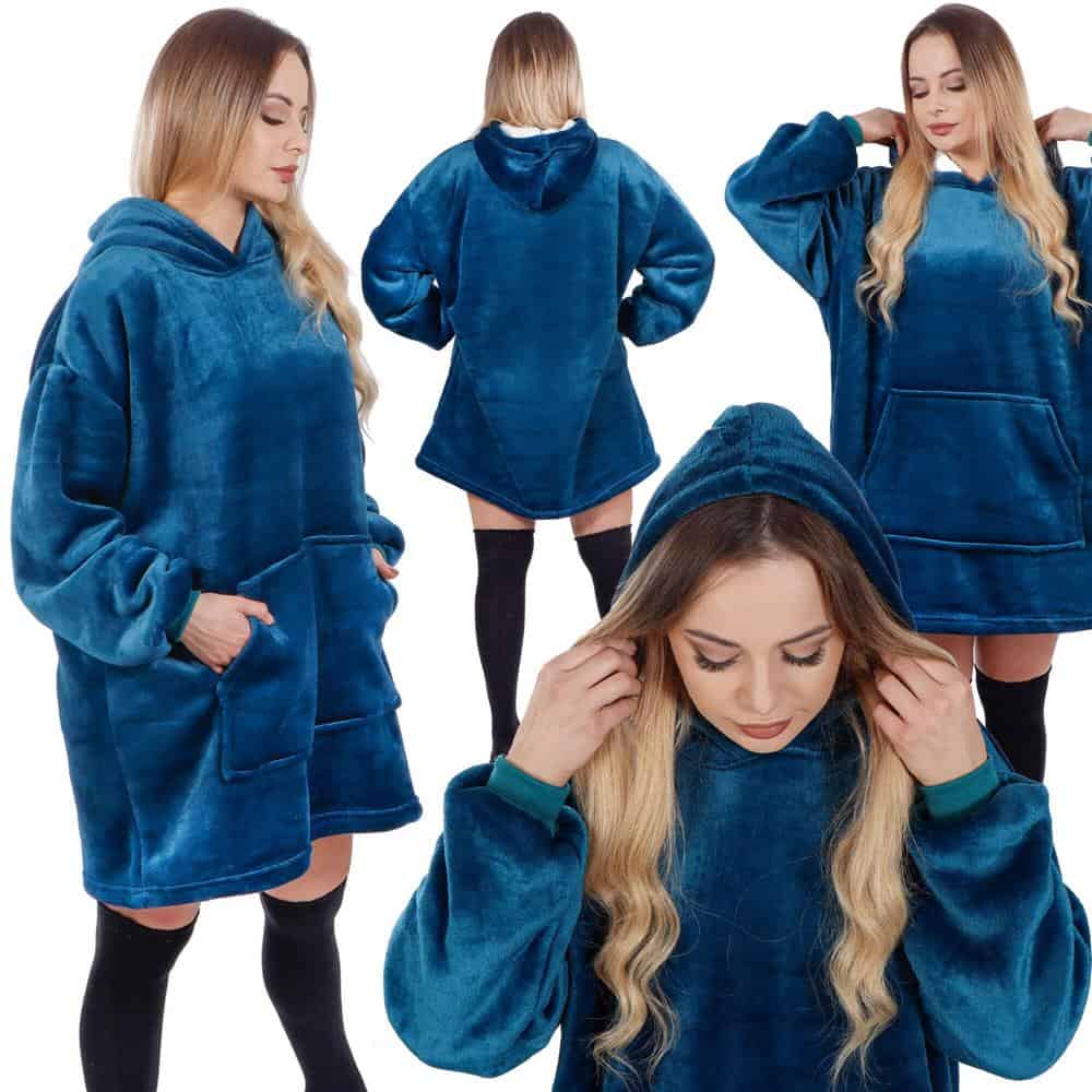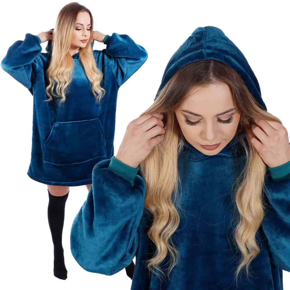 Patura tip hanorac, cu maneci, gluga si buzunare, material plus, marime universala, albastra Mob360 – produs disponibil în magazinul Mob360.
