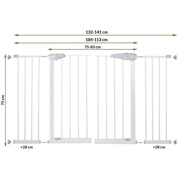 - Poarta de siguranta 76-85cm Extensie pentru poarta de 28 cm Extensie pentru poarta de 28 cm Manual de utilizare Poarta este sigura si solida pentru copii sau pentru animale de dimensiuni mici si medii. Poarta poate separa anumite zone din casa care sunt periculoase pentru copiii nostri. Protejeaza scarile sau usile de intrarea necontrolata a copiilor. Poarta este fixata cu ajutorul unor suruburi speciale, ceea ce face ca montarea si demontarea sa fie extrem de usoara si rapida. Inchidere automata – acesta este un mecanism de autoinchidere a usii atunci cand este deschisa, deosebit de util atunci cand mainile noastre sunt ocupate.Dubla securitate – impiedica deschiderea usii de catre un copil. Mecanism de blocare – atunci cand este deschisa la un unghi mai mare de 90 de grade, usa va ramane deschisa in permanenta pentru a preveni inchiderea necontrolata. Sistem stretchkeep – poarta nu trebuie sa fie insurubata de perete, deoarece presiunea portii face ca aceasta sa se tina singura pe loc. Puteți monta această poartă conform următoarelor dimensiuni: 76-85 cm, 104-113 cm, 132 -141 cm