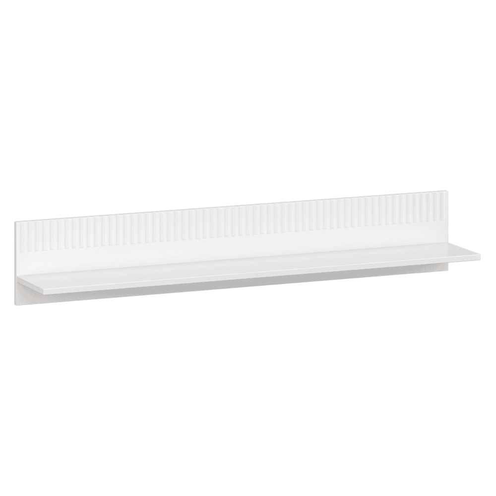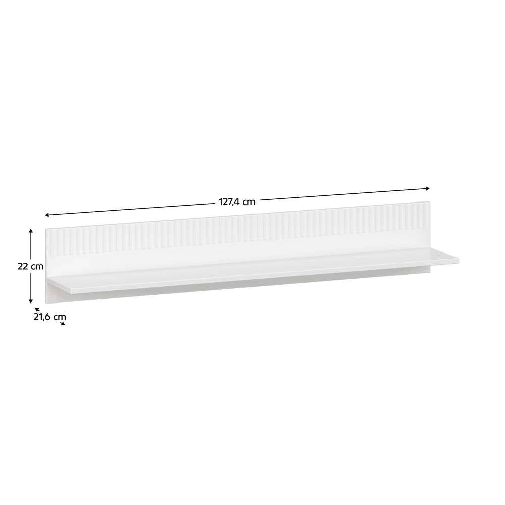Material: DTD laminat/MDF înfoliat/PVC Culoare: albă Dimensiuni (lxAxh): 127,4×21,6×22 cm Grosimea materialului: 1,6 cm De perete Portanţă poliţă: 8 kg Design modern Vă recomandăm să fixaţi mobilierul de perete Livrată dezasamblată