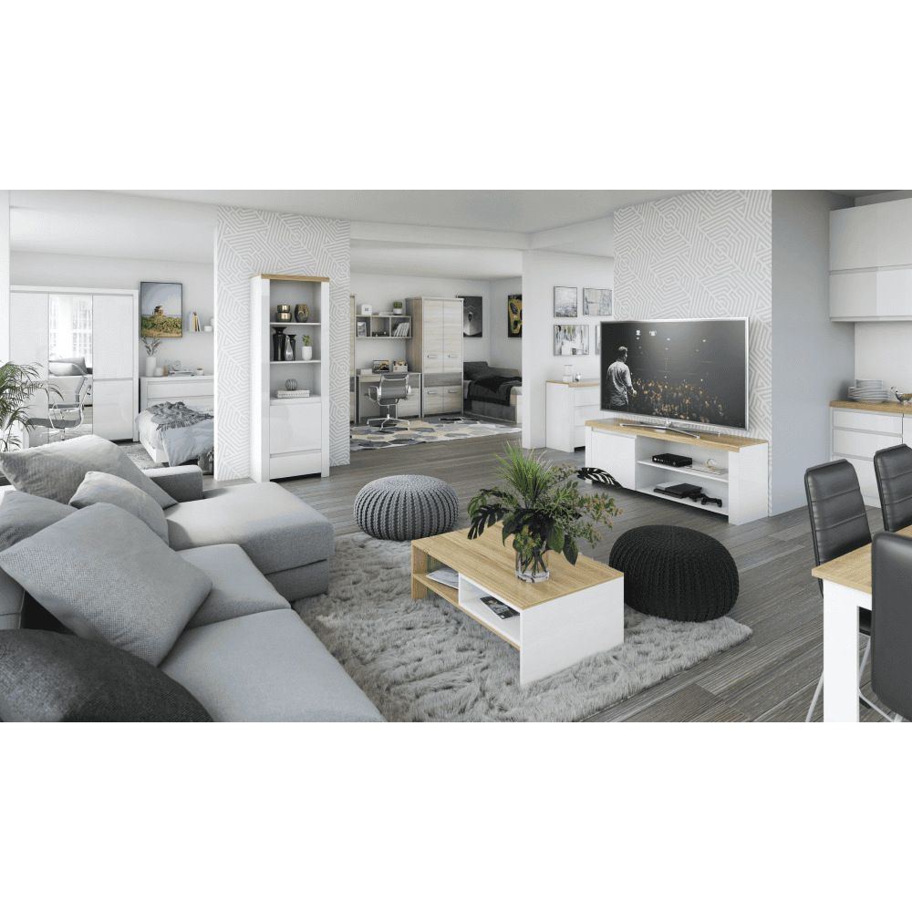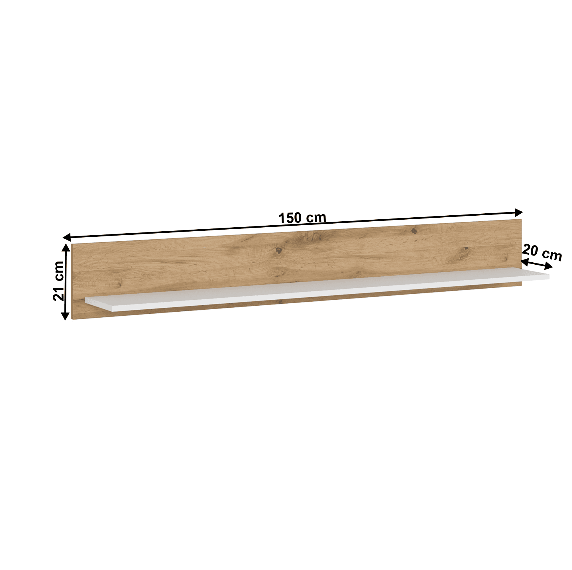 Material: DTD laminat/ canturi ABS Culoare: alb/ stejar wotan Dimensiuni (LxAxÎ): 150x20x21 cm Grosimea materialului: 1,6 până la 2,2 cm Greutate maximă suportată: 2 kg Spaţiu de depozitare deschis Canturi ABS Livrat dezasamblat