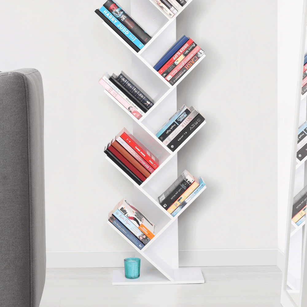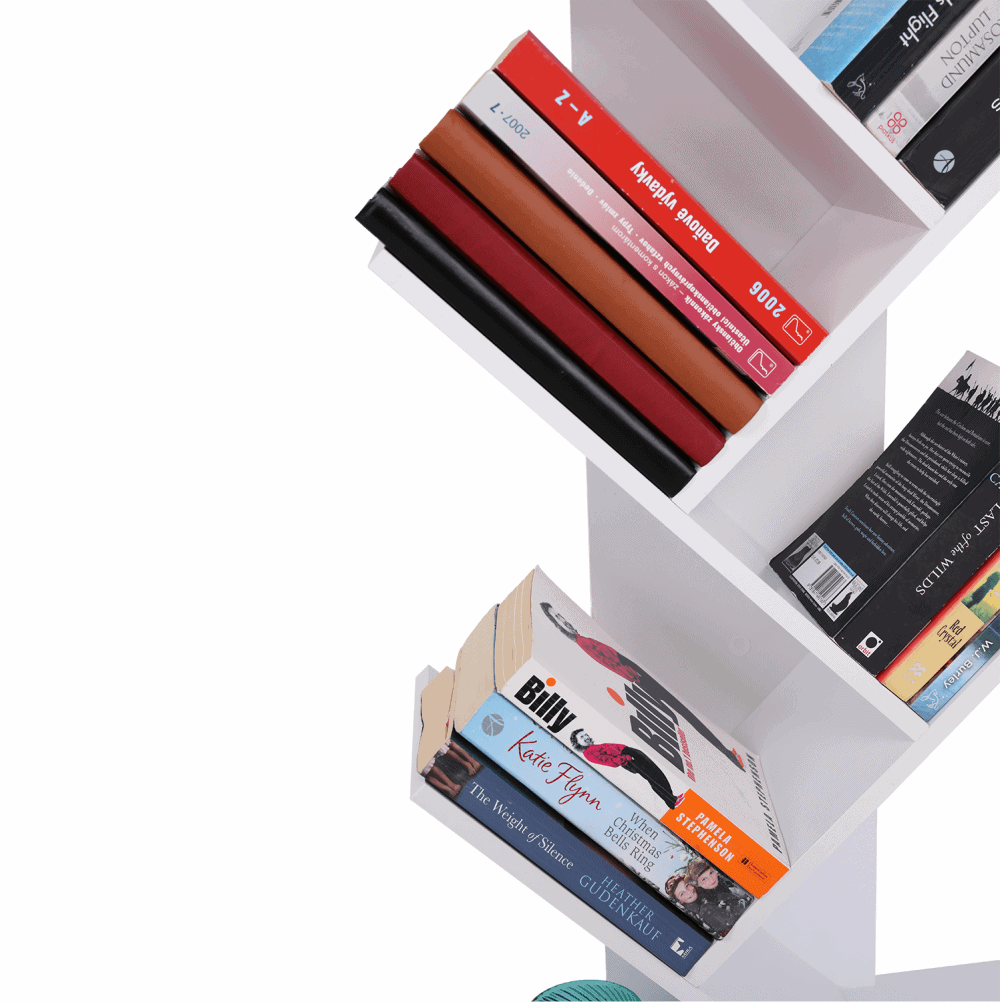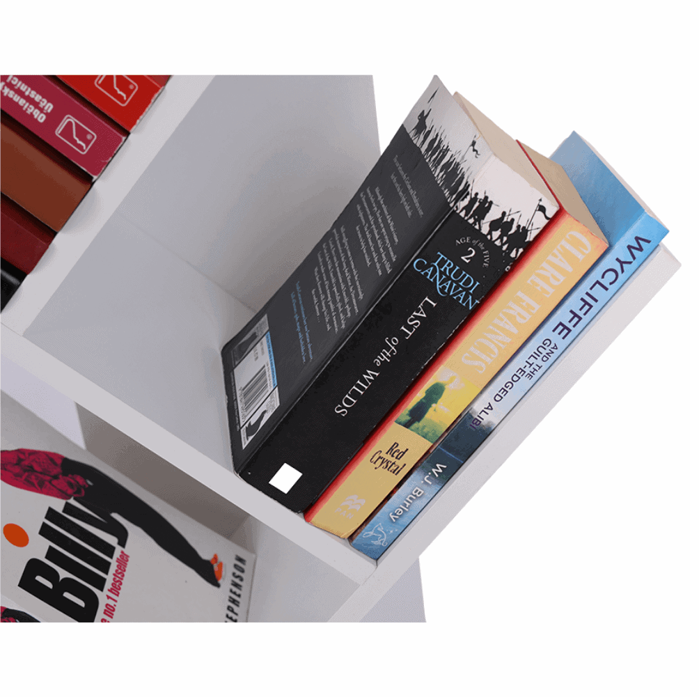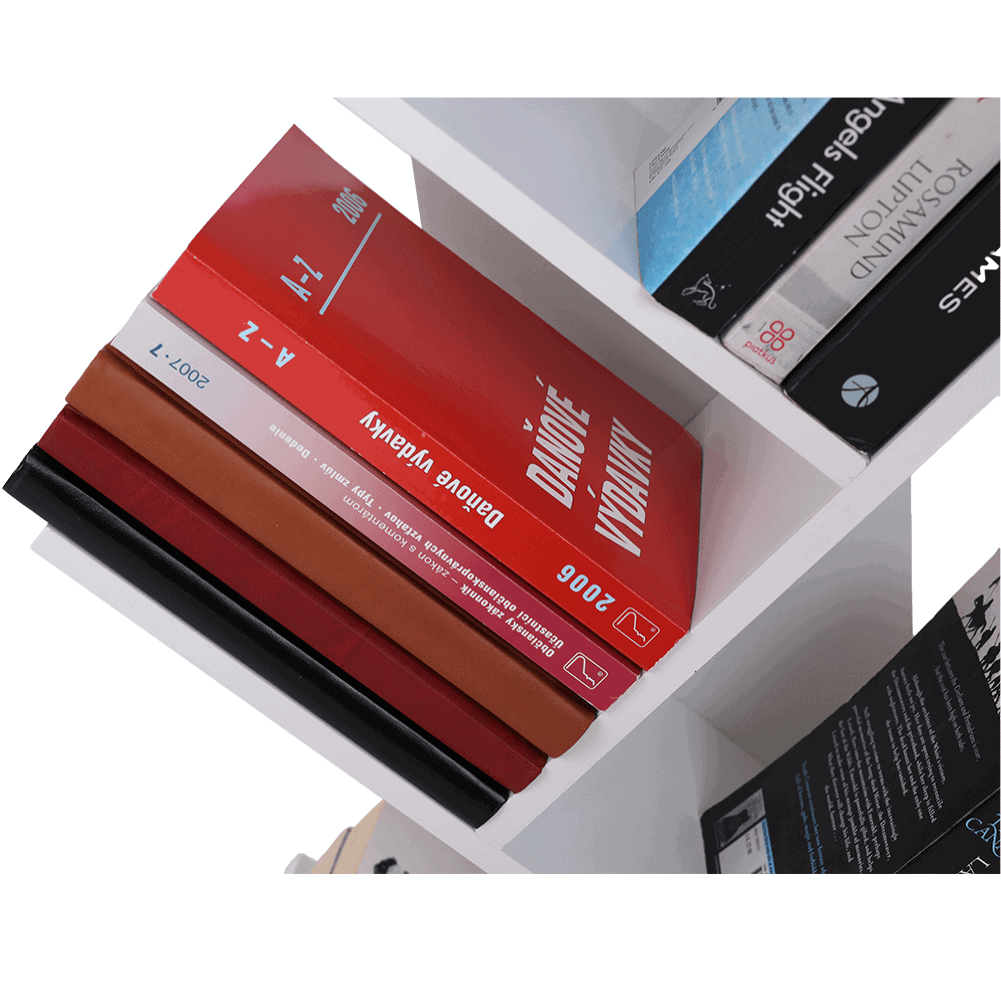 Raft multifuncţional de culoare albă care se poate folosi ca bibliotecă.