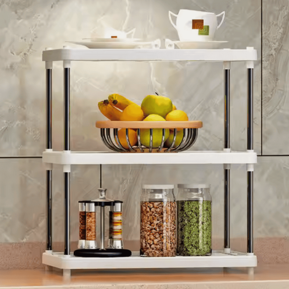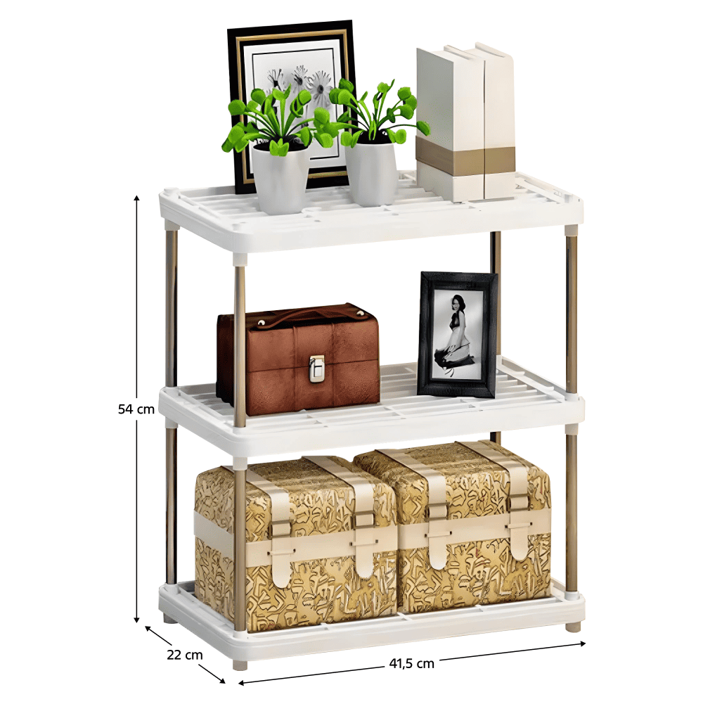 Material: plastic Culoare: albă / gri Dimensiuni (lxAxh): 41,5x22x54 cm Grosimea barei: 1,3 cm Trei zone de depozitare Portanţă: 4 kg Design modern Practic Multifuncţional Livrat dezasamblat