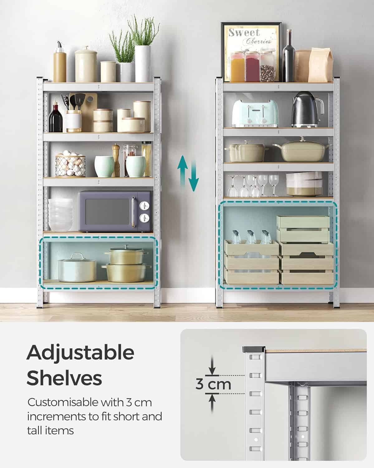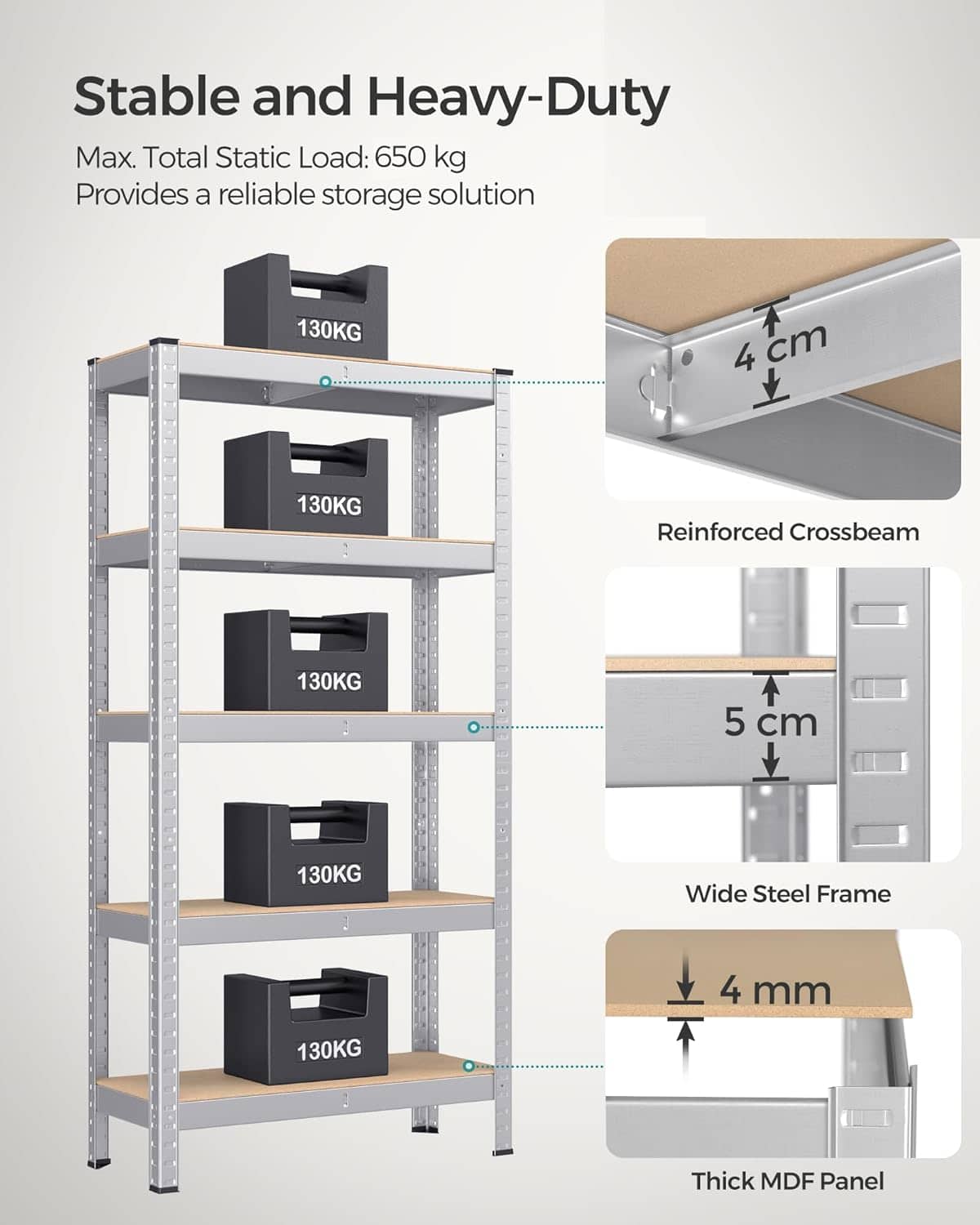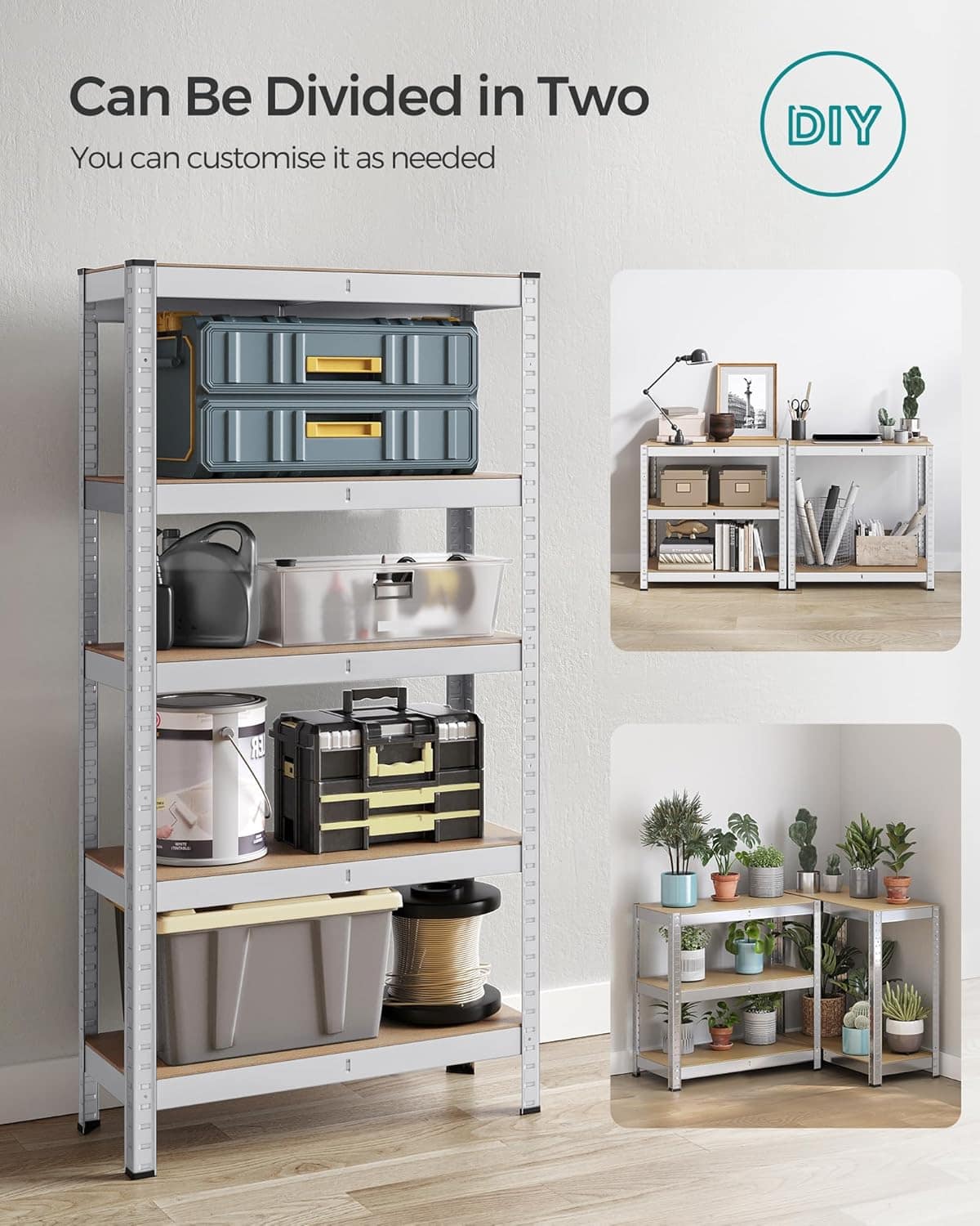 - Raftul metalic SONGMICS cu 5 niveluri este ideal pentru organizarea eficienta a spatiilor de depozitare. Constructia robusta din otel suporta greutati mari, iar rafturile reglabile permit adaptarea in functie de obiectele depozitate. Poate fi utilizat ca unitate unica sau impartit in doua pentru flexibilitate maxima. Caracteristici principale: