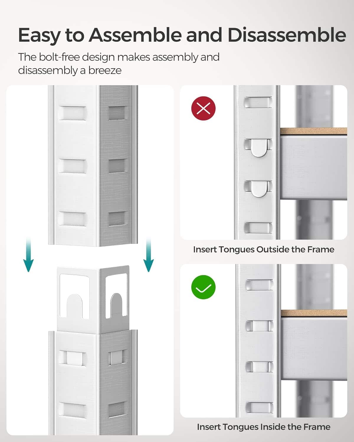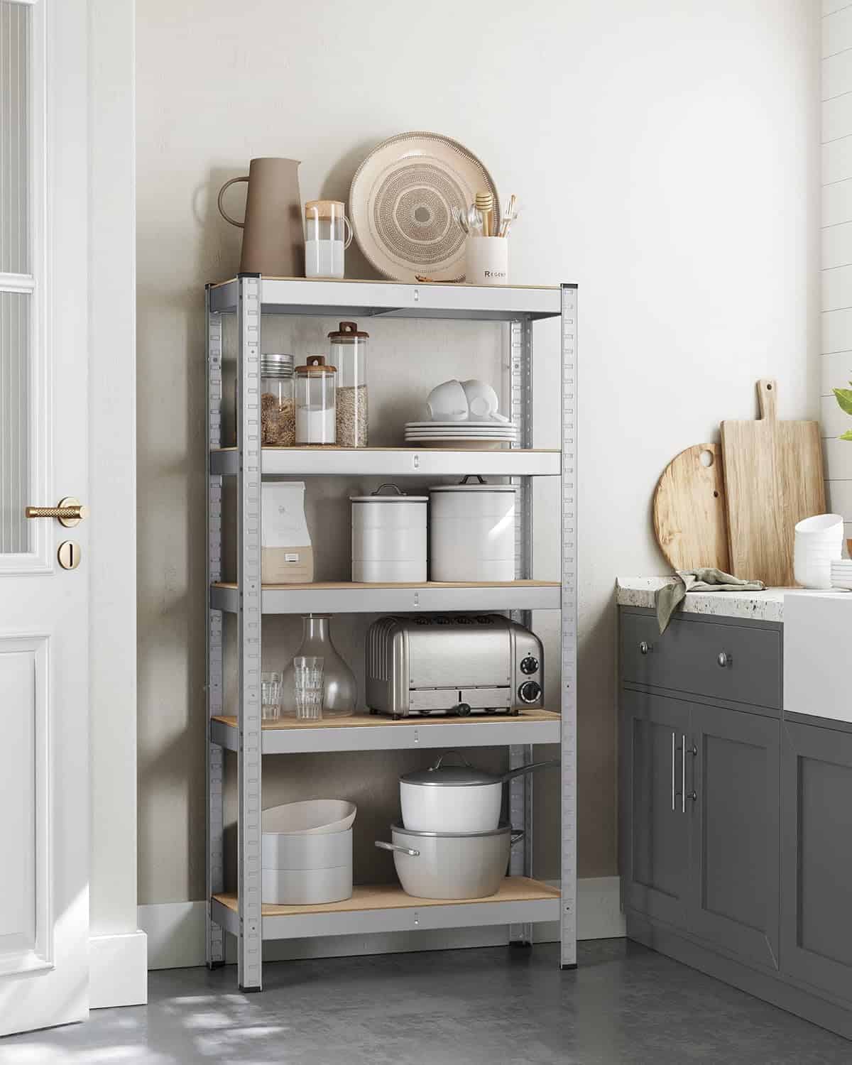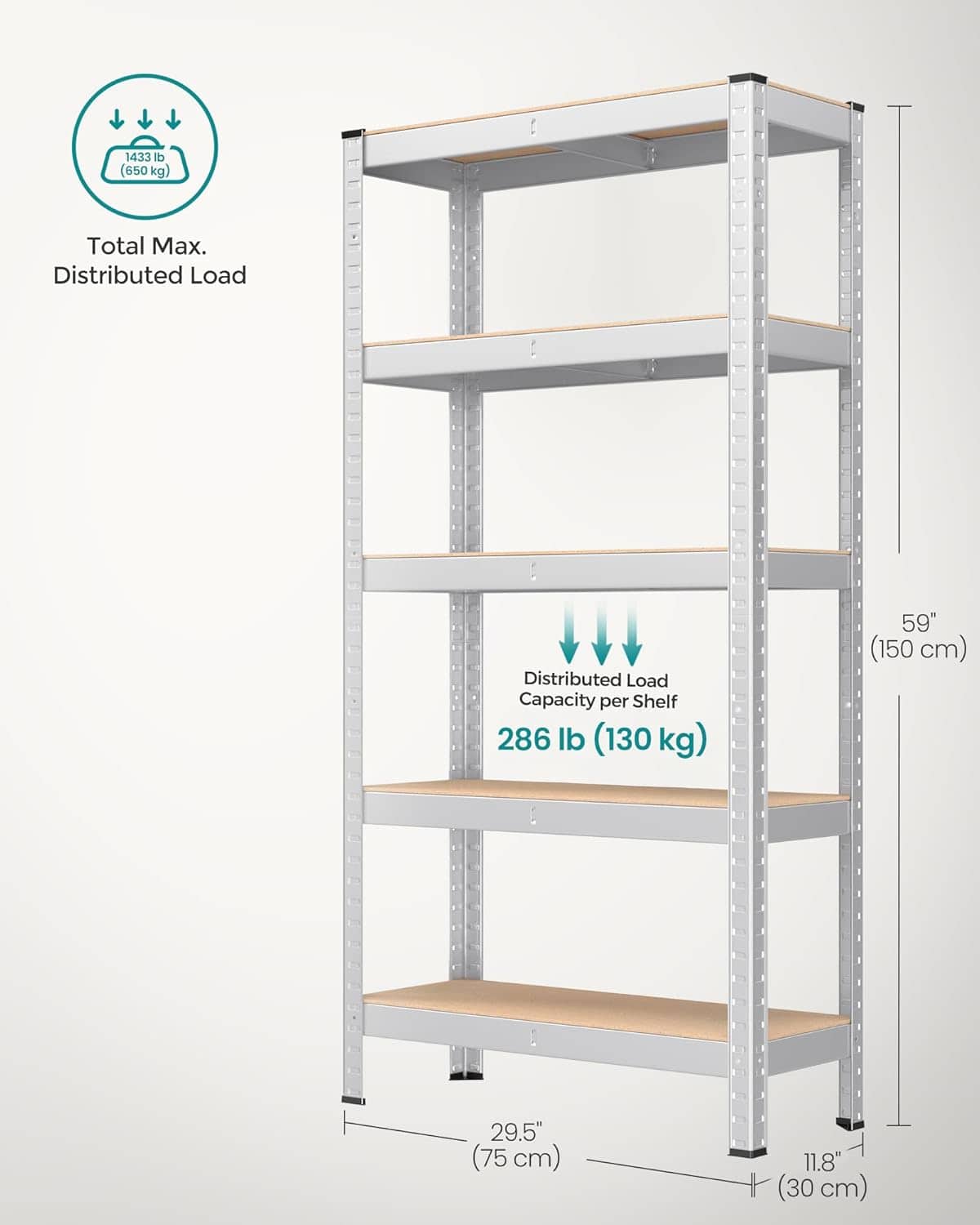 - Raftul metalic SONGMICS cu 5 niveluri este ideal pentru organizarea eficienta a spatiilor de depozitare. Constructia robusta din otel suporta greutati mari, iar rafturile reglabile permit adaptarea in functie de obiectele depozitate. Poate fi utilizat ca unitate unica sau impartit in doua pentru flexibilitate maxima. Caracteristici principale: