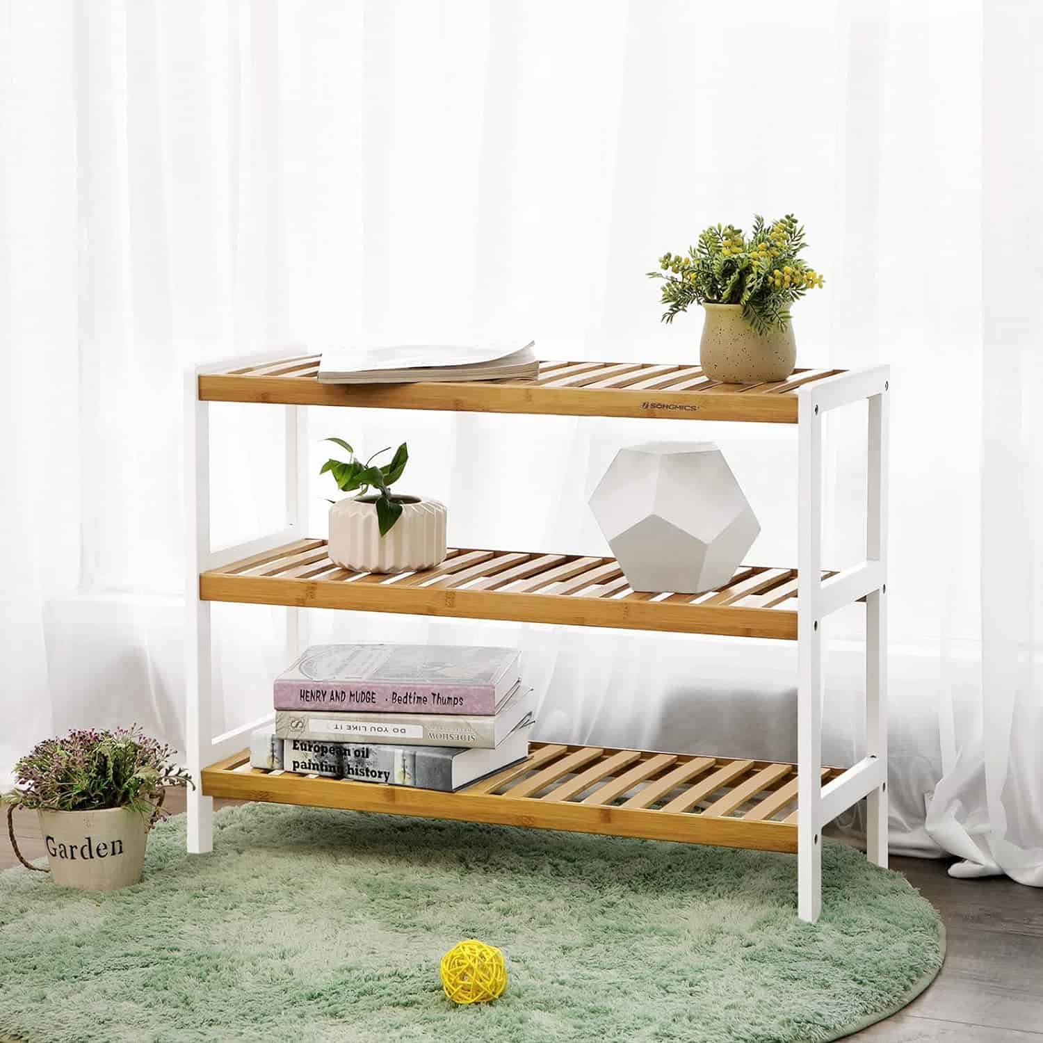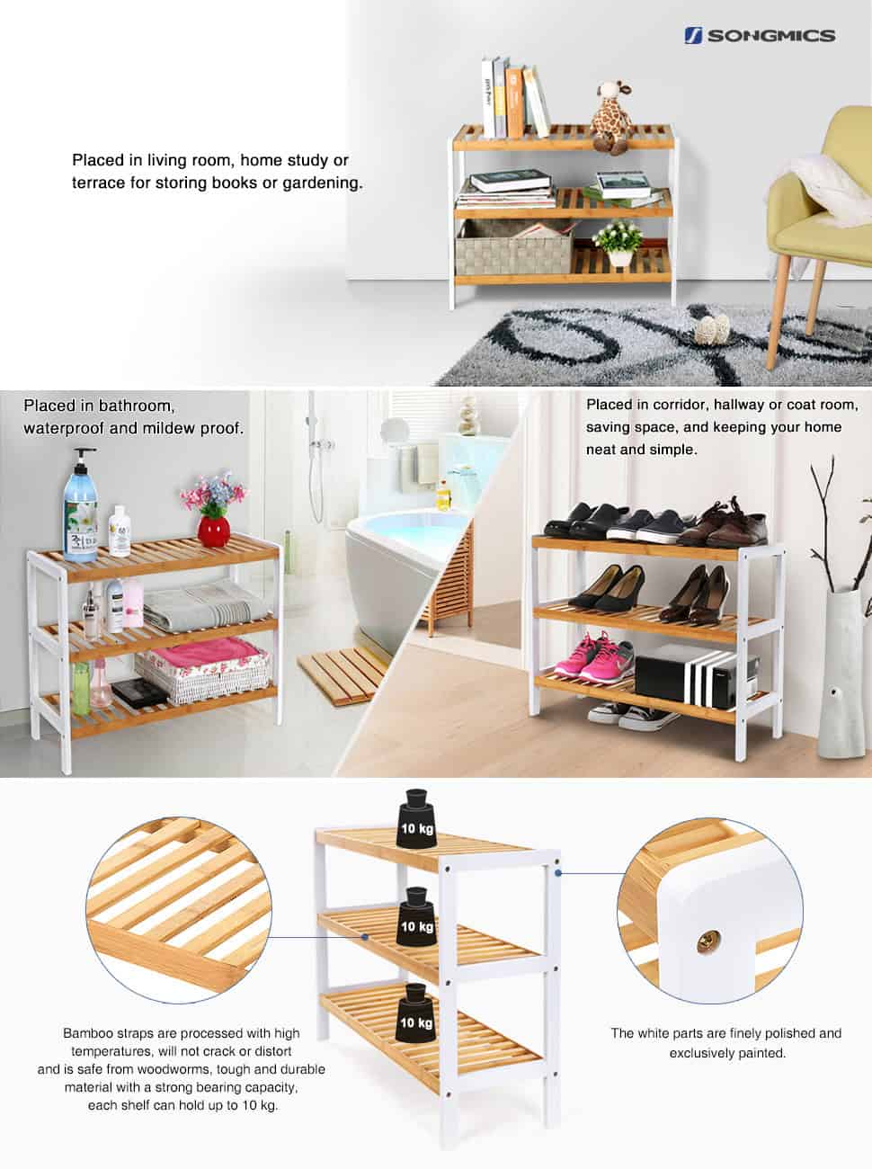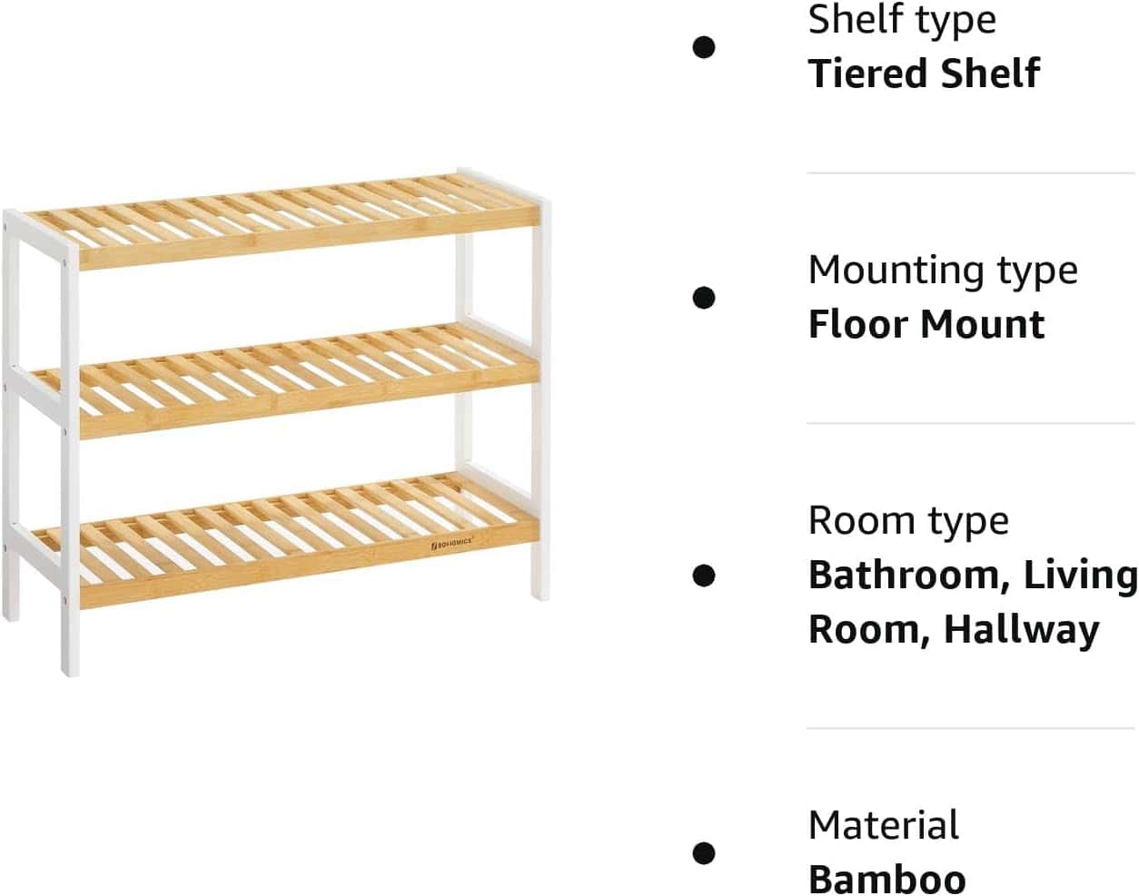 In schimb, organizeaza-le si depoziteaza-le in siguranta pe acest suport de pantofi cu 3 niveluri si nu-i vei vedea niciodata imprastiati in dimineata urmatoare.Acest suport pentru pantofi este realizat din bambus, care este natural, regenerabil si aduce o gura de aer proaspat in casa ta; este, de asemenea, durabil si puternic, oferind fiecarui raft o sarcina statica de 10 kg.Nu credeti ca acest raft este doar un suport pentru pantofi! Cu o dimensiune compacta de 26 x 70 x 55 cm, il puteti folosi ca suport pentru plante in sufragerie, ca organizator de depozitare in bucatarie sau ca o mini biblioteca in dormitorul dvs.Asamblarea nu a fost niciodata mai usoara! Pur si simplu conectati cele 3 rafturi la cele 2 rame laterale si, chiar asa, va organizati deja pantofii peUn suport pentru pantofi din bambus SONGMICS pe 3 niveluri iti tine incaltamintea sub control si te ajuta sa creezi un hol ingrijit.