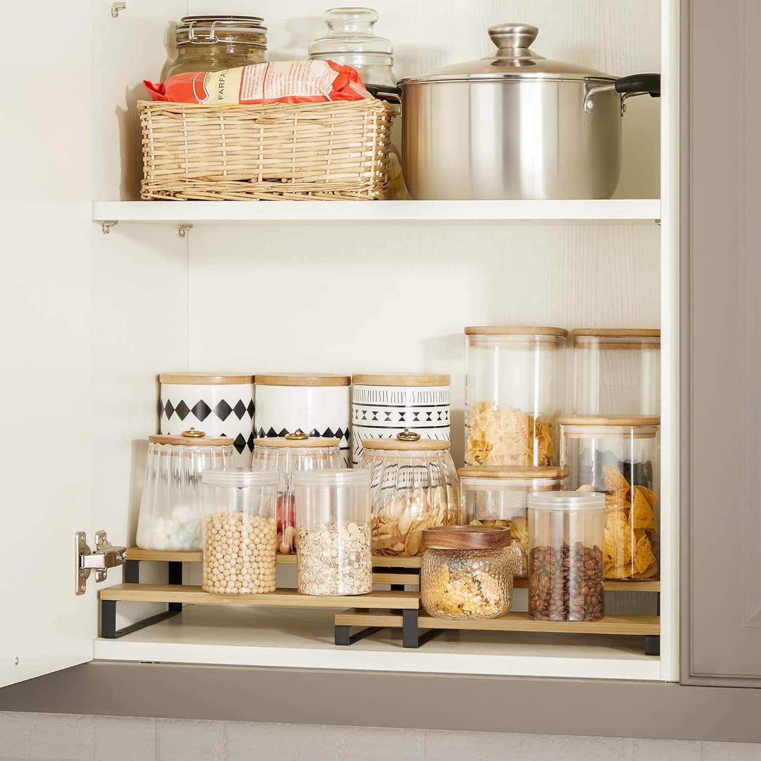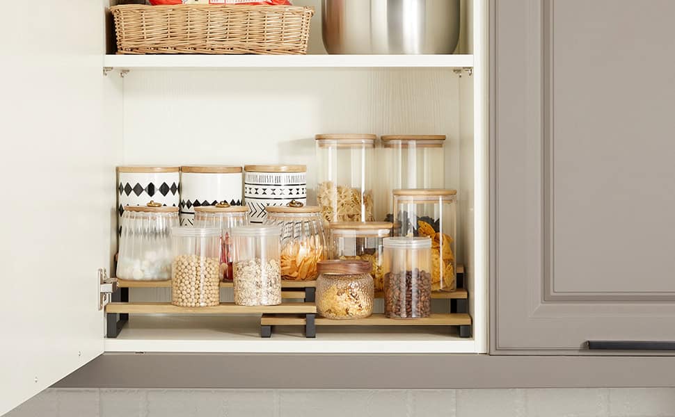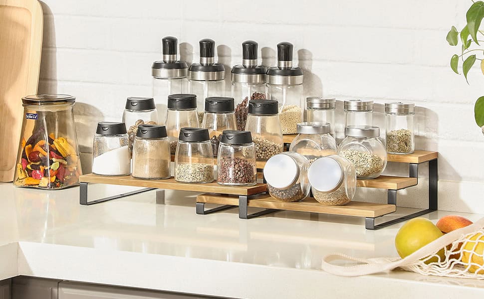 Specificatii: Culoare: Natural, Negru Material: Bambus, otel Dimensiunea raftului mare: 32 x 24,5 x 11,2 cm (L x l x i) Dimensiune raft mic: 32 x 24 x 9,5 cm (L x l x i) Greutatea produsului: 1,2 kg Max. Capacitate de incarcare statica a fiecarui nivel: 3 kg Despre acest articol Cu 6 nivele, va tine condimentele la indemana si ofera cu usurinta aspectul ordonat la care visati.Cu un design extensibil, este usor sa ajustati lungimea setului de organizare a condimentelor pentru a se potrivi cu diverse spatii sau sa il separati in 2 rafturi pentru locuri diferite – personalizati-va depozitarea si maximizati spatiul dvs.Acest suport pentru condimente ofera oportunitati pentru diverse sticle de condimente din bucataria dvs.Ce primesti: Un set de doua organizatoare de condimente, cu un cadru solid, un design stivuibil si extensibil, asamblare usoara si o modalitate simpla de a dubla sau chiar tripla spatiul de depozitare pentru mai multe sticle si cutii de conserve.